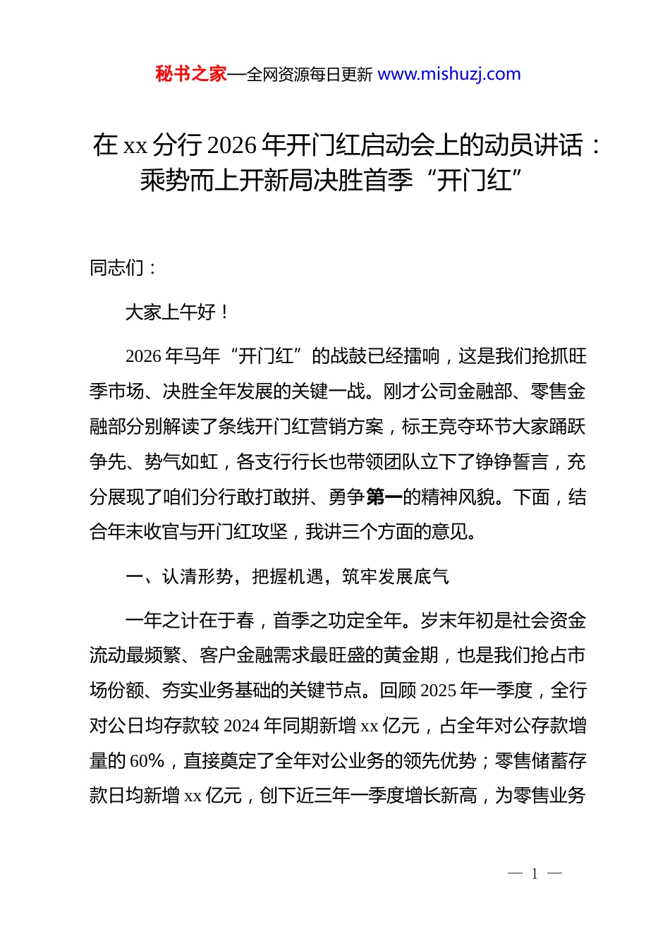 秘书之家—全网资源每日更新 www.mishuzj.com在 xx 分行 2026 年开门红启动会上的动员讲话:乘势而上开新局决胜首季“开门红”同志们:大家上午好!2026 年马年“开门红”的战鼓已经擂响,这是我们抢抓旺季市场、决胜全年发展的关键一战。刚才公司金融部、零售金融部分别解读了条线开门红营销方案,标王竞夺环节大家踊跃争先、势气如虹,各支行行长也带领团队立下了铮铮誓言,充分展现了咱们分行敢打敢拼、勇争第一的精神风貌。下面,结合年末收官与开门红攻坚,我讲三个方面的意见。一、认清形势,把握机遇,筑牢发展底气一年之计在于春,首季之功定全年。岁末年初是社会资金流动最频繁、客户金融需求最旺盛的黄金期,也是我们抢占市场份额、夯实业务基础的关键节点。回顾 2025 年一季度,全行对公日均存款较 2024 年同期新增 xx 亿元,占全年对公存款增量的 60%,直接奠定了全年对公业务的领先优势;零售储蓄存款日均新增 xx 亿元,创下近三年一季度增长新高,为零售业务— 1 —秘书之家—全网资源每日更新 www.mishuzj.com转型发展注入了强劲动力。从历年经营数据来看,一季度业务增长的质量,直接决定了全年指标完成的进度和难度。谁能在一季度抢先一步、拿下市场,谁就能在全年的竞争中占据主动。当前,地方经济复苏态势持续向好,小微企业经营活力回升,居民消费和理财需求逐步释放,这为我们开展开门红营销提供了广阔的市场空间。全行上下必须统一思想、提高站位,把开门红作为全年工作的“重头戏”,对公、零售条线协同发力,集中资源、集中精力,牢牢抓住旺季营销的窗口期,为 2026 年业务发展开好局、起好步。二、锚定目标,全员冲锋,营造攻坚氛围一是目标设定要跳起来摘桃。根据分行整体战略部署,本次开门红期间,全行对公日均存款计划新增 xx 亿元,储蓄存款日均新增 xx 亿元,中间业务收入力争突破 xx 万元。各支行要以分行目标为基准,结合自身实际制定更高的冲刺目标,不能满足于“完成任务”,要以高远目标激发团队斗志。同时,要把指标转化为具体的客户拓展和业务落地计划,明确每个客户的对接人、每个项目的推进时间,做到“目标到人、责任到岗、进度到天”,确保各项增长目标有支撑、能落地。— 2 —秘书之家—全网资源每日更新 www.mishuzj.com二是全员参与要拧成一股绳。开门红不是单一部门、个别支行的战斗,而是检验全行综合实力的“大考”,从前台营销到中后台保障,从管理层到基层员工,每个人都是攻坚力量。公司条线要聚焦重点企业、重大项目,加大对公存款和信贷投放力度;零售条线要深耕社区、商圈,做好储蓄存款、理财保险等产品营销;后台部门要强化服务支撑,简化业务流程、优化资源配置,确保一线作战“弹药充足”。全行要树立“一盘棋”思想,心往一处想、劲往一处使,形成上下联动、公私协同的营销合力。三是营销氛围要热起来火起来。要紧扣元旦、春节等节日节点,开展形式多样的营销活动,比如“新春理财节”“返乡客户专属福利”等,用接地气的活动吸引客户;要充分利用线上线下渠道,通过短视频、社群宣传、网点布置等方式,全方位展示我行产品优势和服务特色;要建立“日通报、周评比、月表彰”机制,及时公布各支行、各团队的业绩进度,对表现突出的集体和个人进行表彰,营造“比学赶超、争先进位”的浓厚氛围,让开门红真正“红”起来。三、压实责任,统筹推进,确保落地见效本次标王竞标环节,各支行根据自身实力积极竞投,展现— 3 —秘书之家—全网资源每日更新 www.mishuzj.com了担当和魄力。后续分行公司部、零售部要尽快将剩余指标分解到各支行,做到指标全覆盖、无遗漏。各支行行长要第一时间组织召开内部誓师会,把分行下达的指标层层分解到营销部、营业室,直至每一名员工,让每个人都清楚自己的任务和责任,形成“人人有指标、个个扛担子”的工作格局。开门红指标是全年指标的重要组成部分,更是撬动全年业务发展的“杠杆”,错过了一季度的黄金期,全年业务发展就会陷入被动。分行条线部门要切实履行指导职责,建立常态化的指标调度机制,每周分析各支行的进度差距,针对存款增长缓慢、客户...