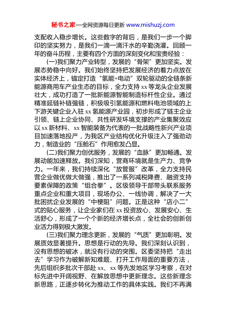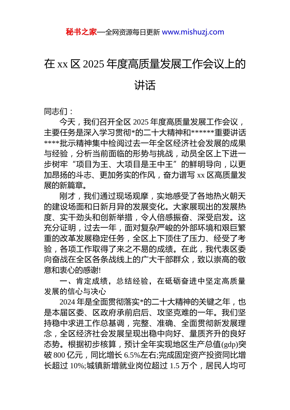 秘书之家—全网资源每日更新 www.mishuzj.com在 xx 区 2025 年度高质量发展工作会议上的讲话同志们:今天,我们召开全区 2025 年度高质量发展工作会议,主要任务是深入学习贯彻*的二十大精神和******重要讲话****批示精神集中检阅过去一年全区经济社会发展的成果与经验,分析当前面临的形势与挑战,动员全区上下进一步树牢“项目为王、大项目是王中王”的鲜明导向,以更加昂扬的斗志、更加务实的作风,奋力谱写 xx 区高质量发展的新篇章。刚才,我们通过现场观摩,实地感受了各地热火朝天的建设场面和日新月异的发展变化。大家展现出的发展热度、实干劲头和创新举措,令人倍感振奋、深受启发。这充分证明,过去一年,面对复杂严峻的外部环境和艰巨繁重的改革发展稳定任务,全区上下顶住了压力、经受了考验,各项工作取得了来之不易的成绩。在此,我代表区委向奋战在全区各条战线上的广大干部群众,致以崇高的敬意和衷心的感谢!一、肯定成绩,总结经验,在砥砺奋进中坚定高质量发展的信心与决心2024 年是全面贯彻落实*的二十大精神的关键之年,也是本届区委、区政府承前启后、攻坚克难的一年。我们坚持稳中求进工作总基调,完整、准确、全面贯彻新发展理念,全区经济社会发展呈现出稳中向好、量质齐升的良好态势。根据初步核算,预计全年实现地区生产总值(gdp)突破 800 亿元,同比增长 6.5%左右;完成固定资产投资同比增长超过 10%;城镇新增就业岗位超过 1.5 万个,居民人均可秘书之家—全网资源每日更新 www.mishuzj.com支配收入稳步增长。这些数字的背后,是我们一步一个脚印的坚实努力,是我们一滴一滴汗水的辛勤浇灌。回顾一年的奋斗历程,主要有四个方面的深刻变化和宝贵经验:(一)我们聚力产业转型,发展的“骨架”更加坚实。发展态势稳中向好。我们始终坚持把发展经济的着力点放在实体经济上,锚定打造“氢能+电动”双轮驱动的全链条新能源商用车产业生态的目标,全力支持 xx 等龙头企业发展壮大,成功打造了一批新能源智能制造标杆性企业。通过精准延链补链强链,积极吸引氢能源和燃料电池领域的上下游关键企业入驻 xx 氢能源产业园,初步形成了链主企业引领、链上企业协同、共性研发环境支撑的产业集聚效应以 xx 新材料、xx 智能装备为代表的一批战略性新兴产业项目加速落地投产,为我区产业结构优化升级注入了强劲动力,制造业的“压舱石”作用愈发凸显。(二)我们聚力创优服务,发展的“血脉”更加畅通。发展动能加速释放。我们深知,营商环境就是生产力、竞争力。一年来,我们持续深化“放管服”改革,全力支持民营企业做优做大做强,推出了一系列减税降费、融资支持要素保障的政策“组合拳”。区级领导干部带头联系服务重点企业和重大项目,现场办公、一线协调,解决了一大批困扰企业发展的“中梗阻”问题。正是这种“店小二”式的贴心服务,让企业家们在 xx 投资放心、发展安心、生活舒心,形成了一个个新的经济增长点,全社会的创新创业活力得到极大激发。(三)我们聚力理念更新,发展的“气质”更加彰明。发展质效显著提升。思想是行动的先导。我们深刻认识到,没有思想的破冰,就没有行动的突围。区委坚持把“走出去”学习作为破解新知难题、打开工作局面的重要方法,先后组织多批次干部赴 xx、xx 等先发地区学习考察,在对标先进中开阔视野、在解放思想中更新理念。这些新理念新思路,正逐步转化为推动工作的具体实践。我们不再满秘书之家—全网资源每日更新 www.mishuzj.com足于传统的乡村建设模式,而是积极探索农文旅融合发展新路径,一批设计新颖、功能复合的“乡村会客厅”在田间地头拔地而起;我们不再局限于单一的景点打造,而是着眼于全域旅游布局,一批融合了生态、文化、康养元素的“旅游新地标”相继落地建成,成为市民周末休闲和外地游客打卡的“网红地”。这些变化,标志着我区的发展正从量的积累向量质并举转变。(四)我们聚力基层治理,发展的“底色”更加温暖。发展温度更加彰显。发展的最终目的是为了人民。我们始终聚焦人民群众最关心、最直接、最现实的利益问题,用心用情办好民生实事。持续实施道路交通基础设施“三...