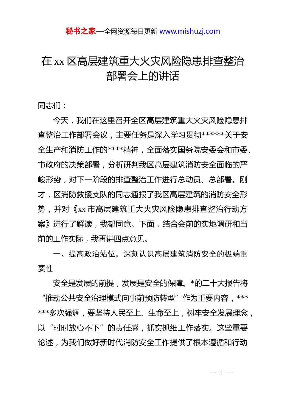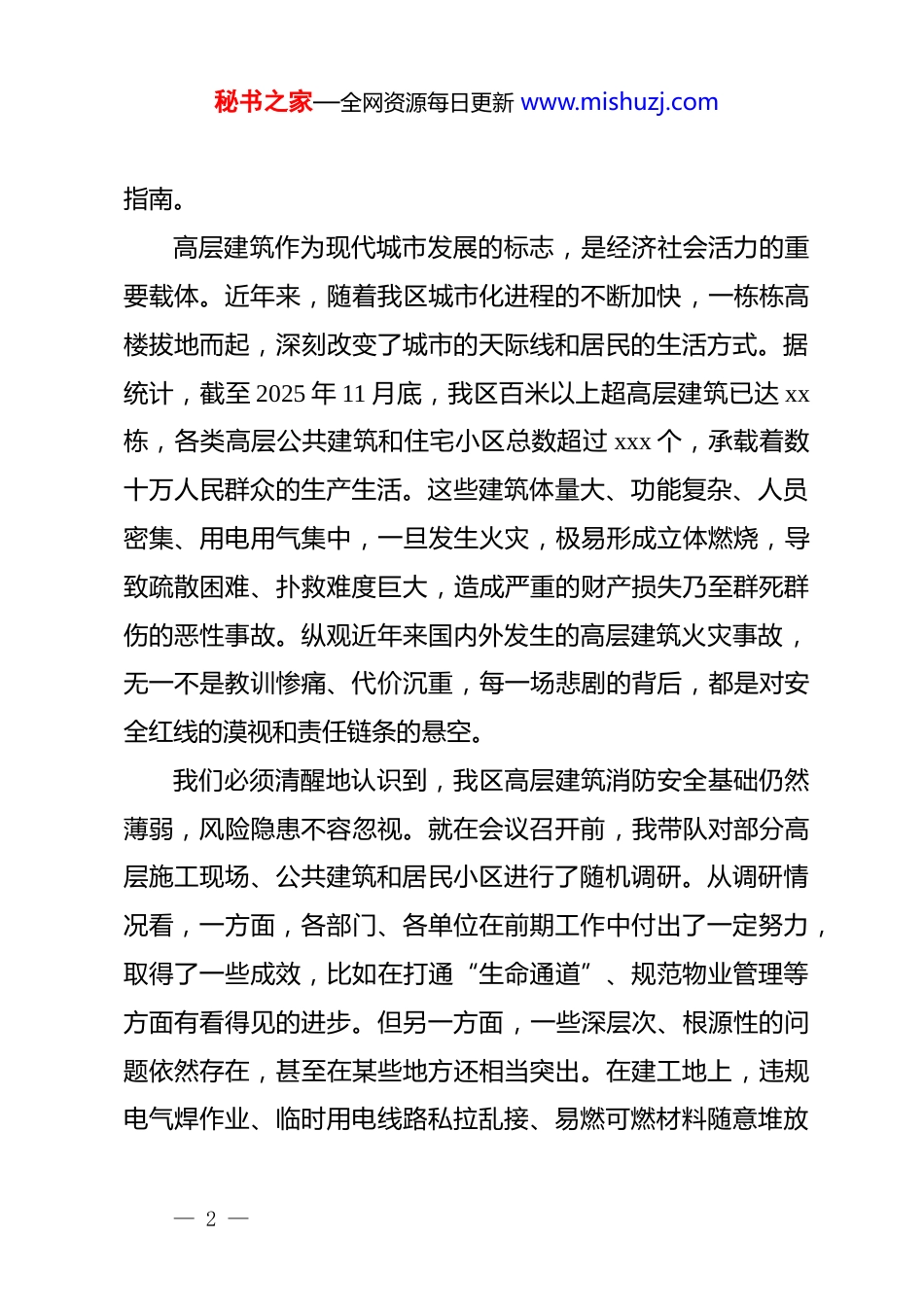 秘书之家—全网资源每日更新 www.mishuzj.com在 xx 区高层建筑重大火灾风险隐患排查整治部署会上的讲话同志们:今天,我们在这里召开全区高层建筑重大火灾风险隐患排查整治工作部署会议,主要任务是深入学习贯彻******关于安全生产和消防工作的****精神,全面落实国务院安委会和市委、市政府的决策部署,分析研判我区高层建筑消防安全面临的严峻形势,对下一阶段的排查整治工作进行总动员、总部署。刚才,区消防救援支队的同志通报了我区高层建筑的消防安全形势,并对《xx 市高层建筑重大火灾风险隐患排查整治行动方案》进行了解读,我都同意。下面,结合会前的实地调研和当前的工作实际,我再讲四点意见。一、提高政治站位,深刻认识高层建筑消防安全的极端重要性安全是发展的前提,发展是安全的保障。*的二十大报告将“推动公共安全治理模式向事前预防转型”作为重要内容,******多次强调,要坚持人民至上、生命至上,树牢安全发展理念,以“时时放心不下”的责任感,抓实抓细工作落实。这些重要论述,为我们做好新时代消防安全工作提供了根本遵循和行动— 1 —秘书之家—全网资源每日更新 www.mishuzj.com指南。高层建筑作为现代城市发展的标志,是经济社会活力的重要载体。近年来,随着我区城市化进程的不断加快,一栋栋高楼拔地而起,深刻改变了城市的天际线和居民的生活方式。据统计,截至 2025 年 11 月底,我区百米以上超高层建筑已达 xx栋,各类高层公共建筑和住宅小区总数超过 xxx 个,承载着数十万人民群众的生产生活。这些建筑体量大、功能复杂、人员密集、用电用气集中,一旦发生火灾,极易形成立体燃烧,导致疏散困难、扑救难度巨大,造成严重的财产损失乃至群死群伤的恶性事故。纵观近年来国内外发生的高层建筑火灾事故,无一不是教训惨痛、代价沉重,每一场悲剧的背后,都是对安全红线的漠视和责任链条的悬空。我们必须清醒地认识到,我区高层建筑消防安全基础仍然薄弱,风险隐患不容忽视。就在会议召开前,我带队对部分高层施工现场、公共建筑和居民小区进行了随机调研。从调研情况看,一方面,各部门、各单位在前期工作中付出了一定努力,取得了一些成效,比如在打通“生命通道”、规范物业管理等方面有看得见的进步。但另一方面,一些深层次、根源性的问题依然存在,甚至在某些地方还相当突出。在建工地上,违规电气焊作业、临时用电线路私拉乱接、易燃可燃材料随意堆放— 2 —秘书之家—全网资源每日更新 www.mishuzj.com的现象屡见不鲜;在一些投入使用的公共建筑里,防火门常开、消防设施损坏停用、疏散指示标志不清的问题依然存在;在部分老旧高层住宅小区,电动自行车“飞线充电”、违规停放入户、楼道内堆放杂物堵塞安全出口的问题积重难返。这些问题,就像一颗颗埋在我们身边的“定时炸弹”,随时可能引爆。当前已进入 2025 年冬季,天干物燥,用火用电量剧增,历来是火灾事故的高发期。面对严峻复杂的形势,全区上下必须把思想和行动统一到中央和市委、市政府的决策部署上来,将此次高层建筑火灾风险隐患排查整治,作为一项严肃的政治任务和重大的民生工程来抓。这不仅是对我们治理能力和治理水平的重大考验,更是对我们是否真正践行“人民至上、生命至上”理念的直接检验。各单位、各部门的负责同志,必须坚决克服麻痹思想、侥幸心理和松劲心态,以最高的标准、最严的要求、最实的举措,坚决扛起防范化解重大安全风险的政治责任,全力以赴守护好人民群众的生命财产安全。二、压实层级责任,构建齐抓共管协同高效的治理新格局消防安全工作从来都不是哪一个部门的“独角戏”,而是一场需要全社会共同参与的“合奏曲”。高层建筑消防安全治理的复杂性、系统性,决定了我们必须建立健全“*政同责、一岗双责、齐抓共管、失职追责”的责任体系,形成分工明确、— 3 —秘书之家—全网资源每日更新 www.mishuzj.com协同高效的工作合力。一是要明确并压实政府属地领导责任。各街道、镇要切实承担起属地管理的兜底责任,主要负责同志作为本辖区消防安全的第一责任人,要亲自研究、亲自部署、亲自督办。要迅速组织力量,对辖区内所有高层建...