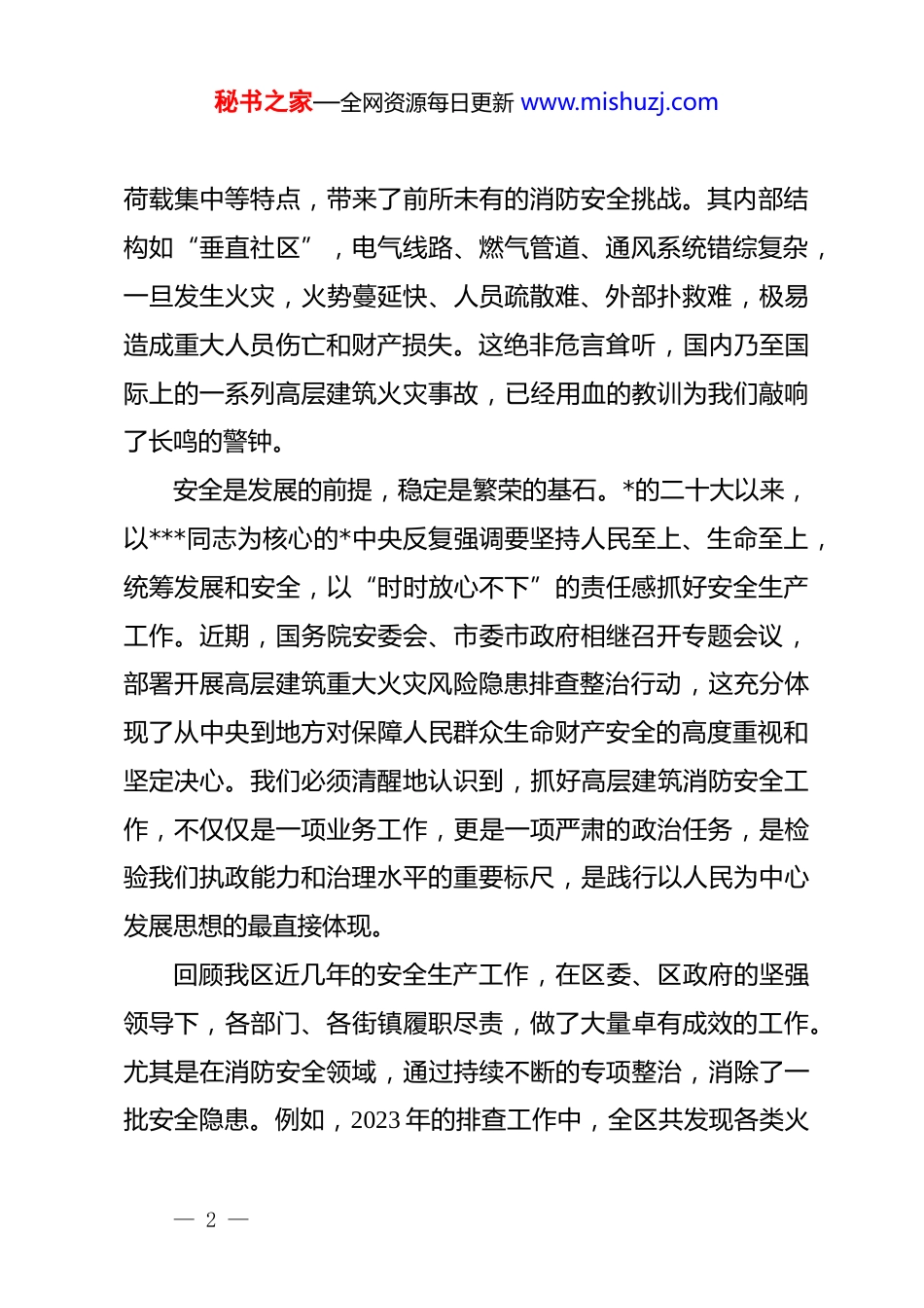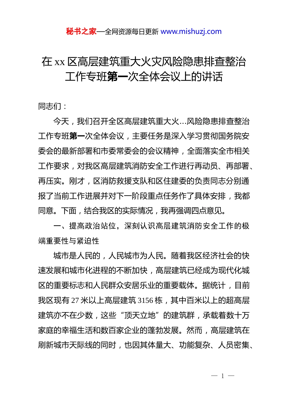 秘书之家—全网资源每日更新 www.mishuzj.com在 xx 区高层建筑重大火灾风险隐患排查整治工作专班第一次全体会议上的讲话同志们:今天,我们召开全区高层建筑重大火...风险隐患排查整治工作专班第一次全体会议,主要任务是深入学习贯彻国务院安委会的最新部署和市委常委会的会议精神,全面落实全市相关工作要求,对我区高层建筑消防安全工作进行再动员、再部署、再压实。刚才,区消防救援支队和区住建委的负责同志分别通报了当前工作进展并对下一阶段重点任务作了具体安排,我都同意。下面,结合我区的实际情况,我再强调四点意见。一、提高政治站位,深刻认识高层建筑消防安全工作的极端重要性与紧迫性城市是人民的,人民城市为人民。随着我区经济社会的快速发展和城市化进程的不断加快,高层建筑已经成为现代化城区的重要标志和人民群众安居乐业的重要载体。据统计,目前我区现有 27 米以上高层建筑 3156 栋,其中百米以上的超高层建筑亦不在少数,这些“顶天立地”的建筑群,承载着数十万家庭的幸福生活和数百家企业的蓬勃发展。然而,高层建筑在刷新城市天际线的同时,也因其体量大、功能复杂、人员密集、— 1 —秘书之家—全网资源每日更新 www.mishuzj.com荷载集中等特点,带来了前所未有的消防安全挑战。其内部结构如“垂直社区”,电气线路、燃气管道、通风系统错综复杂,一旦发生火灾,火势蔓延快、人员疏散难、外部扑救难,极易造成重大人员伤亡和财产损失。这绝非危言耸听,国内乃至国际上的一系列高层建筑火灾事故,已经用血的教训为我们敲响了长鸣的警钟。安全是发展的前提,稳定是繁荣的基石。*的二十大以来,以***同志为核心的*中央反复强调要坚持人民至上、生命至上,统筹发展和安全,以“时时放心不下”的责任感抓好安全生产工作。近期,国务院安委会、市委市政府相继召开专题会议,部署开展高层建筑重大火灾风险隐患排查整治行动,这充分体现了从中央到地方对保障人民群众生命财产安全的高度重视和坚定决心。我们必须清醒地认识到,抓好高层建筑消防安全工作,不仅仅是一项业务工作,更是一项严肃的政治任务,是检验我们执政能力和治理水平的重要标尺,是践行以人民为中心发展思想的最直接体现。回顾我区近几年的安全生产工作,在区委、区政府的坚强领导下,各部门、各街镇履职尽责,做了大量卓有成效的工作。尤其是在消防安全领域,通过持续不断的专项整治,消除了一批安全隐患。例如,2023 年的排查工作中,全区共发现各类火— 2 —秘书之家—全网资源每日更新 www.mishuzj.com灾隐患 2727 处,督促整改 2610 处,整改率达到了 95.7%。但是,我们也必须正视问题,对照上级的严格要求和人民群众的殷切期盼,我们的工作仍存在一些不容忽视的短板和弱项。一些老旧高层建筑消防设施老化、维护不力的问题依然突出;部分物业服务企业主体责任落实不到位,日常巡查检查流于形式;个别居民安全意识淡薄,占用堵塞消防通道、电动自行车违规停放充电等“顽疾”屡禁不止;跨部门、跨领域的协同治理机制仍需进一步健全。这些问题,如同悬在我们头顶的“达摩克利斯之剑”,稍有不慎,就可能引发难以挽回的后果。因此,成立工作专班,集中力量打一场攻坚战、歼灭战,势在必行,刻不容缓。全区上下必须立即把思想和行动统一到中央和市委的决策部署上来,以最高的标准、最严的要求、最实的举措,坚决扛起防范化解高层建筑重大安全风险的政治责任。二、坚持问题导向,聚焦关键环节,以精准施策推进隐患排查整治走深走实开展排查整治,不能搞“大水漫灌”,更不能搞形式主义。要坚持问题导向、目标导向、结果导向,拿出“绣花”功夫,下足“穿石”之力,确保每一栋建筑、每一个环节都排查到位、整治彻底。首先,要实现排查的全域覆盖与深度穿透。此次排查整治— 3 —秘书之家—全网资源每日更新 www.mishuzj.com行动,范围必须覆盖全区所有高层公共建筑和高层住宅小区,做到无一遗漏。各镇街、开发区要切实担负起属地责任,发动网格员、社区工作者、物业人员、志愿者等多方力量,开展地毯式、拉网式排查。不仅要查建筑外部的消防车通道、消防水源,更要深入...