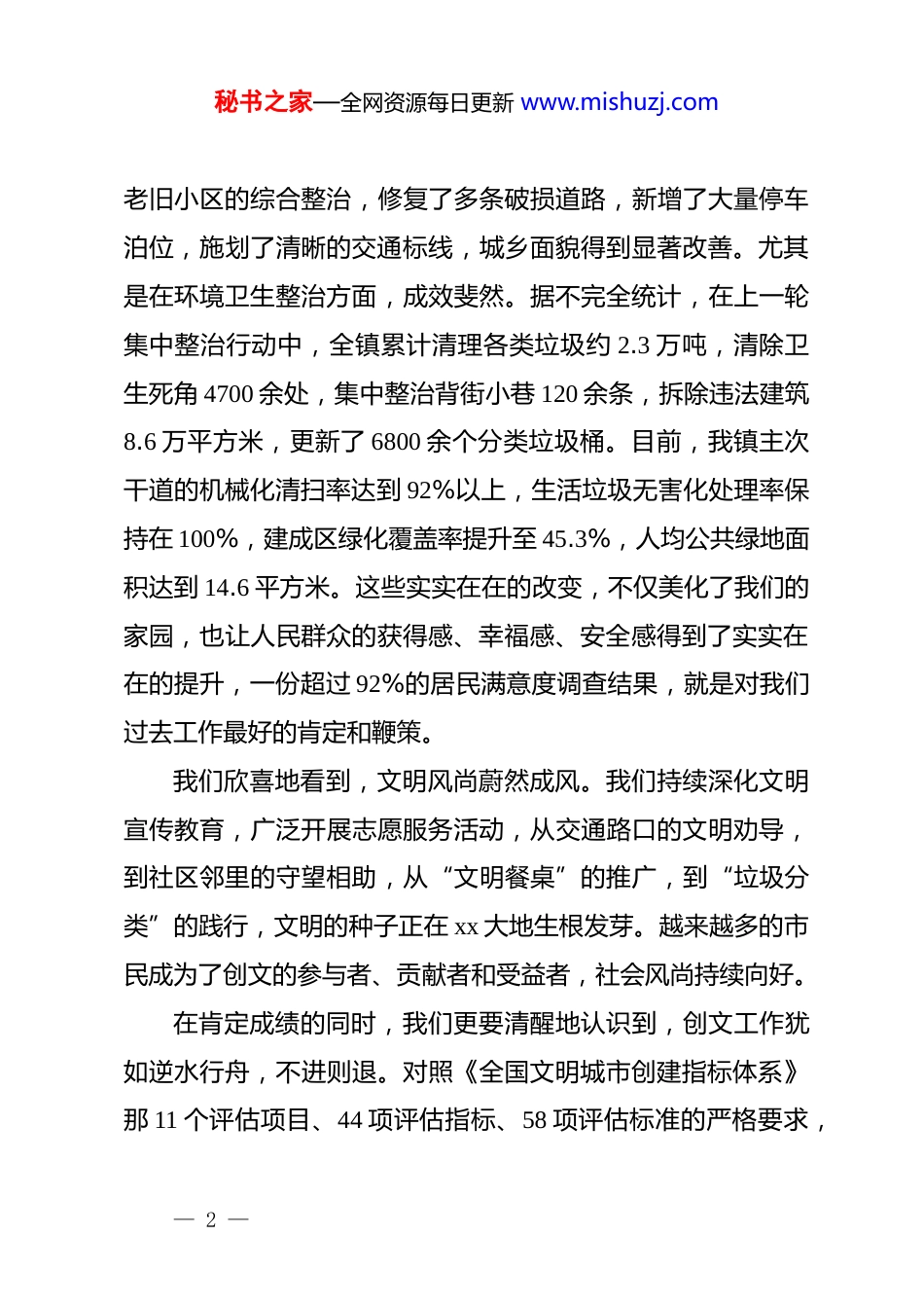秘书之家—全网资源每日更新 www.mishuzj.com在 xx 镇迎接创建全国文明城市技术评估工作部署会上的讲话(精品)同志们:今天,我们在这里召开迎接创建全国文明城市技术评估工作部署会,主要任务是深入贯彻落实市委、市政府关于创建全国文明城市的决策部署,全面分析当前我镇创文工作面临的形势,对即将到来的全国文明城市技术评估迎检工作进行再动员、再部署、再落实。刚才,会议已经传达了上级关于迎检工作的最新指示精神,并对《全国文明城市创建指标体系》进行了详细解读,相关单位也作了表态发言。大家的发言态度坚决、措施具体,体现了打赢这场攻坚战的坚定决心。下面,我讲三点意见。一、肯定成绩、正视差距,切实增强创文工作的责任感和紧迫感自全市启动创文工作以来,全镇上下闻令而动、尽锐出战,广大干部群众积极响应、踊跃参与,我们投入了大量的人力、物力、财力,推动创文工作取得了显著的阶段性成效。我们欣喜地看到,城镇面貌焕然一新。经过近几年的不懈努力,我镇的基础设施建设得到了长足发展。我们完成了一批— 1 —秘书之家—全网资源每日更新 www.mishuzj.com老旧小区的综合整治,修复了多条破损道路,新增了大量停车泊位,施划了清晰的交通标线,城乡面貌得到显著改善。尤其是在环境卫生整治方面,成效斐然。据不完全统计,在上一轮集中整治行动中,全镇累计清理各类垃圾约 2.3 万吨,清除卫生死角 4700 余处,集中整治背街小巷 120 余条,拆除违法建筑8.6 万平方米,更新了 6800 余个分类垃圾桶。目前,我镇主次干道的机械化清扫率达到 92%以上,生活垃圾无害化处理率保持在 100%,建成区绿化覆盖率提升至 45.3%,人均公共绿地面积达到 14.6 平方米。这些实实在在的改变,不仅美化了我们的家园,也让人民群众的获得感、幸福感、安全感得到了实实在在的提升,一份超过 92%的居民满意度调查结果,就是对我们过去工作最好的肯定和鞭策。我们欣喜地看到,文明风尚蔚然成风。我们持续深化文明宣传教育,广泛开展志愿服务活动,从交通路口的文明劝导,到社区邻里的守望相助,从“文明餐桌”的推广,到“垃圾分类”的践行,文明的种子正在 xx 大地生根发芽。越来越多的市民成为了创文的参与者、贡献者和受益者,社会风尚持续向好。在肯定成绩的同时,我们更要清醒地认识到,创文工作犹如逆水行舟,不进则退。对照《全国文明城市创建指标体系》那 11 个评估项目、44 项评估指标、58 项评估标准的严格要求,— 2 —秘书之家—全网资源每日更新 www.mishuzj.com对照人民群众对美好生活的新期盼,我们的工作还存在不少亟待补齐的短板和不容忽视的弱项。一是城市精细化管理水平仍有待提升。“重建设、轻管理”的现象在一定程度上仍然存在。一些基础设施建起来了,但后续的维护管理没有及时跟上,导致路面破损、设施损坏、绿化缺失等问题时有发生。特别是在背街小巷、农贸市场、老旧小区、城乡结合部等重点区域,环境卫生问题容易反弹,占道经营、乱停乱放、乱贴乱画等“城市顽疾”屡禁不止。这充分说明,我们的常态化、长效化管理机制还不够健全,管理的触角还没有延伸到每一个“神经末梢”。二是市民文明素养仍有提升空间。闯红灯、逆行、乱扔垃圾、随地吐痰、公共场所吸烟等不文明行为依然存在。部分群众对创文工作的知晓率、支持率和参与度还不够高,还没有完全形成“人人关心创文、人人支持创文、人人参与创文”的浓厚社会氛围。“创建为民、创建惠民”的理念还没有真正深入到每一个市民心中,主人翁意识有待进一步激发。三是部分工作落实仍存在“温差”和“落差”。从刚才的通报和我们日常督查的情况来看,个别单位、个别干部还存在思想认识不到位、责任落实不到位、工作标准不高等问题。有的存在松懈麻痹思想,认为创文是“一阵风”,检查过了就万— 3 —秘书之家—全网资源每日更新 www.mishuzj.com事大吉;有的存在畏难发愁情绪,面对难点问题绕道走,不敢动真碰硬;有的工作作风不实,满足于“开了会、发了文”,但在抓落实、求实效上下的功夫不够。这些问题,虽然只发生在少数单位和个人身上,但其负面影响不容小觑,是我们...