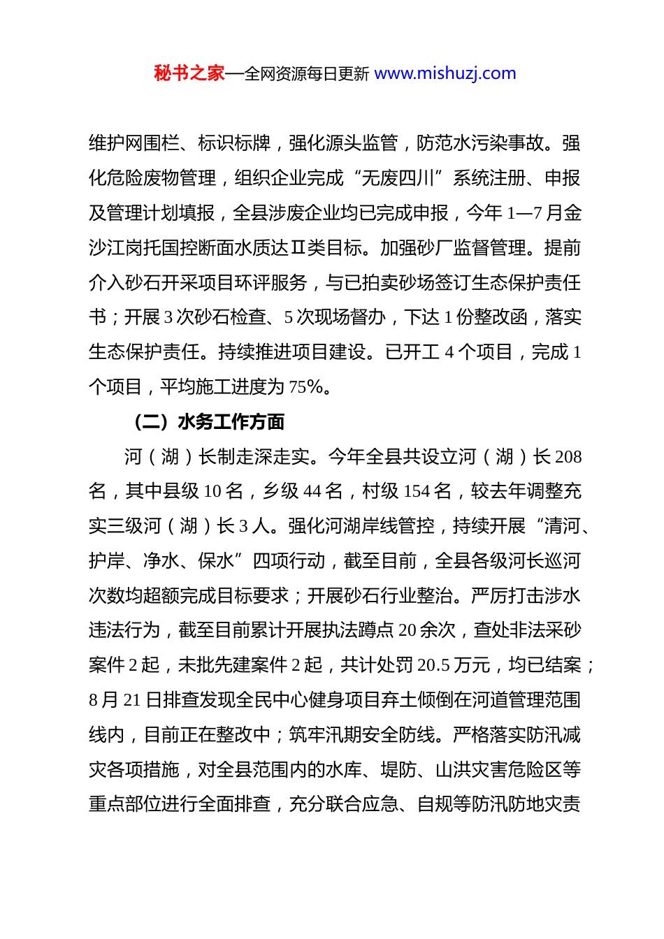 秘书之家—全网资源每日更新 www.mishuzj.com在德格县人民政府全体会议暨安委会上的讲话按照会议安排,现对分管领域 2025 年前三季度工作情况进行工作点评,并对第四季度重点工作进行安排部署。一、前三季度工作完成情况(一)生态环境方面加力推进生态督察问题整改。我县涉及各级环保督察问题29 个,已完成 15 个。其中央督信访件 2 起,文都件正在补办用地手续,茶马上街件已完成违建查处工作并推动手续办理。省督 8 个问题完成 4 个,州督 19 个问题已完成 11 个,剩余问题正在加力推进整改。开展环境执法检查 69 次,出动人员 138 人次,督促整改环境问题 15 个,立案调查环境违法行为 3 个。坚决打好蓝天、碧水、净土保卫战。严格落实“六必须、六不准”管控要求,加强县城涉气污染治理,重点监管建筑工地扬尘、非道路移动污染源。针对县城餐饮油烟,联合住建、市场监管部门对餐饮及烧烤店 28 家,开展全覆盖例行检查;对县城周边施工项目及 X092 线项目开展 6 次涉气检查,现场整改 5 起问题,下达 2 份整改函。今年县域空气质量在全省 128 个县(市、区)排名第八、全州第三。针对金沙江水质变化,与江达县联合排查治理,对发现问题进行治理,不定期巡查饮用水源地,秘书之家—全网资源每日更新 www.mishuzj.com维护网围栏、标识标牌,强化源头监管,防范水污染事故。强化危险废物管理,组织企业完成“无废四川”系统注册、申报及管理计划填报,全县涉废企业均已完成申报,今年 1—7 月金沙江岗托国控断面水质达Ⅱ类目标。加强砂厂监督管理。提前介入砂石开采项目环评服务,与已拍卖砂场签订生态保护责任书;开展 3 次砂石检查、5 次现场督办,下达 1 份整改函,落实生态保护责任。持续推进项目建设。已开工 4 个项目,完成 1个项目,平均施工进度为 75%。(二)水务工作方面河(湖)长制走深走实。今年全县共设立河(湖)长 208名,其中县级 10 名,乡级 44 名,村级 154 名,较去年调整充实三级河(湖)长 3 人。强化河湖岸线管控,持续开展“清河、护岸、净水、保水”四项行动,截至目前,全县各级河长巡河次数均超额完成目标要求;开展砂石行业整治。严厉打击涉水违法行为,截至目前累计开展执法蹲点 20 余次,查处非法采砂案件 2 起,未批先建案件 2 起,共计处罚 20.5 万元,均已结案;8 月 21 日排查发现全民中心健身项目弃土倾倒在河道管理范围线内,目前正在整改中;筑牢汛期安全防线。严格落实防汛减灾各项措施,对全县范围内的水库、堤防、山洪灾害危险区等重点部位进行全面排查,充分联合应急、自规等防汛防地灾责秘书之家—全网资源每日更新 www.mishuzj.com任部门,自五月汛期以来,压紧压实各级责任,建立“三单一书”“两书一函”工作机制,签订《责任与任务承诺书》。为了切实提高避险能力,组织县、乡、村三级开展防汛宣传、培训及演练。截至目前,全县共计发生洪涝灾害及地质灾害灾险情 24 起,未发生群众死伤情况,牢牢守住群众生命安全刚性底线;加快推进水利工程建设。已开工 7 个项目,完成 3 个项目,平均施工进度为 81.4%,未开工 1 个项目(该项目预计十月底完工)。(三)文化旅游方面旅游业绩实现新跨越。截至目前,我县累计接待游客 68.66万人次,实现旅游总收入 7.5526 亿元(与州级下达全年目标还差 31.34 万人次,3.3474 亿元)。成功承办省民委藏历年茶话会、国家旅游日、三交活动、第二届岭・格萨尔王音乐季活动,其中音乐季活动期间吸引游客 3.4 万人次,实现旅游收入 3740万元,非遗、古玩、美食三大板块累计交易金额达 1107.42 万元,共计创收 4847.42 万元;多维宣传汇聚新声量。创新构建“达人+官方”联动传播矩阵,精准推进德格文旅线上推广,邀请知名网络达人深度探访,借其粉丝与平台优势直观展现文旅魅力;通过中省媒体、“掌上德格”公众号等官方渠道,发布 415 条图文与短视频,总浏览量超 237.2 万次,强化 IP 渗透;秘书之家—全网资源每日更新 www.mishuzj.com同时对接藏地阳光、康巴传媒等 10 个优质平台开展直播...