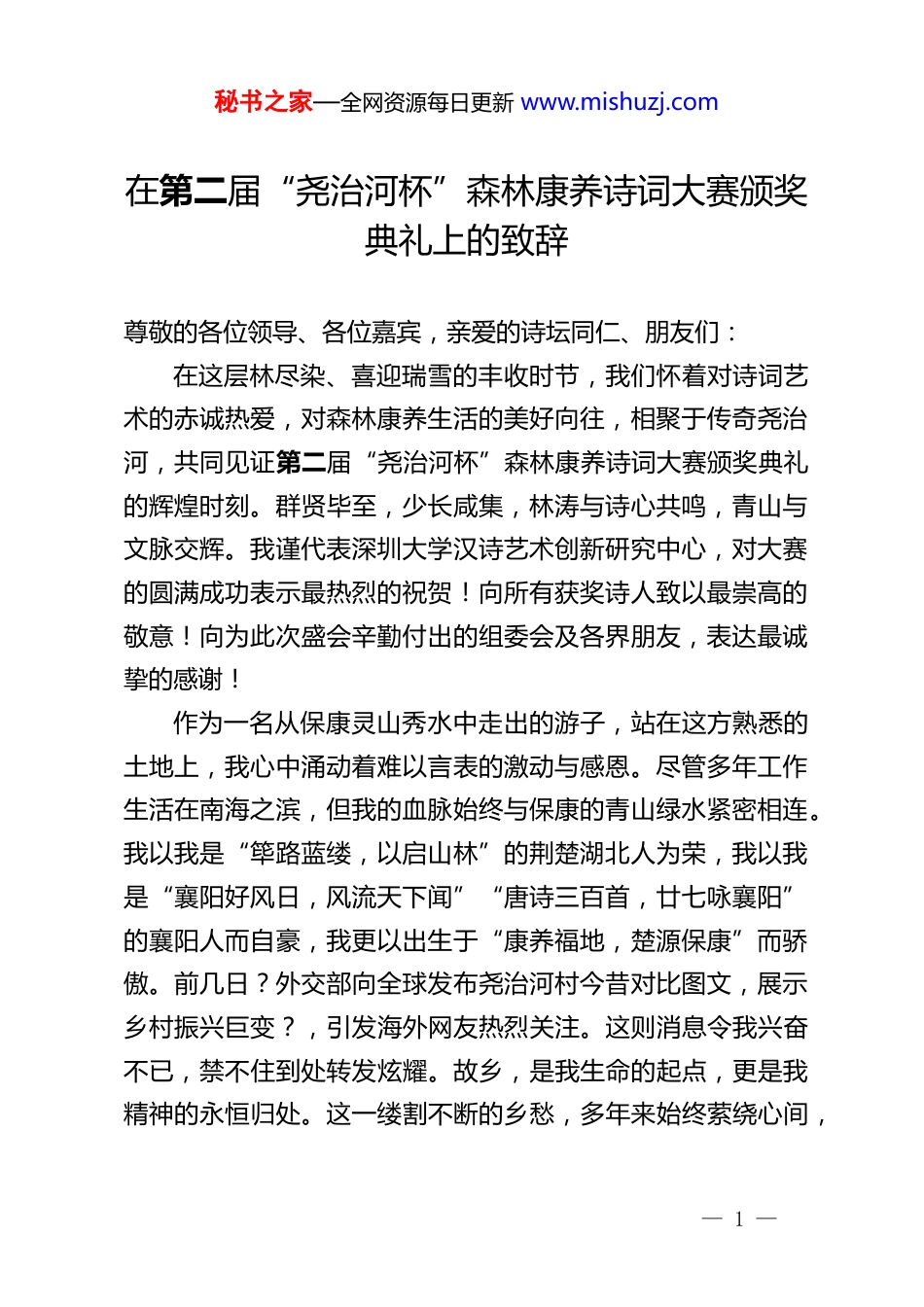 秘书之家—全网资源每日更新 www.mishuzj.com在第二届“尧治河杯”森林康养诗词大赛颁奖典礼上的致辞尊敬的各位领导、各位嘉宾,亲爱的诗坛同仁、朋友们:在这层林尽染、喜迎瑞雪的丰收时节,我们怀着对诗词艺术的赤诚热爱,对森林康养生活的美好向往,相聚于传奇尧治河,共同见证第二届“尧治河杯”森林康养诗词大赛颁奖典礼的辉煌时刻。群贤毕至,少长咸集,林涛与诗心共鸣,青山与文脉交辉。我谨代表深圳大学汉诗艺术创新研究中心,对大赛的圆满成功表示最热烈的祝贺!向所有获奖诗人致以最崇高的敬意!向为此次盛会辛勤付出的组委会及各界朋友,表达最诚挚的感谢!作为一名从保康灵山秀水中走出的游子,站在这方熟悉的土地上,我心中涌动着难以言表的激动与感恩。尽管多年工作生活在南海之滨,但我的血脉始终与保康的青山绿水紧密相连。我以我是“筚路蓝缕,以启山林”的荆楚湖北人为荣,我以我是“襄阳好风日,风流天下闻”“唐诗三百首,廿七咏襄阳”的襄阳人而自豪,我更以出生于“康养福地,楚源保康”而骄傲。前几日?外交部向全球发布尧治河村今昔对比图文,展示乡村振兴巨变?,引发海外网友热烈关注。这则消息令我兴奋不已,禁不住到处转发炫耀。故乡,是我生命的起点,更是我精神的永恒归处。这一缕割不断的乡愁,多年来始终萦绕心间,— 1 —秘书之家—全网资源每日更新 www.mishuzj.com促使我一次次归来,渴望为桑梓的文化繁荣贡献绵薄之力。今天,能在家乡的土地上参与这样一场诗词盛会,更令我倍感荣幸,情难自抑。尧治河,不仅是一处地理坐标,更是一种精神的象征。这里的每一道山梁,都镌刻着艰苦奋斗、改天换地的壮丽史诗;这里的每一泓清泉,都吟唱着自强不息、追求卓越的动人乐章。尧治河人以非凡的勇气与智慧,将往昔的僻壤打造成今日的诗意田园、康养胜地,这本身就是一首波澜壮阔、气吞山河的宏伟诗篇!这片土地所孕育的坚韧、智慧与和谐,与我们诗词创作所追寻的至真、至善、至美之境,高度契合,共鸣悠长!森林,是地球的绿肺,是生命的摇篮,更是现代人寻觅心灵慰藉的精神家园。当“森林康养”这一古老而又充满时代气息的理念,与被誉为“心灵体操”的诗词艺术相遇,便注定会绽放璀璨的光芒。本次大赛以“森林康养”为主题,正是要引领我们以诗意的眼光,重新审视人与自然的关系;以优美的韵律,抒写对绿色生态的深情礼赞;以深邃的思考,探寻生命康养的精神意蕴。拜读大赛众多佳作,我欣喜地看到,诗人们或描绘苍茫林海的浩瀚壮美,或吟咏山间幽谷的静谧空灵,或抒发回归自然的旷达超脱,或思索生态文明的永续发展。字里行间,涌动着对山河大地的无限热爱,闪烁着“天人合一”的保康智慧。尤其为令我感动的,是家乡保康在诗词文化传承与发展中— 2 —秘书之家—全网资源每日更新 www.mishuzj.com所展现的远见与热忱。近年来,保康全力推进“中华诗词之乡”创建,深入开展诗词“六进”活动,更启动了规模宏大的“一村一赋”文化工程。这项旨在为全县每一个村庄创作独特诗赋的创举,让我深切感受到家乡人民对传统文化的珍视与创造性传承。我的许多同仁与诗友,不辞辛劳,踏遍保康的山山水水,走访村村寨寨,将文化的种子播撒于阡陌之间。如今,行走在保康大地,“处处见诗词、处处闻歌赋、人人能吟诵”已蔚然成风,村赋如星斗般点缀于沃野之上,这正是文化浸润乡土、助力乡村振兴的最美画卷。能为此略尽绵力,是我这位游子莫大的荣光。诗词,是流淌在中华文明血脉中的基因,是照亮民族前程的不灭火炬。从《诗经》《楚辞》的浪漫与现实主义之源,到唐诗宋词的辉煌巅峰,诗词始终以其独特的艺术魅力,塑造着我们的审美情操,砥砺着我们的人格精神。深圳大学汉诗艺术创新研究中心,始终以传承与研究中华诗学、推动当代诗词创作为己任。我们欣喜地看到,在尧治河在这片文化沃土上,当代诗词正焕发出蓬勃的生机与活力。各位获奖诗人的力作,不仅技艺纯熟,意境高远,更紧扣时代脉搏,展现了强烈的现实关怀与历史担当。你们是当代诗坛跃动的火花,是中华诗词伟大复兴的希望所在!诗友们,同仁们!新时代的画卷已徐徐铺展,文化繁荣的浪潮正奔腾向前。...