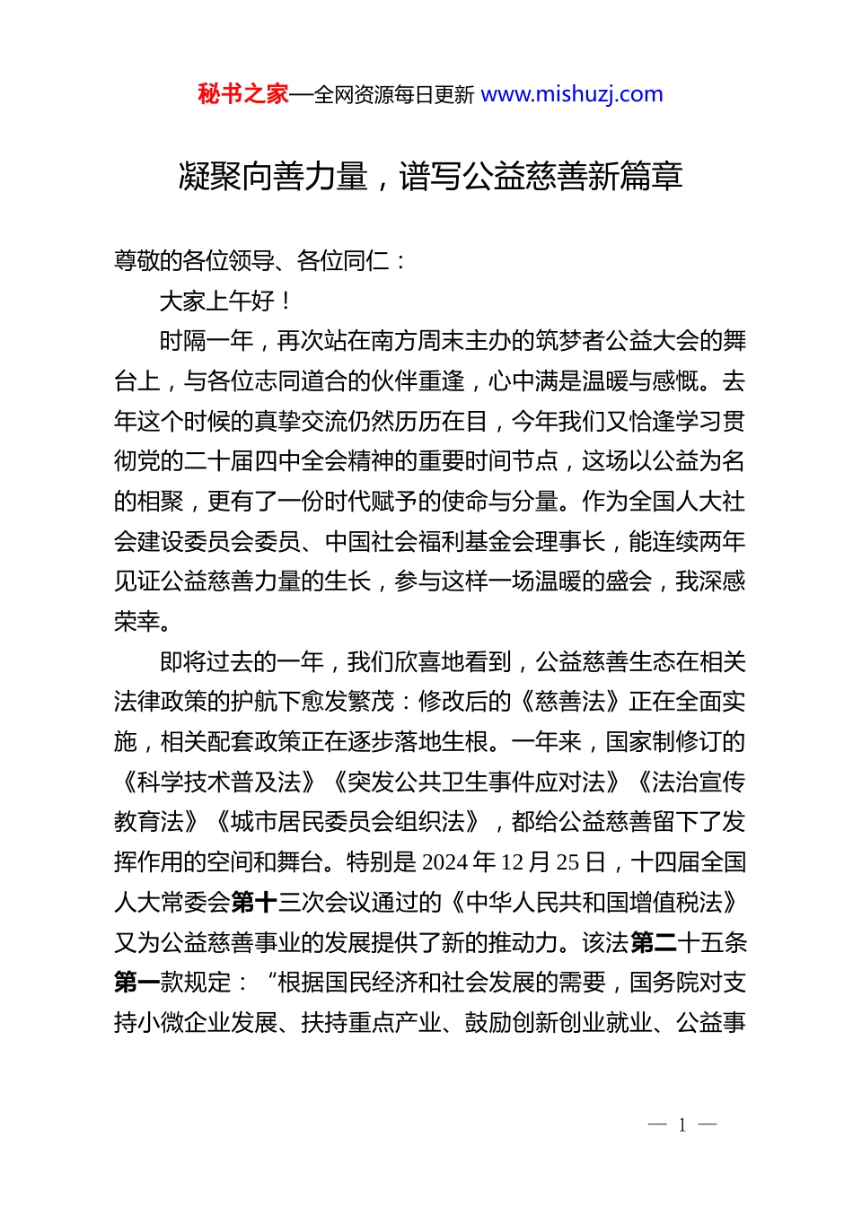 秘书之家—全网资源每日更新 www.mishuzj.com凝聚向善力量,谱写公益慈善新篇章尊敬的各位领导、各位同仁:大家上午好!时隔一年,再次站在南方周末主办的筑梦者公益大会的舞台上,与各位志同道合的伙伴重逢,心中满是温暖与感慨。去年这个时候的真挚交流仍然历历在目,今年我们又恰逢学习贯彻党的二十届四中全会精神的重要时间节点,这场以公益为名的相聚,更有了一份时代赋予的使命与分量。作为全国人大社会建设委员会委员、中国社会福利基金会理事长,能连续两年见证公益慈善力量的生长,参与这样一场温暖的盛会,我深感荣幸。即将过去的一年,我们欣喜地看到,公益慈善生态在相关法律政策的护航下愈发繁茂:修改后的《慈善法》正在全面实施,相关配套政策正在逐步落地生根。一年来,国家制修订的《科学技术普及法》《突发公共卫生事件应对法》《法治宣传教育法》《城市居民委员会组织法》,都给公益慈善留下了发挥作用的空间和舞台。特别是 2024 年 12 月 25 日,十四届全国人大常委会第十三次会议通过的《中华人民共和国增值税法》又为公益慈善事业的发展提供了新的推动力。该法第二十五条第一款规定:“根据国民经济和社会发展的需要,国务院对支持小微企业发展、扶持重点产业、鼓励创新创业就业、公益事— 1 —秘书之家—全网资源每日更新 www.mishuzj.com业捐赠等情形可以制定增值税专项优惠政策,报全国人民代表大会常务委员会备案。”相信今后随着相关政策的制修订,慈善法规定的“慈善组织及其取得的收入依法享受税收优惠”的含金量会更高,从而带动参与者的积极性会更高。过去一年里,在新质生产力的推动下,公益慈善场景正在发生着深刻变化。以 2025 年的“久久公益节”为例,数智化技术支持多元公益慈善,从供给侧进一步丰富了公益慈善的参与形式与覆盖渠道,“身边公益”地图、“组队捐”、“小红花码”等新公益产品,让社会大众能在文化、娱乐、社交、消费等生活场景中轻松做好事,把无处不在的生活场景变成了无处不在的公益场景,提升了公益慈善的可及性。这些进展都印证着一个共识,那就是公益慈善早已不是少数人的温情善举,而是融入社会建设的重要力量,是回应群众急难愁盼问题的民生答卷。各位同仁,今年 10 月召开的党的二十届四中全会,为未来5 年中国的进一步发展描绘了一幅更加壮美的蓝图,也为公益慈善事业的进一步发展指明了前进方向、注入了强大动力,提供了更加广阔的舞台。大家注意到,二十届四中全会强调的,比如“促进和规范公益慈善事业发展”“完善社会治理体系”“加强普惠性、基础性、兜底性民生建设,解决好人民群众急难愁盼问题”“扎实推进全体人民共同富裕”等命题,都是我们公益慈善事业发展的核心坐标与价值依归。南方周末多年来始终以媒体担当记录公益、传播善意、凝聚共识,为公益慈善— 2 —秘书之家—全网资源每日更新 www.mishuzj.com事业搭建了重要平台,愿我们以本届大会为契机,把党的二十届四中全会精神转化为公益慈善实践的具体行动,用每一份坚守、每一次创新、每一份善举,凝聚向善力量,谱写公益慈善新篇章。结合当前形势与这次大会的主题,我愿意分享以下几点思想认识供大家参考:第一,要深刻把握时代要求,在服务国家大局中彰显公益慈善价值。公益慈善事业要自觉将自身发展融入中国式现代化的宏伟蓝图,主动对接国家重大战略需求。无论是乡村振兴、应急救援,还是“一老一小”关爱、生态文明建设,公益慈善组织都应发挥其灵活、精准、创新的优势,成为公共服务的有益补充和社会治理的积极力量。我们要善于将社会的爱心资源,引导至国家发展最需要、人民群众最关切的领域。第二,要坚守法治精神,在规范化、透明化道路上行稳致远。公信力是公益慈善事业的生命线。随着相关法律法规的不断完善,公益慈善组织必须将依法依规治理置于更加突出的位置,进一步完善内部治理结构,健全项目运作机制,确保信息发布的真实性、完整性、及时性,自觉接受政府监管、社会监督和行业自律,以公开透明赢得社会大众的持久信任。第三,要激发创新活力,在提质增效中推动行业可持续发展。面对新形势新任务,公益慈善不能...