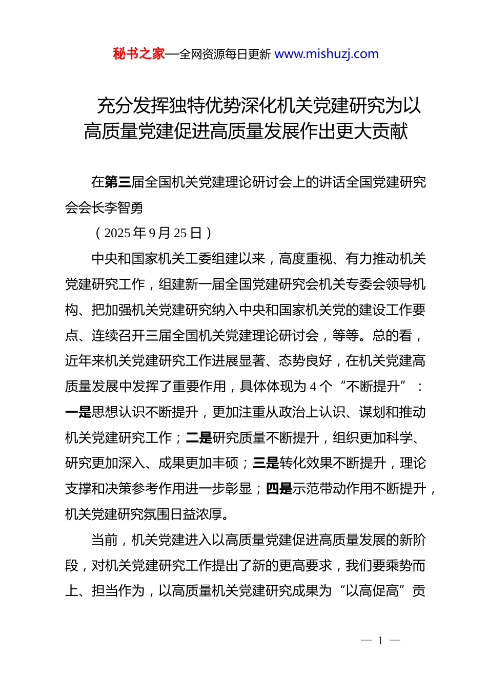 秘书之家—全网资源每日更新 www.mishuzj.com充分发挥独特优势深化机关党建研究为以高质量党建促进高质量发展作出更大贡献在第三届全国机关党建理论研讨会上的讲话全国党建研究会会长李智勇(2025 年 9 月 25 日)中央和国家机关工委组建以来,高度重视、有力推动机关党建研究工作,组建新一届全国党建研究会机关专委会领导机构、把加强机关党建研究纳入中央和国家机关党的建设工作要点、连续召开三届全国机关党建理论研讨会,等等。总的看,近年来机关党建研究工作进展显著、态势良好,在机关党建高质量发展中发挥了重要作用,具体体现为 4 个“不断提升”:一是思想认识不断提升,更加注重从政治上认识、谋划和推动机关党建研究工作;二是研究质量不断提升,组织更加科学、研究更加深入、成果更加丰硕;三是转化效果不断提升,理论支撑和决策参考作用进一步彰显;四是示范带动作用不断提升,机关党建研究氛围日益浓厚。当前,机关党建进入以高质量党建促进高质量发展的新阶段,对机关党建研究工作提出了新的更高要求,我们要乘势而上、担当作为,以高质量机关党建研究成果为“以高促高”贡— 1 —秘书之家—全网资源每日更新 www.mishuzj.com献新的智慧和力量。一、提高政治站位,深化机关党建重大问题研究姓党、为党是机关党建研究的灵魂,旗帜鲜明讲政治是机关党建研究第一位的要求。新征程上,机关党建研究展现新担当新作为,关键要坚持胸怀“国之大者”、党之大计,善于在大局中思考、从政治上考量,自觉把机关党建研究放在推动高质量发展、推进中国式现代化的大局中定位把向、科学谋划。要把机关党建研究作为机关党的建设基础性工作和重要组成部分,做到机关党建拓展到哪里,机关党建研究就跟进到哪里;机关党建需要解决什么问题,机关党建研究就研究什么问题,努力发挥好建言献策、服务保障作用。当前,要坚持问题导向,明确主攻方向,进一步聚焦深入学习贯彻习近平总书记“7·29”重要指示精神,推动以高质量党建促进高质量发展落实落地,深刻把握习近平新时代中国特色社会主义思想“机关党建篇”丰富内涵,研究“以高促高”的方式方法、有效路径,健全科学完备、有效管用的机关党建制度体系,推动在理论上深化拓展、在实践上破解难题、在制度上提质增效。二、加强组织协调,努力形成机关党建研究整体合力“积力之所举,则无不胜也;众智之所为,则无不成也。”要强化系统观念和“大队伍”理念,通过“拢指合拳”“合纵— 2 —秘书之家—全网资源每日更新 www.mishuzj.com连横”等方式,激发动力、增强活力,推动专业研究机构和机关党建部门、理论研究和工作实践、理论优势和经验优势形成互补,集中攻关、破解难题。要以组织机关党建重点研究课题为牵引,以特约研究员队伍建设为抓手,以全国机关党建理论研讨会为平台,探索完善深化理论研究、加强成果交流、形成整体合力、推动机关党建高质量发展的工作机制,充分调动广大机关党员干部和有关专家学者的积极性、主动性、创造性,促进同题共答、各展所长,交流互鉴、共同提高,形成推动机关党建高质量发展的强大力量,使机关党建研究成为广受关注、备受重视、共同支持的事业。三、推动成果转化,更好发挥机关党建研究的理论支撑和决策参考作用通过研究破解问题、以研究成果推动工作实践,这是机关党建研究的重要使命和任务。要把成果转化运用作为机关党建研究的落脚点,强化质量意识、精品意识,将研以致用落实到研究全过程,不断开创机关党建研究新局面。要以成果转化促进工作提升,加强与决策部门经常性沟通,做到供和需有效衔接、工作和研究互联互动,切实提高研究成果的针对性、实效性、可操作性。要完善研究成果评价方法,把转化情况纳入评价体系,推动产生更有分量、更大影响的精品成果。要探索多— 3 —秘书之家—全网资源每日更新 www.mishuzj.com途径、多渠道转化方式,着力建设好机关党建宣传阵地,加强机关党建研究成果的宣传推介。要完善研究成果交流研讨机制,持续扩大全国机关党建理论研讨会影响力。四、强化队伍建设,建设好机关党建研究高端智库当前,机关党建研究凝聚了有关专业研究机构...