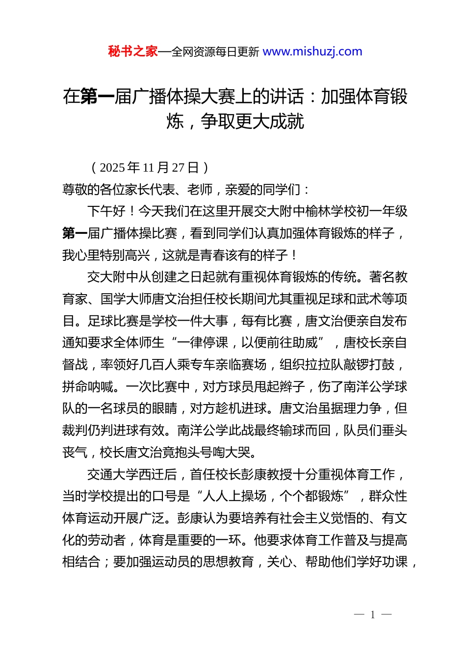 秘书之家—全网资源每日更新 www.mishuzj.com在第一届广播体操大赛上的讲话:加强体育锻炼,争取更大成就(2025 年 11 月 27 日)尊敬的各位家长代表、老师,亲爱的同学们:下午好!今天我们在这里开展交大附中榆林学校初一年级第一届广播体操比赛,看到同学们认真加强体育锻炼的样子,我心里特别高兴,这就是青春该有的样子!交大附中从创建之日起就有重视体育锻炼的传统。著名教育家、国学大师唐文治担任校长期间尤其重视足球和武术等项目。足球比赛是学校一件大事,每有比赛,唐文治便亲自发布通知要求全体师生“一律停课,以便前往助威”,唐校长亲自督战,率领好几百人乘专车亲临赛场,组织拉拉队敲锣打鼓,拼命呐喊。一次比赛中,对方球员甩起辫子,伤了南洋公学球队的一名球员的眼睛,对方趁机进球。唐文治虽据理力争,但裁判仍判进球有效。南洋公学此战最终输球而回,队员们垂头丧气,校长唐文治竟抱头号啕大哭。交通大学西迁后,首任校长彭康教授十分重视体育工作,当时学校提出的口号是“人人上操场,个个都锻炼”,群众性体育运动开展广泛。彭康认为要培养有社会主义觉悟的、有文化的劳动者,体育是重要的一环。他要求体育工作普及与提高相结合;要加强运动员的思想教育,关心、帮助他们学好功课,— 1 —秘书之家—全网资源每日更新 www.mishuzj.com要给学生运动员增加营养和活动经费。学校凡有大型的体育活动,他都要亲临讲话,予以鼓励。訾艳阳校长非常重视校园体育运动,协调多方资源改造了学校田径场,建成了 600 平方米的风雨操场,为师生体育活动提供充分的保障。目前,交大附中本部校园篮球、足球、排球、棒球、乒乓球、武术、啦啦操、舞狮舞龙等体育运动经常性开展得如火如荼。学校篮球队十多年连续包揽陕西省中学生男篮、女篮冠军,也为清华大学、西安交通大学等名校输送了一大批优秀篮球人才。2017 年 6 月,时任教育部党组书记、部长陈宝生到交大附中考察学校体育工作,为学校题词寄语,并为篮球队员签名、合影留念。2021 年 4 月,习近平总书记在视察清华大学时候,专程看望学校女篮队员,他对女篮队长宋珂昕说“我会一直关注你”。宋珂昕就是交大附中的优秀毕业生之一。大家如果对篮球感兴趣,可以上网搜索一下宋珂昕相关信息。2025 年 3 月 18 日,陕西秦英文化体育有限公司与交通大学、交大附中签署“体育足球专业人才培养战略合作协议”,向西安交通大学教育基金会捐赠 2.5 亿,携手探索足球人才培养新范式,前国家足球队主教练米卢蒂诺维奇等出席见证。2022 年,交大附中“以体育人:中学生三维多元发展模式的创新与实践”教育成果获国家教学成果二等奖。同学们,通过体育锻炼可以享受乐趣、增强体质、健全人格、锤炼意志。你们有没有发现,凡是喜欢运动、热爱体育、— 2 —秘书之家—全网资源每日更新 www.mishuzj.com身体棒棒的同学,他们的人际关系普遍和谐、心胸也宽广、学习也不差。凡是重视体育运动的班级,班内的啰嗦事、麻烦事、鸡毛蒜皮闹矛盾的小事都很少,学生普遍阳光灿烂、积极向上、团结奋发。这就是体育锻炼给个人、集体带来的好处。但是,在我们交大附中榆林学校的校园内,重视体育的氛围还没有完全形成:开学第一周晨会上,就有 2 名学生晕倒;上午课间操跑步,总有一些同学找各种理由不积极参与;下午的广播体操,总有同学不用心、不认真对待,懒洋洋的;体育课上,也有同学不能按照老师要求完成“流汗的运动”。这怎么行呢?同学们,学习是一辈子的事情,即便现在学习不太好,后期通过努力都是可以赶上来的,任何时候学习文化知识都不会晚。但是青少年时期是身体发育的关键期、黄金期,如果在这个时期不重视体育锻炼,身体出现问题,那是一辈子的麻烦。老师们,同学们,体育不仅关乎个人健康,更关乎国家、民族命运。近百年前的耻辱犹在眼前:1936 年柏林奥运会期间,中国代表团 69 名运动员参赛仅 1 人进入复赛,归国途经新加坡时当地报刊刊登讽刺漫画“东亚病夫”。这便是中国人被称为“东亚病夫”的由来,多么屈辱的称号啊!同学们应该看过有关霍元甲、陈真、李小龙系列的影视作品,1972 ...