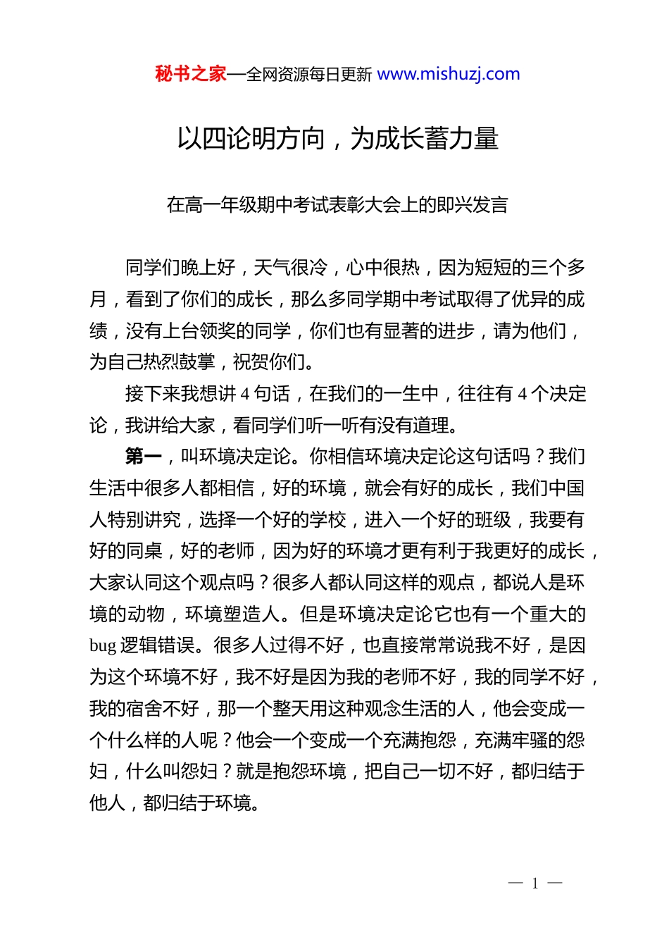 秘书之家—全网资源每日更新 www.mishuzj.com以四论明方向,为成长蓄力量在高一年级期中考试表彰大会上的即兴发言同学们晚上好,天气很冷,心中很热,因为短短的三个多月,看到了你们的成长,那么多同学期中考试取得了优异的成绩,没有上台领奖的同学,你们也有显著的进步,请为他们,为自己热烈鼓掌,祝贺你们。接下来我想讲 4 句话,在我们的一生中,往往有 4 个决定论,我讲给大家,看同学们听一听有没有道理。第一,叫环境决定论。你相信环境决定论这句话吗?我们生活中很多人都相信,好的环境,就会有好的成长,我们中国人特别讲究,选择一个好的学校,进入一个好的班级,我要有好的同桌,好的老师,因为好的环境才更有利于我更好的成长,大家认同这个观点吗?很多人都认同这样的观点,都说人是环境的动物,环境塑造人。但是环境决定论它也有一个重大的bug 逻辑错误。很多人过得不好,也直接常常说我不好,是因为这个环境不好,我不好是因为我的老师不好,我的同学不好,我的宿舍不好,那一个整天用这种观念生活的人,他会变成一个什么样的人呢?他会一个变成一个充满抱怨,充满牢骚的怨妇,什么叫怨妇?就是抱怨环境,把自己一切不好,都归结于他人,都归结于环境。— 1 —秘书之家—全网资源每日更新 www.mishuzj.com所以认同环境决定论的人,他如果成功了,他就会说是得益于环境,但是如果他不成功,他活得不如意,他也会归咎于环境,她就把自己活成了一个怨妇。第二叫做行为决定论,什么是行为决定论呢?那就是实干,只要你做了,就一定对你有影响,如果影响不够,那一定是做的不够,干就是了!大家思考一下,行为决定论者是不是要比环境决定论者高出好几个层级?,因为这样的人是实干家,虽然实干家通过很多的努力,付出很多,不见得有收获。但是只要坚持这种观点,他就一定有进步。比如说看到环境脏乱差,你拿起扫把去打扫,你的这一个行为是不是必然决定了你环境被改善?而且是立竿见影,当场见效,如果你今天有一个知识点不懂,你立即找老师去问,这样一个行为是不是可以立即转变。这就是实干家。我们这个社会倡导实干家。所以当你遇到所有的困难,所有的不如意,一个简单的理念叫做干就是了第三叫做能力决定论,大家认可这个观点吗?那么什么是能力决定论呢?就是自己做得好或者做的不好,那当然都是能力决定的,能力大就做更多的事,能力小就做少一点的事儿,但是什么是能力呢?我给大家提供一个你可能从来没听说过的观念,能力其实是一种选择,能力及选择,我们平时动不动说,很多事情我不能做,因为我没有能力。其实是不是没有能力呢?不是的,而是你没有选择,任何一个困难,它的解决途径,一定有至少三种选择方案等着你,所以绝对没有不可解决的问题,— 2 —秘书之家—全网资源每日更新 www.mishuzj.com只是你没有做出最有利于你的选择,同样,面对你的弱科,你觉得非常困难,有的人说完全没有能力,是真的没有能力吗?是有很多条路可以供你选择,只是你。觉得无可选择,所以才显得没有能力,比如找老师问问题,是不是就是一个突破点?比如查阅资料,自主学习,先从容易做起,是不是也是一种选择?而接下来你们将面临一个更大的选择。那就是择科,是选择物理方向,还是选择历史方向?如果你觉得哪一个都很困难,你一定还有更有利于你的选择,只要找出最有利于你的选择,你一定就一定。找到最适合你的方向。第四叫做身份决定论。什么是身份决定论呢?如果你给 5年后的自己拟定一个身份,请问你是什么身份?很多同学说是在大学学习,那么你是哪个大学的学生?你在学什么专业?如果你现在很清晰的话是不是对你现在的学习状态有最直接的影响?如果你心中非常清楚,5 年之后,你的身份是什么,你现在的一切行为、观念,是不是都将照着他的方向去努力?同样,10 年后的你是什么身份?明确了身份,你就会发现你的整个人的状态都不一样了,民间有一句俗话,叫做屁股决定脑袋,这个屁股决定脑袋,就是你的位置,你的身份,你在什么位置上,你就一定围绕着你所处的位置。所处的身份去思考,去努力。说一个我自己成长的经历,我是河南开封非常贫穷的一个农...