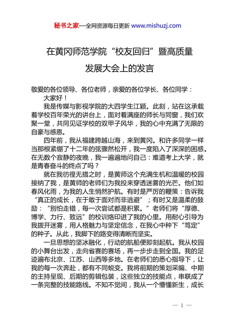 秘书之家—全网资源每日更新 www.mishuzj.com在黄冈师范学院“校友回归”暨高质量发展大会上的发言敬爱的各位领导、各位老师,亲爱的各位学长、各位同学:大家好!我是传媒与影视学院的大四学生江颖。此刻,站在这承载着学校百年荣光的讲台上,面对着满座的师长与同窗,我们欢聚一堂,共同见证学校的双甲子风华,我的心中充满了无限的自豪与感恩。四年前,我从福建跨越山海,来到黄冈。和许多同学一样当那根紧绷了十二年的弦骤然松开,我一度陷入了深深的困惑。在无数个寂静的夜晚,我一遍遍地问自己:难道考上大学,就是青春奋斗的终点了吗?就在我彷徨无措之时,是黄师这个充满生机和温暖的校园接纳了我,是黄师的老师们为我投来穿透迷雾的光芒。他们如春风化雨,为我的人生悄然护航。有时是严厉的鞭策:告诉我“真正的成长,在于敢于面对而非逃避”;有时又是温柔的鼓励:“别怕走错,每一次尝试都是积累。”老师们将“厚德、博学、力行、致远”的校训烙印进了我的心里。用耐心引导为我拨开迷雾,用人格魅力与坚定信念,在我心中种下“笃定”的种子。从此,我脚下的路变得清晰而坚实。一旦思想的坚冰融化,行动的航船便即刻起航。我从校园的小舞台出发,走向省赛的赛场,再一步步走到全国。我的足迹遍布北京、江苏、山西等多地。在老师们的悉心指导下,让我的每一次奔赴,都有不同蜕变。我将前期的策划采编、中期的主持呈现、后期的剪辑包装,这些独立的技能点,串联成了一条完整的技能路线。不知不觉间,我从一个懵懂新生,成长— 1 —秘书之家—全网资源每日更新 www.mishuzj.com为了一名复合型传媒学子,也在各类比赛中,获得省市级以上荣誉近二十项。这些荣誉,既是成长的印记,更是出征的号角。今年九月我有幸代表湖北省,参加了全国社科普及讲解员大赛。这是我国该领域的最高级别赛事,竞争空前激烈。学校为我组建了一支“奥运会备战模式”的精英团队。我至今清晰地记得备战启动会那天,黄州盛夏,气温逼近四十度,空气中都弥漫着灼人的热浪。学校为我的备赛召集不同领域的专家,他们的指导计划是一张张满满的日程表。接下来的五十多天,是一段凤凰涅槃般的淬炼。从发音吐字的毫厘之差,到稿件结构的千般打磨,十多位老师组成的教练团队,为我反复推演每一个细节。最终,作为湖北省唯一进入决赛的选手,也是全场唯一的在校大学生,我荣获了全国一等奖。当我登上领奖台,聚光灯亮起的那一刻,我无比清晰地意识到,这份荣耀,绝不只属于我个人。我骄傲地代表黄师领奖,这背后是我们“尚师表、勇担当、秉诚朴、图自强”的黄师精神!这种精神,是学校一百二十年来薪火相传的不竭动力,是黄师人言传身教、心系一处、共铸辉煌的生动写照。黄师的昨天,已由前辈们的呕心沥血铸就;黄师的明天,正等待我们这一代人的同心共济续写。站在黄师一百二十年辉煌的肩膀上,让我们将个人理想融入时代洪流,把青春奋斗汇入强国伟业,用我们的智慧与汗水,为黄师的下一个百年,书写崭新华章!弦歌不辍百廿载,春华秋实满庭芳。最后,让我们共同祝福黄冈师范学院 120 周年华诞,愿您再谱新时代的璀璨华章!谢谢大家!— 2 —