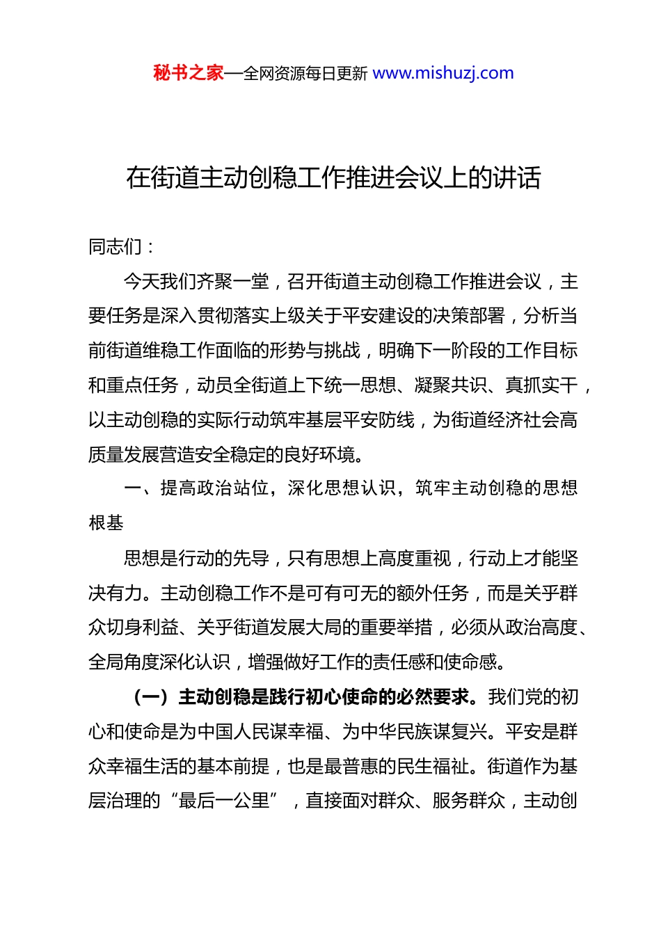 秘书之家—全网资源每日更新 www.mishuzj.com在街道主动创稳工作推进会议上的讲话同志们:今天我们齐聚一堂,召开街道主动创稳工作推进会议,主要任务是深入贯彻落实上级关于平安建设的决策部署,分析当前街道维稳工作面临的形势与挑战,明确下一阶段的工作目标和重点任务,动员全街道上下统一思想、凝聚共识、真抓实干,以主动创稳的实际行动筑牢基层平安防线,为街道经济社会高质量发展营造安全稳定的良好环境。一、提高政治站位,深化思想认识,筑牢主动创稳的思想根基思想是行动的先导,只有思想上高度重视,行动上才能坚决有力。主动创稳工作不是可有可无的额外任务,而是关乎群众切身利益、关乎街道发展大局的重要举措,必须从政治高度、全局角度深化认识,增强做好工作的责任感和使命感。(一)主动创稳是践行初心使命的必然要求。我们党的初心和使命是为中国人民谋幸福、为中华民族谋复兴。平安是群众幸福生活的基本前提,也是最普惠的民生福祉。街道作为基层治理的“最后一公里”,直接面对群众、服务群众,主动创秘书之家—全网资源每日更新 www.mishuzj.com稳工作做得好不好,直接关系到群众的安全感和满意度。近年来,随着经济社会的快速发展,街道辖区内各类矛盾纠纷时有发生,如邻里纠纷、物业矛盾、劳资争议等,这些问题如果不能及时有效解决,就可能影响群众的正常生活,甚至引发不稳定因素。主动创稳就是要主动回应群众的期盼,把群众的安危冷暖放在心上,积极解决群众身边的矛盾问题,让群众在平安稳定的环境中生活、工作,切实感受到党和政府的关怀与温暖,这是我们践行初心使命的具体体现。(二)主动创稳是推动高质量发展的重要保障。发展是第一要务,稳定是第一责任。没有稳定的社会环境,一切发展都无从谈起。当前,我们街道正处于转型升级、爬坡过坎的关键时期,项目建设、城市更新、产业发展等各项工作都在稳步推进。这些工作的顺利开展,离不开稳定的社会环境。如果社会不稳定,企业就不敢投资,项目就难以落地,群众的生产生活秩序就会受到影响。主动创稳就是要为街道的高质量发展保驾护航,通过化解矛盾、消除隐患,营造安全稳定、和谐有序的发展环境,让各类市场主体在街道安心经营,让广大群众在街道舒心生活。(三)主动创稳是提升基层治理能力的有效途径。基层是国家治理的“神经末梢”,基层治理能力的强弱直接关系到国秘书之家—全网资源每日更新 www.mishuzj.com家治理体系和治理能力现代化的水平。主动创稳工作涉及社会治理的方方面面,需要我们统筹协调各方力量,运用多种手段解决问题,这对于提升基层治理能力具有重要意义。在主动创稳过程中,我们需要不断完善治理机制、创新治理方法、整合治理资源,如建立健全矛盾纠纷多元化解机制、运用信息化手段加强社会治安防控等。通过这些实践,我们能够积累基层治理经验,提高应对复杂局面、解决实际问题的能力,推动基层治理体系更加完善、治理能力不断提升。二、聚焦重点任务,强化担当作为,夯实主动创稳的实践基础主动创稳工作任务艰巨、责任重大,我们要聚焦重点领域和关键环节,以实实在在的行动解决问题、化解矛盾、消除隐患,确保主动创稳工作取得实效。(一)全面排查化解矛盾纠纷,筑牢社会和谐“第一道防线”。矛盾纠纷是影响社会稳定的主要因素,只有及时排查、有效化解,才能从源头上维护社会和谐稳定。要坚持定期排查与不定期排查相结合,组织网格员、社区干部、志愿者等力量深入小区、企业、学校等场所,全面排查各类矛盾纠纷,做到底数清、情况明。对于排查出的矛盾纠纷,要按照“属地管理、分级负责”和“谁主管、谁负责”的原则,建立台账、明确责秘书之家—全网资源每日更新 www.mishuzj.com任、限期化解。要充分发挥人民调解、行政调解、司法调解“三调联动”作用,针对不同类型的矛盾纠纷,采取不同的化解方式。例如,对于邻里纠纷,要发挥社区调解员的作用,通过耐心细致的劝说,促使双方达成和解;对于物业矛盾,要组织业主、物业公司、社区居委会进行协商,明确各方权利义务,解决实际问题;对于劳资争议,要联合劳动保障部门,依法维护劳动者和用人单位的合法权益。...