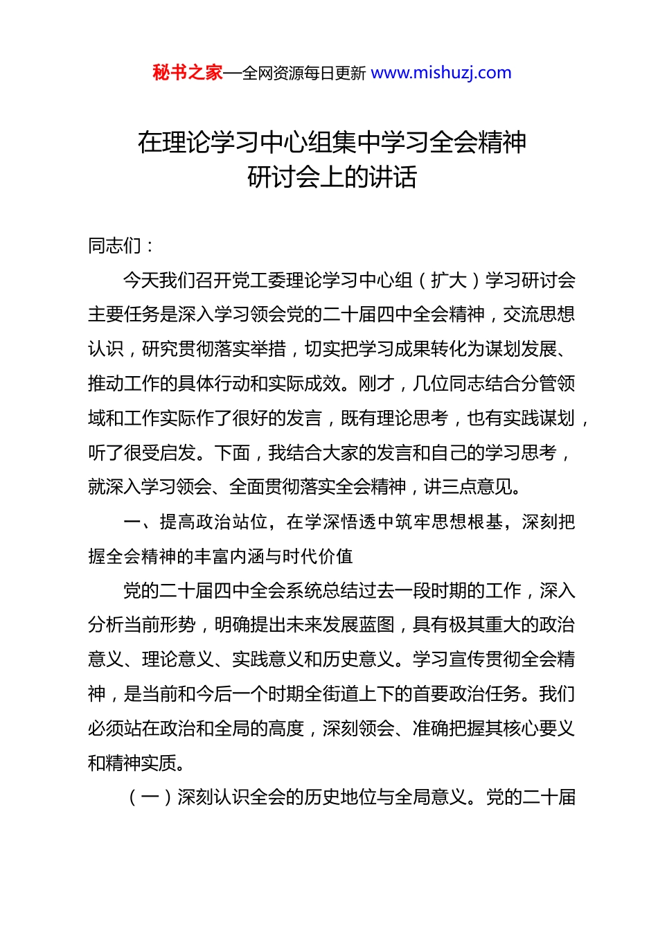 秘书之家—全网资源每日更新 www.mishuzj.com在理论学习中心组集中学习全会精神研讨会上的讲话 同志们:今天我们召开党工委理论学习中心组(扩大)学习研讨会主要任务是深入学习领会党的二十届四中全会精神,交流思想认识,研究贯彻落实举措,切实把学习成果转化为谋划发展、推动工作的具体行动和实际成效。刚才,几位同志结合分管领域和工作实际作了很好的发言,既有理论思考,也有实践谋划,听了很受启发。下面,我结合大家的发言和自己的学习思考,就深入学习领会、全面贯彻落实全会精神,讲三点意见。一、提高政治站位,在学深悟透中筑牢思想根基,深刻把握全会精神的丰富内涵与时代价值党的二十届四中全会系统总结过去一段时期的工作,深入分析当前形势,明确提出未来发展蓝图,具有极其重大的政治意义、理论意义、实践意义和历史意义。学习宣传贯彻全会精神,是当前和今后一个时期全街道上下的首要政治任务。我们必须站在政治和全局的高度,深刻领会、准确把握其核心要义和精神实质。(一)深刻认识全会的历史地位与全局意义。党的二十届秘书之家—全网资源每日更新 www.mishuzj.com四中全会是在我国全面建设社会主义现代化国家关键时期、向第二个百年奋斗目标进军的重要节点召开的一次具有里程碑意义的会议。全会全面总结了党的二十届三中全会以来党和国家事业取得的新重大成就,彰显了以习近平同志为核心的党中央高瞻远瞩的战略眼光、统揽全局的驾驭能力和攻坚克难的坚定决心。从历史维度看,全会为我们在新的历史起点上继续前进指明了方向,是对中华民族伟大复兴征程的又一次有力推动。它继承和发展了党的历代中央全会的优良传统和宝贵经验,在党的历史上留下了浓墨重彩的一笔。从全局角度看,全会对经济、政治、文化、社会、生态文明等各个领域进行了系统谋划和全面部署,涉及改革发展稳定、内政外交国防、治党治国治军等各个方面。这对于统筹推进“五位一体”总体布局、协调推进“四个全面”战略布局,实现国家治理体系和治理能力现代化,具有重大而深远的影响。(二)准确把握全会的核心要义与理论精髓。全会审议通过的重要文件,体系严密、内涵丰富,提出了一系列新思想、新论断、新要求。其核心要义集中体现在关于中国式现代化的系统阐述、关于未来发展的宏伟目标、关于重点任务的战略部署上。我们要原原本本学、全面系统学、深入思考学,深刻理解中国式现代化的中国特色、本质要求和重大原则。中国式现秘书之家—全网资源每日更新 www.mishuzj.com代化是人口规模巨大的现代化、是全体人民共同富裕的现代化、是物质文明和精神文明相协调的现代化、是人与自然和谐共生的现代化、是走和平发展道路的现代化。这一论断深刻揭示了中国式现代化的独特优势和内在规律,为我们推进各项工作提供了根本遵循。我们要深刻把握未来发展的指导思想、目标任务和路径方法。全会明确了未来一段时期我国经济社会发展的总体目标和具体任务,提出了一系列具有前瞻性、战略性、针对性的举措。我们要将这些目标任务与本地实际相结合,制定切实可行的工作计划和实施方案,确保各项工作有序推进。我们要深刻领会党中央对经济社会发展、深化改革开放、统筹发展和安全、推进共同富裕等方面作出的新部署新要求。特别是要学深悟透其中蕴含的世界观、方法论和贯穿其中的立场观点方法,用以武装头脑、指导实践、推动工作。例如,在经济社会发展方面,要坚持新发展理念,推动高质量发展;在深化改革开放方面,要以重点领域和关键环节改革为突破口,激发市场活力和社会创造力;在统筹发展和安全方面,要增强忧患意识,做到居安思危,有效防范化解各类风险挑战;在推进共同富裕方面,要坚持以人民为中心的发展思想,让发展成果更多更公平惠及全体人民。二、强化使命担当,在知行合一中推动工作落实,将全会秘书之家—全网资源每日更新 www.mishuzj.com精神转化为推动发展的强大动力学习的目的全在于运用。我们要把学习贯彻党的二十届四中全会精神与实际工作紧密结合起来,以全会精神为指引,找准工作的切入点和着力点,推动各项工作取得新成效。(一)聚焦经济发展,培育新动能,实现高质量增长。...