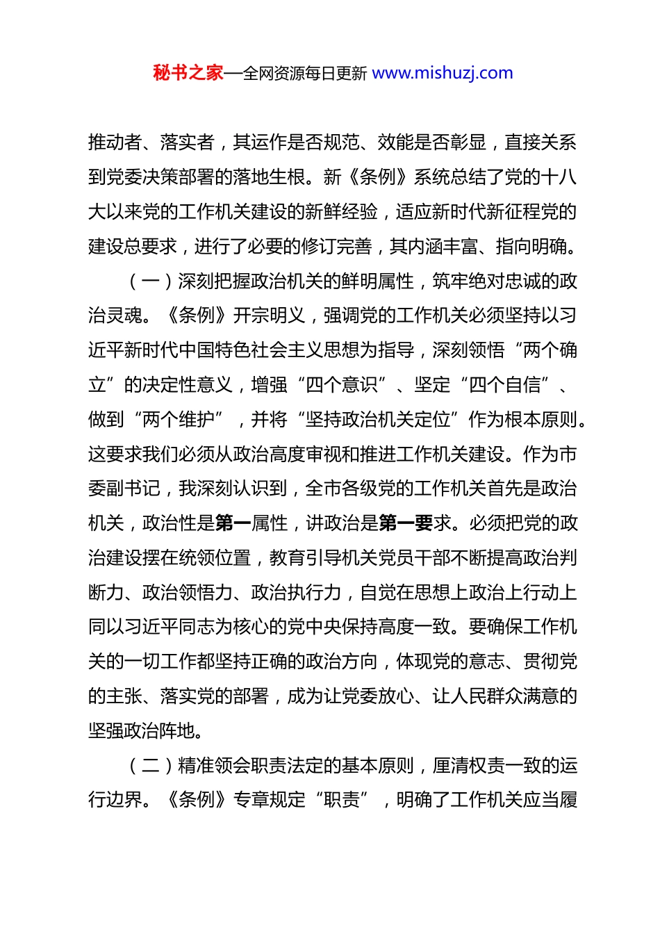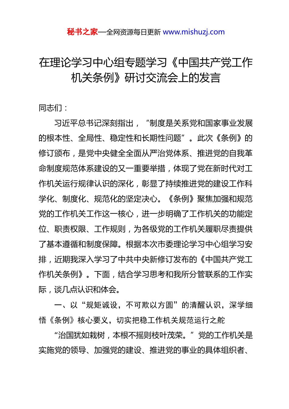 秘书之家—全网资源每日更新 www.mishuzj.com在理论学习中心组专题学习《中国共产党工作机关条例》研讨交流会上的发言 同志们:习近平总书记深刻指出,“制度是关系党和国家事业发展的根本性、全局性、稳定性和长期性问题”。此次《条例》的修订颁布,是党中央健全全面从严治党体系、推进党的自我革命制度规范体系建设的又一重要举措,体现了党在新时代对工作机关运行规律认识的深化,彰显了持续推进党的建设工作科学化、制度化、规范化的坚定决心。《条例》聚焦加强和规范党的工作机关工作这一核心,进一步明确了工作机关的功能定位、职责权限、工作规则,为各级党的工作机关履职尽责提供了基本遵循和制度保障。根据本次市委理论学习中心组学习安排,近期我深入学习了中共中央新修订发布的《中国共产党工作机关条例》。下面,结合学习思考和我所分管联系的工作实际,谈几点认识和体会。一、以“规矩诚设,不可欺以方圆”的清醒认识,深学细悟《条例》核心要义,切实把稳工作机关规范运行之舵“治国犹如栽树,本根不摇则枝叶茂荣。”党的工作机关是实施党的领导、加强党的建设、推进党的事业的具体组织者、秘书之家—全网资源每日更新 www.mishuzj.com推动者、落实者,其运作是否规范、效能是否彰显,直接关系到党委决策部署的落地生根。新《条例》系统总结了党的十八大以来党的工作机关建设的新鲜经验,适应新时代新征程党的建设总要求,进行了必要的修订完善,其内涵丰富、指向明确。(一)深刻把握政治机关的鲜明属性,筑牢绝对忠诚的政治灵魂。《条例》开宗明义,强调党的工作机关必须坚持以习近平新时代中国特色社会主义思想为指导,深刻领悟“两个确立”的决定性意义,增强“四个意识”、坚定“四个自信”、做到“两个维护”,并将“坚持政治机关定位”作为根本原则。这要求我们必须从政治高度审视和推进工作机关建设。作为市委副书记,我深刻认识到,全市各级党的工作机关首先是政治机关,政治性是第一属性,讲政治是第一要求。必须把党的政治建设摆在统领位置,教育引导机关党员干部不断提高政治判断力、政治领悟力、政治执行力,自觉在思想上政治上行动上同以习近平同志为核心的党中央保持高度一致。要确保工作机关的一切工作都坚持正确的政治方向,体现党的意志、贯彻党的主张、落实党的部署,成为让党委放心、让人民群众满意的坚强政治阵地。(二)精准领会职责法定的基本原则,厘清权责一致的运行边界。《条例》专章规定“职责”,明确了工作机关应当履秘书之家—全网资源每日更新 www.mishuzj.com行的六项基本职责,并对办公厅(室)、职能部门、办事机构、派出机关等不同类型工作机关的职责侧重进行了界定,特别强调“应当由党委履行的职责,党委不得将其授予工作机关”。这清晰划定了党委与工作机关、不同工作机关之间的权责边界。学习领会这一点,对于避免职能交叉、推诿扯皮,确保党委“总揽全局、协调各方”作用有效发挥至关重要。在工作中,我们必须带头维护市委的权威和集中统一领导,支持各工作机关依照《条例》和“三定”规定依法依规履职。同时,要督促各工作机关牢固树立“法定职责必须为、法无授权不可为”的法治思维,既要敢于担当、积极作为,又要严守权限、规范用权,确保各项工作在制度化轨道上高效运行。(三)系统掌握决策执行的程序要求,提升科学规范的治理效能。《条例》第四章“决策与执行”对工作机关的议事决策规则、程序、执行机制等作出了详细规定,强调坚持民主集中制,实行集体领导和个人分工负责相结合,明确了须由领导班子集体研究决定的重大事项范围及科学民主依法决策的程序要求。这为我们提升工作机关决策水平和执行效率提供了操作指南。作为领导班子成员,我深感必须带头严格执行民主集中制,凡属重大决策、重要干部任免、重大项目安排和大额资金使用等,都必须经过集体讨论决定。要推动各工作机关健全完秘书之家—全网资源每日更新 www.mishuzj.com善议事规则和决策程序,加强调查研究、风险评估、合法合规性审查,确保决策经得起实践、人民和历史的检验。同时,要建立健全督查、评估、反馈的闭环管理机制,确保市委的各项决...