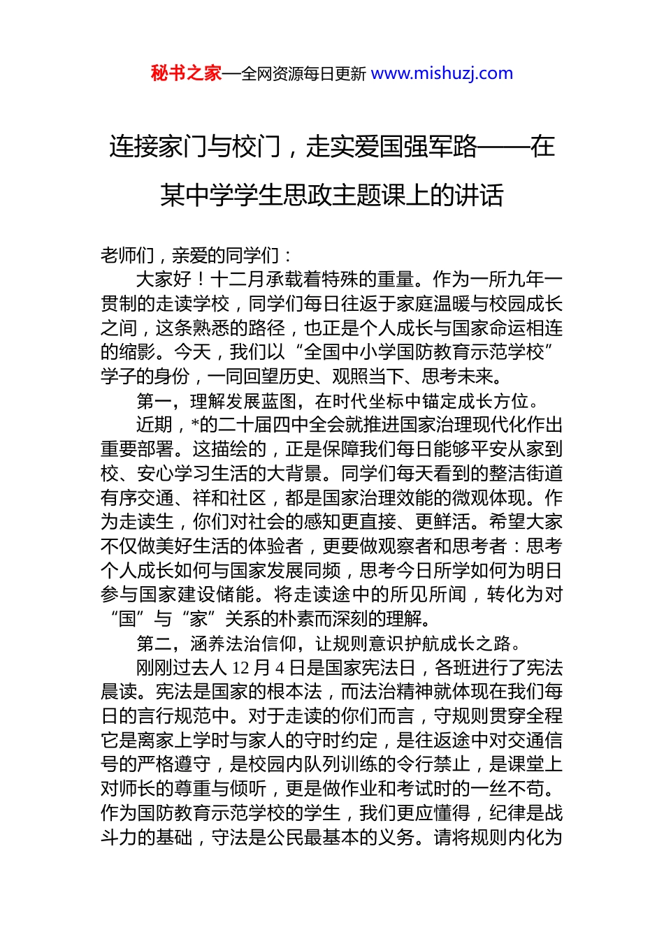 秘书之家—全网资源每日更新 www.mishuzj.com连接家门与校门,走实爱国强军路——在某中学学生思政主题课上的讲话老师们,亲爱的同学们:大家好!十二月承载着特殊的重量。作为一所九年一贯制的走读学校,同学们每日往返于家庭温暖与校园成长之间,这条熟悉的路径,也正是个人成长与国家命运相连的缩影。今天,我们以“全国中小学国防教育示范学校”学子的身份,一同回望历史、观照当下、思考未来。第一,理解发展蓝图,在时代坐标中锚定成长方位。近期,*的二十届四中全会就推进国家治理现代化作出重要部署。这描绘的,正是保障我们每日能够平安从家到校、安心学习生活的大背景。同学们每天看到的整洁街道有序交通、祥和社区,都是国家治理效能的微观体现。作为走读生,你们对社会的感知更直接、更鲜活。希望大家不仅做美好生活的体验者,更要做观察者和思考者:思考个人成长如何与国家发展同频,思考今日所学如何为明日参与国家建设储能。将走读途中的所见所闻,转化为对“国”与“家”关系的朴素而深刻的理解。第二,涵养法治信仰,让规则意识护航成长之路。刚刚过去人 12 月 4 日是国家宪法日,各班进行了宪法晨读。宪法是国家的根本法,而法治精神就体现在我们每日的言行规范中。对于走读的你们而言,守规则贯穿全程它是离家上学时与家人的守时约定,是往返途中对交通信号的严格遵守,是校园内队列训练的令行禁止,是课堂上对师长的尊重与倾听,更是做作业和考试时的一丝不苟。作为国防教育示范学校的学生,我们更应懂得,纪律是战斗力的基础,守法是公民最基本的义务。请将规则内化为秘书之家—全网资源每日更新 www.mishuzj.com习惯,让法治精神照亮从家门到校门的每一步,成为一个有边界、有担当、有责任感的人。第三,铭记民族历史,将国防之志融入日常之行。12 月 13 日,是南京大屠杀死难者国家公祭日。88 年前的血泪历史警示我们:没有强大的国防,就没有民族的生存尊严与人民的安宁幸福。日本首相高市早苗近期公然将“台湾有事”与日本“存亡危机事态”挂钩,宣称自卫队可行使集体自卫权,其背后的自民*高层还附和“台湾有事就是日本有事”的谬论,严重违背一个中国原则和中日四个政治文件精神,与当年日本军国主义以“存亡危机”为借口发动侵略战争的论调如出一辙。对此,我们必须保持高度警惕!我们这所“全国中小学国防教育示范学校”开展教育的深层意义,正源于此——国防教育,非为播撒仇恨,而在培育守护和平的能力;非为渲染危局,而在浇灌永不凋零的家国情怀。作为走读生,国防教育的实践拥有独特场域:它可以是离校前将桌椅归位的自觉,是独自上学途中保持的警觉与挺拔,是在家中主动整理内务养成的作风,是在社区展现的文明素养,更是在校参上课时的全情投入。铭记历史对于我们,就是把“天下虽安,忘战必危”的忧患意识,转化为每日强健体魄、钻研知识、严守纪律的具体行动。同学们,你们每日背负的书包里,装着知识的重量,也承载着家庭的期盼与国家的未来。你们连接着“小家”与“大家”,展现着一所国防教育特色学校的风貌。在此,我向大家提出三点期望:一、做“心系家国”的自觉传承者。将在学校感悟的爱国情、强军志带回家中分享,让国防教育的辐射力从校园延伸至家庭。二、做“遵规守纪”的模范践行者。无论是在家庭、路途还是校园,始终以高标准要求自我,展现示范学校学秘书之家—全网资源每日更新 www.mishuzj.com子的优良素养。三、做“崇军尚武”的积极行动者。珍惜荣誉,主动参与学校开展的各项活动,将爱国之心、报国之志,融入每日的锻炼、学习与文明行为之中。孩子们,愿你们在日复一日的走读中,步履坚定,目光深远,既读好有字之书更读好家国这本大书。走出人生的广度,读出生命的厚度最终成长为能守护至亲、建设家乡、保卫国家的栋梁之材!