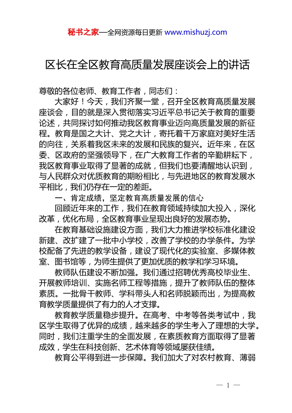 秘书之家—全网资源每日更新 www.mishuzj.com区长在全区教育高质量发展座谈会上的讲话尊敬的各位老师、教育工作者,同志们:大家好!今天,我们齐聚一堂,召开全区教育高质量发展座谈会,目的就是深入贯彻落实习近平总书记关于教育的重要论述,共同探讨如何推动我区教育事业迈向高质量发展的新征程。教育是国之大计、党之大计,寄托着千万家庭对美好生活的向往,关系着我区未来的发展和民族的复兴。近年来,在区委、区政府的坚强领导下,在广大教育工作者的辛勤耕耘下,我区教育事业取得了显著的成就,但我们也要清醒地认识到,与人民群众对优质教育的期盼相比,与先进地区的教育发展水平相比,我们仍存在一定的差距。一、肯定成绩,坚定教育高质量发展的信心回顾近年来的工作,我们在教育领域持续加大投入,深化改革,优化布局,全区教育事业呈现出良好的发展态势。在教育基础设施建设方面,我们大力推进学校标准化建设新建、改扩建了一批中小学校,改善了学校的办学条件。为学校配备了先进的教学设备,建设了现代化的实验室、多媒体教室、图书馆等,为师生提供了更加优质的教学和学习环境。教师队伍建设不断加强。我们通过招聘优秀高校毕业生、开展教师培训、实施名师工程等措施,提升了教师队伍的整体素质。一批骨干教师、学科带头人和名师脱颖而出,为提高教育教学质量提供了有力的人才支撑。教育教学质量稳步提升。在高考、中考等各类考试中,我区学生取得了优异的成绩,越来越多的学生考入了理想的大学。同时,我们注重学生的全面发展,在素质教育方面取得了显著成效,学生在科技创新、艺术体育等领域屡获佳绩。教育公平得到进一步保障。我们加大了对农村教育、薄弱— 1 —秘书之家—全网资源每日更新 www.mishuzj.com学校的扶持力度,推进城乡教育一体化发展。通过实施教育扶贫工程,确保了每一个孩子都能享受到公平而有质量的教育,不让一个孩子因贫失学。二、认清形势,增强教育高质量发展的责任感和紧迫感当前,我们正处于一个快速发展的时代,科技进步日新月异,知识经济方兴未艾。教育作为培养人才的基础工程,面临着新的机遇和挑战。从国际形势来看,全球竞争日益激烈,人才竞争成为核心竞争力。一个国家、一个地区的教育水平,直接关系到其在国际竞争中的地位。我们必须加快教育高质量发展,培养更多具有创新精神和实践能力的高素质人才,才能在国际竞争中立于不败之地。从国内形势来看,我国已进入高质量发展阶段,对教育提出了更高的要求。教育要为经济社会发展提供强大的智力支持和人才保障,必须加快转变发展方式,提高教育质量和效益。从我区实际情况来看,随着经济社会的快速发展,人民群众对优质教育的需求日益增长。我们必须加快推进教育现代化,提高教育质量,满足人民群众对优质教育的期盼。同时,我们也要看到,我区教育还存在一些薄弱环节,如城乡教育发展不平衡、教育资源配置不合理、教师队伍结构有待优化等。这些问题制约了我区教育事业的发展,必须下大力气加以解决。三、明确目标,推动教育高质量发展的重点任务(一)坚持立德树人,培养德智体美劳全面发展的社会主义建设者和接班人教育的根本任务是立德树人。我们要把立德树人融入思想道德教育、文化知识教育、社会实践教育各环节,贯穿基础教育、职业教育、高等教育各领域。要加强思想政治教育,引导学生树立正确的世界观、人生观、价值观,培养学生的爱国情怀、社会责任感和创新精神。要加强体育、美育和劳动教育,— 2 —秘书之家—全网资源每日更新 www.mishuzj.com促进学生的全面发展。(二)深化教育改革,激发教育发展的活力改革是教育发展的强大动力。我们要深化教育体制机制改革,破除制约教育发展的体制机制障碍。要推进教育评价改革,建立科学的教育评价体系,克服唯分数、唯升学、唯文凭、唯论文、唯帽子的顽瘴痼疾。要深化课程改革,优化课程设置,更新教学内容,提高课程的适应性和实效性。要推进教育教学方法改革,倡导启发式、探究式、讨论式、参与式教学,培养学生的自主学习能力和创新思维。(三)加强教师队伍建设,提高教师的整体素质教师是教育发展的第一资源。我们...