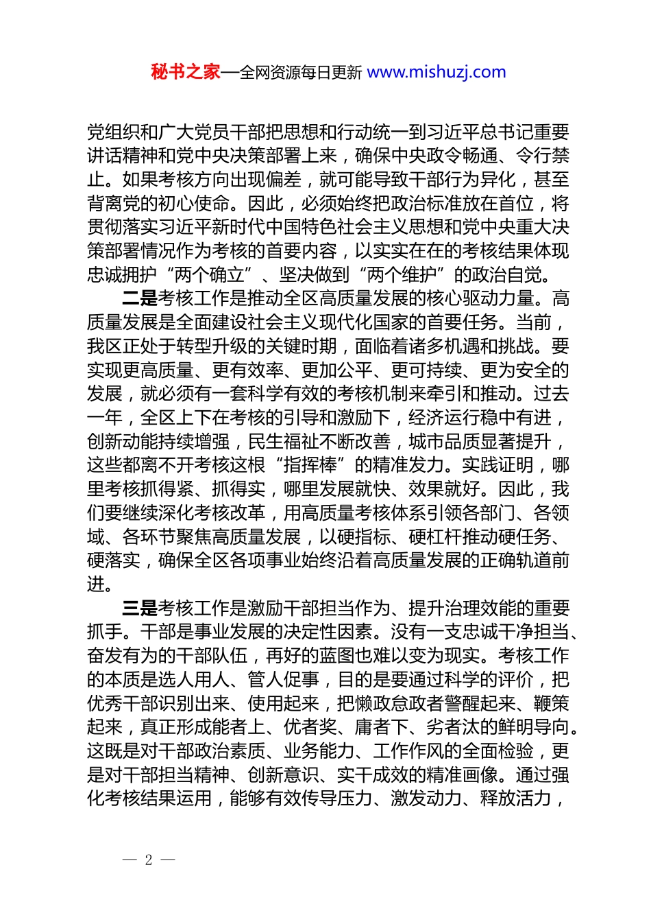 秘书之家—全网资源每日更新 www.mishuzj.com区委书记在全区考核工作会议上的讲话同志们:今天,我们召开全区考核工作会议,主要任务是深入学习贯彻习近平总书记关于考核工作的重要论述精神,全面落实中央、省委、市委关于绩效考核的各项部署要求,总结过去一年的考核工作,分析当前面临的新形势新任务,部署今年全区考核工作重点,进一步统一思想、提高认识、明确方向,以科学有效的考核机制推动全区经济社会高质量发展,为加快建设社会主义现代化新城区提供坚实保障。刚才,区考核办的同志通报了 2024 年度全区目标责任考核情况,对取得的成绩给予了充分肯定,也指出了需要改进和加强的方面。各部门、各单位要认真对照,深入查找自身不足,切实加以改进。下面,我讲几点意见。一、深刻认识考核工作的重大意义,切实把思想和行动统一到中央和省市委要求上来考核是推动工作落实的“指挥棒”,是激发干部活力的“助推器”,更是检验发展成效的“试金石”。进入新时代,以习近平同志为核心的党中央高度重视考核工作,强调要发挥考核指挥棒作用,树立鲜明用人导向,激励干部担当作为。省委、市委也围绕高质量发展,持续完善考核体系,力求通过精准考核,引导各地各部门聚焦主责主业、真抓实干。全区上下要从战略和全局的高度,深刻认识新时代考核工作的极端重要性,切实增强抓好考核工作的政治自觉、思想自觉和行动自觉。一是考核工作是坚定不移做到“两个维护”的重大政治任务。党的领导是社会主义现代化建设的根本保证,而考核工作正是将党的路线方针政策和中央重大决策部署转化为具体行动、衡量落实成效的重要手段。通过科学考核,能够有效引导各级— 1 —秘书之家—全网资源每日更新 www.mishuzj.com党组织和广大党员干部把思想和行动统一到习近平总书记重要讲话精神和党中央决策部署上来,确保中央政令畅通、令行禁止。如果考核方向出现偏差,就可能导致干部行为异化,甚至背离党的初心使命。因此,必须始终把政治标准放在首位,将贯彻落实习近平新时代中国特色社会主义思想和党中央重大决策部署情况作为考核的首要内容,以实实在在的考核结果体现忠诚拥护“两个确立”、坚决做到“两个维护”的政治自觉。二是考核工作是推动全区高质量发展的核心驱动力量。高质量发展是全面建设社会主义现代化国家的首要任务。当前,我区正处于转型升级的关键时期,面临着诸多机遇和挑战。要实现更高质量、更有效率、更加公平、更可持续、更为安全的发展,就必须有一套科学有效的考核机制来牵引和推动。过去一年,全区上下在考核的引导和激励下,经济运行稳中有进,创新动能持续增强,民生福祉不断改善,城市品质显著提升,这些都离不开考核这根“指挥棒”的精准发力。实践证明,哪里考核抓得紧、抓得实,哪里发展就快、效果就好。因此,我们要继续深化考核改革,用高质量考核体系引领各部门、各领域、各环节聚焦高质量发展,以硬指标、硬杠杆推动硬任务、硬落实,确保全区各项事业始终沿着高质量发展的正确轨道前进。三是考核工作是激励干部担当作为、提升治理效能的重要抓手。干部是事业发展的决定性因素。没有一支忠诚干净担当、奋发有为的干部队伍,再好的蓝图也难以变为现实。考核工作的本质是选人用人、管人促事,目的是要通过科学的评价,把优秀干部识别出来、使用起来,把懒政怠政者警醒起来、鞭策起来,真正形成能者上、优者奖、庸者下、劣者汰的鲜明导向。这既是对干部政治素质、业务能力、工作作风的全面检验,更是对干部担当精神、创新意识、实干成效的精准画像。通过强化考核结果运用,能够有效传导压力、激发动力、释放活力,— 2 —秘书之家—全网资源每日更新 www.mishuzj.com让想干事、能干事、干成事的干部有舞台、有奔头,让混日子、不作为的干部坐不住、站不稳,从而全面提升我区的治理体系和治理能力现代化水平。二、准确把握考核工作导向,确保全区各项事业沿着正确方向前进考核工作的生命力在于导向的科学性和正确性。只有导向鲜明、精准有力,才能真正考出精气神、考出高质量、考出新作为。全区各级党组织和广大干部要牢固树立正确的政绩观,准确把握考核导向...