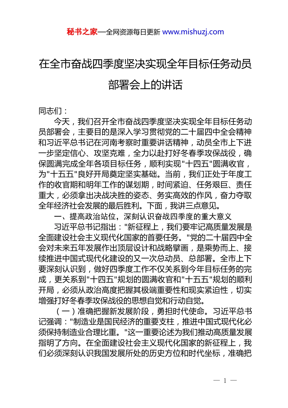 秘书之家—全网资源每日更新 www.mishuzj.com在全市奋战四季度坚决实现全年目标任务动员部署会上的讲话同志们:今天,我们召开全市奋战四季度坚决实现全年目标任务动员部署会,主要目的是深入学习贯彻党的二十届四中全会精神和习近平总书记在河南考察时重要讲话精神,动员全市上下进一步坚定信心、攻坚克难,全力以赴打好冬春季攻保战役,确保圆满完成全年各项目标任务,顺利实现"十四五"圆满收官,为"十五五"良好开局奠定坚实基础。当前,我们正处于年度工作的收官期和明年工作的谋划期,时间紧迫、任务艰巨、责任重大,必须拿出决战决胜的姿态、务实高效的作风,奋力夺取全年经济社会发展的最后胜利。下面,我讲三点意见。一、提高政治站位,深刻认识奋战四季度的重大意义习近平总书记指出:"新征程上,我们要牢记高质量发展是全面建设社会主义现代化国家的首要任务。"党的二十届四中全会对未来五年发展作出顶层设计和战略擘画,是乘势而上、接续推进中国式现代化建设的又一次总动员、总部署。全市上下要深刻认识到,做好四季度工作不仅关系到今年目标任务的完成,更关系到"十四五"规划的圆满收官和"十五五"规划的顺利开局,必须从政治高度把握其极端重要性和现实紧迫性,切实增强打好冬春季攻保战役的思想自觉和行动自觉。(一)准确把握新发展阶段,勇担时代使命。习近平总书记强调:"制造业是国民经济的重要支柱,推进中国式现代化必须保持制造业合理比重。"这一重要论述为我们推动高质量发展指明了方向。在全面建设社会主义现代化国家的新征程上,我们必须深刻认识我国发展所处的历史方位和时代坐标,准确把— 1 —秘书之家—全网资源每日更新 www.mishuzj.com握新发展阶段的内涵特征和实践要求。当前,我国经济长期向好的基本面没有改变,但面临的国内外环境依然复杂严峻。我们要科学研判形势,保持战略定力,增强忧患意识,准确把握经济发展规律,不断提高推动高质量发展的能力和水平。全市上下要切实把思想和行动统一到党中央对经济形势的科学判断和决策部署上来,坚持稳中求进工作总基调,完整、准确、全面贯彻新发展理念,加快构建新发展格局,着力推动高质量发展。进入新发展阶段,我市发展面临新的战略机遇和挑战。我们要深刻认识我国社会主要矛盾变化带来的新特征新要求,深刻认识国际国内环境变化带来的新矛盾新挑战,增强机遇意识和风险意识,准确识变、科学应变、主动求变。要立足当前,着眼长远,坚持问题导向和目标导向相结合,着力破解发展难题,增强发展动力,厚植发展优势。要把贯彻落实党的二十届四中全会精神与做好当前工作紧密结合起来,以更高的政治站位、更强的责任担当、更实的工作举措,全力以赴抓好四季度各项工作,确保党中央决策部署在我市落地生根、开花结果。面对新形势新任务,我们要始终保持清醒头脑,既要看到我市经济发展取得的显著成就,也要清醒认识到存在的短板和不足。当前,我市经济保持了稳中有进、稳中提质的良好态势,但稳中承压,困难挑战不容回避。我们要坚定信心,迎难而上,牢牢把握经济工作主动权。要坚持以人民为中心的发展思想,把增进民生福祉作为发展的根本目的,让改革发展成果更多更公平惠及全体人民。要统筹发展和安全,有效防范化解各种风险挑战,为高质量发展创造安全稳定的环境。(二)深入贯彻新发展理念,引领高质量发展。习近平总书记指出:"要持之以恒加强重点流域生态保护治理,深化污染防治攻坚,筑牢生态安全屏障。"这一重要论述深刻阐明了生态文明建设的极端重要性。新发展理念是一个系统的理论体系,回答了关于发展的目的、动力、方式、路径等一系列理论和实— 2 —秘书之家—全网资源每日更新 www.mishuzj.com践问题,阐明了我们党关于发展的政治立场、价值导向、发展模式、发展道路等重大政治问题。全市上下必须完整、准确、全面贯彻新发展理念,将其贯穿经济社会发展全过程和各领域。坚持创新发展,要把科技创新摆在发展全局的核心位置,以科技创新引领产业创新,加快培育新动能、新优势。要加大研发投入,完善创新体系,优化创新生态,促进科技与经济深度融合。要聚焦我市主导产业和战略性新兴...
