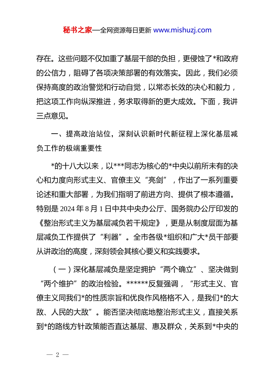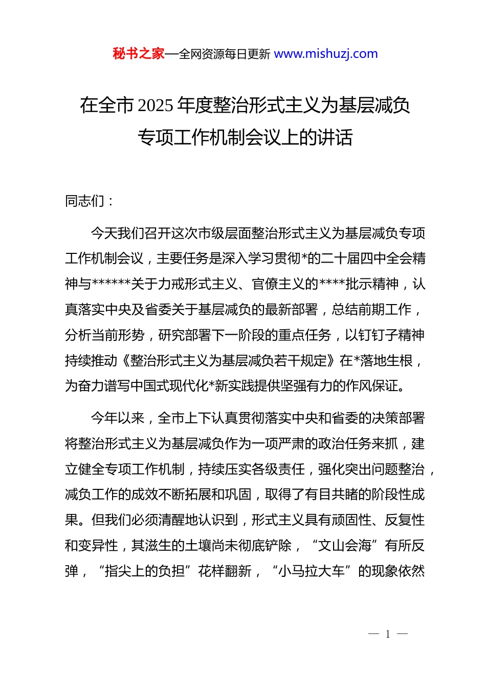 秘书之家—全网资源每日更新 www.mishuzj.com在全市 2025 年度整治形式主义为基层减负专项工作机制会议上的讲话同志们:今天我们召开这次市级层面整治形式主义为基层减负专项工作机制会议,主要任务是深入学习贯彻*的二十届四中全会精神与******关于力戒形式主义、官僚主义的****批示精神,认真落实中央及省委关于基层减负的最新部署,总结前期工作,分析当前形势,研究部署下一阶段的重点任务,以钉钉子精神持续推动《整治形式主义为基层减负若干规定》在*落地生根,为奋力谱写中国式现代化*新实践提供坚强有力的作风保证。今年以来,全市上下认真贯彻落实中央和省委的决策部署将整治形式主义为基层减负作为一项严肃的政治任务来抓,建立健全专项工作机制,持续压实各级责任,强化突出问题整治,减负工作的成效不断拓展和巩固,取得了有目共睹的阶段性成果。但我们必须清醒地认识到,形式主义具有顽固性、反复性和变异性,其滋生的土壤尚未彻底铲除,“文山会海”有所反弹,“指尖上的负担”花样翻新,“小马拉大车”的现象依然— 1 —秘书之家—全网资源每日更新 www.mishuzj.com存在。这些问题不仅加重了基层干部的负担,更侵蚀了*和政府的公信力,阻碍了各项决策部署的有效落实。因此,我们必须保持高度的政治警觉和行动自觉,以常态长效的决心和毅力,把这项工作向纵深推进,务求取得新的更大成效。下面,我讲三点意见。一、提高政治站位,深刻认识新时代新征程上深化基层减负工作的极端重要性*的十八大以来,以***同志为核心的*中央以前所未有的决心和力度向形式主义、官僚主义“亮剑”,作出了一系列重要论述和重大部署,为我们指明了前进方向、提供了根本遵循。特别是 2024 年 8 月 1 日中共中央办公厅、国务院办公厅印发的《整治形式主义为基层减负若干规定》,更是从制度层面为基层减负工作提供了“利器”。全市各级*组织和广大*员干部要从讲政治的高度,深刻领会其核心要义和实践要求。(一)深化基层减负是坚定拥护“两个确立”、坚决做到“两个维护”的政治检验。******反复强调,“形式主义、官僚主义同我们*的性质宗旨和优良作风格格不入,是我们*的大敌、人民的大敌”。能否坚决彻底地整治形式主义,直接关系到*的路线方针政策能否直达基层、惠及群众,关系到*中央的— 2 —秘书之家—全网资源每日更新 www.mishuzj.com决策部署能否不折不扣地落到实处。这是一道政治“必答题”,而不是可做可不做的“选答题”。当前,我们正处在推进中国式现代化*新实践的关键时期,任务艰巨、使命光荣。如果任由形式主义蔓延,就会导致政令不畅、执行梗阻,最终损害的是发展大局和人民利益。因此,全市上下必须将思想和行动统一到中央和省委的决策部署上来,将深化基层减负作为具体的政治实践,以实际行动体现对*中央的绝对忠诚。(二)深化基层减负是树立和践行正确政绩观的内在要求政绩为谁而树、树什么样的政绩、靠什么树政绩,是检验*员干部*性纯不纯、政绩观正不正的“试金石”。形式主义的根源在于政绩观错位、责任心缺失。有的干部热衷于做表面文章,搞“花架子”,追求所谓的“显绩”,却忽视了打基础、利长远的“潜绩”;有的单位为了应付检查、迎接评比,层层加码,数据造假,把精力和资源耗费在无谓的材料堆砌和迎检套路上。这种扭曲的政绩观,严重背离了实事求是的思想路线。我们必须牢固树立和践行正确政绩观,坚持发展为了人民、发展依靠人民、发展成果由人民共享,把工作重心真正放到察实情、出实招、办实事、求实效上。要严守数据真实的底线,坚决杜绝统计造假、数字游戏,确保每一项工作都经得起历史和人民的— 3 —秘书之家—全网资源每日更新 www.mishuzj.com检验。(三)深化基层减负是激发基层干部干事创业活力的关键举措。基层是政策落实的“最后一公里”,基层干部是推动发展、服务群众的主力军。然而,长期以来,各种不必要的会议、文件、督查、考核、报表,像一道道无形的枷锁,捆住了基层干部的手脚,耗费了他们大量的宝贵时间和精力。上面千条线,下面一根针。当基层干部整日埋首于“文山会海”,疲于应付各种检查评比,他们哪有时...