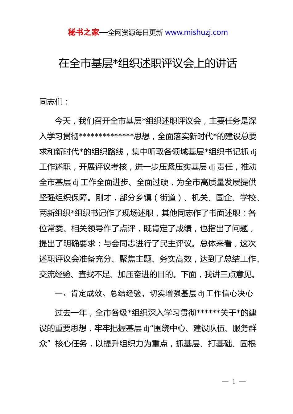 秘书之家—全网资源每日更新 www.mishuzj.com在全市基层*组织述职评议会上的讲话同志们:今天,我们召开全市基层*组织述职评议会,主要任务是深入学习贯彻**************思想,全面落实新时代*的建设总要求和新时代*的组织路线,集中听取各领域基层*组织书记抓 dj工作述职,开展评议考核,进一步压紧压实基层 dj 责任,推动全市基层 dj 工作全面进步、全面过硬,为全市高质量发展提供坚强组织保障。刚才,部分乡镇(街道)、机关、国企、学校、两新组织*组织书记作了现场述职,其他同志作了书面述职;各位常委、相关领导作了点评,既肯定了成绩,也指出了问题,提出了明确要求;与会同志进行了民主评议。总体来看,这次述职评议会准备充分、聚焦主题、务实高效,达到了总结工作、交流经验、查找不足、加压奋进的目的。下面,我讲三点意见。一、肯定成效、总结经验,切实增强基层 dj 工作信心决心过去一年,全市各级*组织深入学习贯彻******关于*的建设的重要思想,牢牢把握基层 dj“围绕中心、建设队伍、服务群众”核心任务,以提升组织力为重点,抓基层、打基础、固根— 1 —秘书之家—全网资源每日更新 www.mishuzj.com本,各项工作取得了阶段性成效,为全市经济社会发展提供了有力支撑。概括起来,主要有三个方面的突出亮点:(一)强化政治建设,筑牢思想根基,基层*组织政治功能持续增强。一是理论武装走深走实。各级*组织严格落实“第一议题”制度,把学习贯彻**************思想作为首要政治任务,组织开展*委(*组)理论学习中心组学习 1200 余次、专题研讨 480 余次,举办“基层*组织书记论坛”“dj 业务培训班”等活动 65 场,覆盖*员干部 8.6 万人次。创新“线上+线下”学习模式,依托“学习强国”“dj 云平台”等载体推送学习资源3.2 万条,开展“送学上门”服务 2.3 万次,推动*的创新理论进基层、进支部、进*员头脑。二是政治生活严肃规范。严格执行“三会一课”、组织生活会、民主评议*员等制度,全市基层*组织召开组织生活会 4200 余场,开展民主评议*员 15 万余人次。各级*组织书记带头讲授专题*课 1.8 万堂,带头参加所在支部组织生活,推动*内政治生活常态化、规范化。三是意识形态阵地牢固。健全基层意识形态工作责任制,开展意识形态领域风险排查 36 次,整改问题 156 个。加强基层宣传思想文化阵地建设,打造新时代文明实践中心(所、站)380 个,开展“红色故事宣讲”“先进典型巡讲”等活动 320 场,引导基层*— 2 —秘书之家—全网资源每日更新 www.mishuzj.com员群众增强“四个意识”、坚定“四个自信”、做到“两个维护”。(二)夯实组织基础,提升建设水平,基层*组织战斗堡垒作用充分彰显。一是组织覆盖持续扩大。聚焦农村、社区、机关、国企、学校、两新组织等各领域,持续推进“两个覆盖”提质增效,新建两新组织*组织 186 个,整顿软弱涣散基层*组织 89 个,实现*的组织和工作在重点领域、关键环节应建尽建、全面覆盖。深化基层*组织标准化规范化建设,创建市级示范*组织 280 个、省级示范*组织 45 个,基层*组织建设质量显著提升。二是队伍建设不断加强。严格*员发展程序,全年发展新*员 2300 余名,其中 35 岁以下青年*员占比达 68%,*员队伍结构持续优化。开展基层*组织书记“领头雁”培育工程,选拔优秀*员担任基层*组织书记,组织赴先进地区考察学习 12 批次,提升基层*组织书记履职能力。健全*员教育管理机制,开展*员“积分制”管理试点,激励*员发挥先锋模范作用。三是阵地功能更加完善。投入资金 2.8 亿元,升级改造基层*组织活动阵地420 个,建成集*务服务、政务服务、民生服务于一体的“一站式”*群服务中心 350 个。推动阵地资源整合共享,拓展“dj+文化”“dj+服务”等功能,基层*组织活动阵地成为凝聚*员、— 3 —秘书之家—全网资源每日更新 www.mishuzj.com服务群众的“红色堡垒”。(三)聚焦中心大局,服务发展民生,基层 dj 引领作用有效发挥。一是引领乡村振兴提质增效。深化“dj+乡村振兴”模式,选派 1200 余名机关干部下沉基层担任驻村第一书记和工...