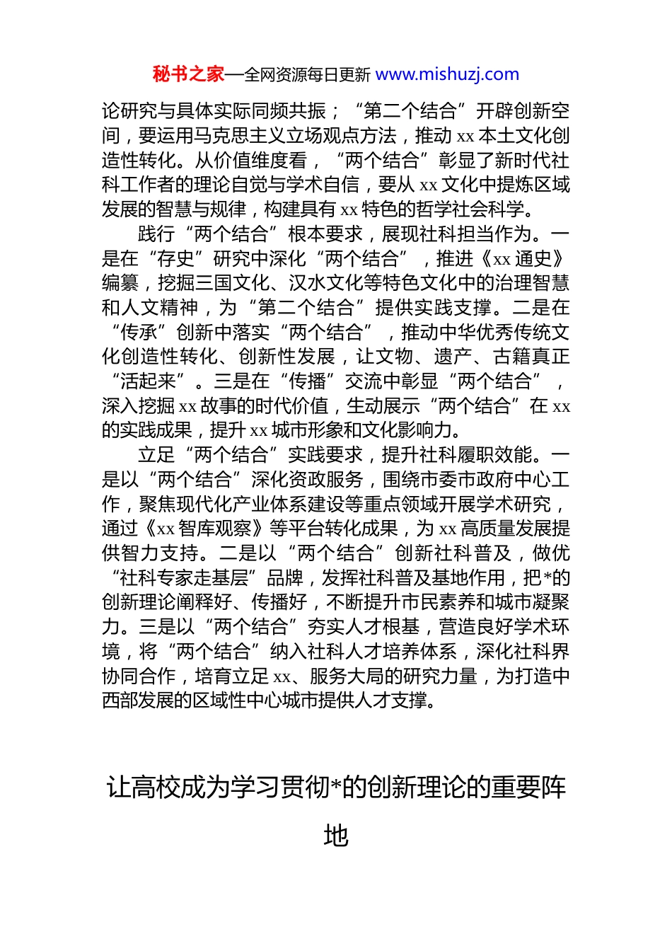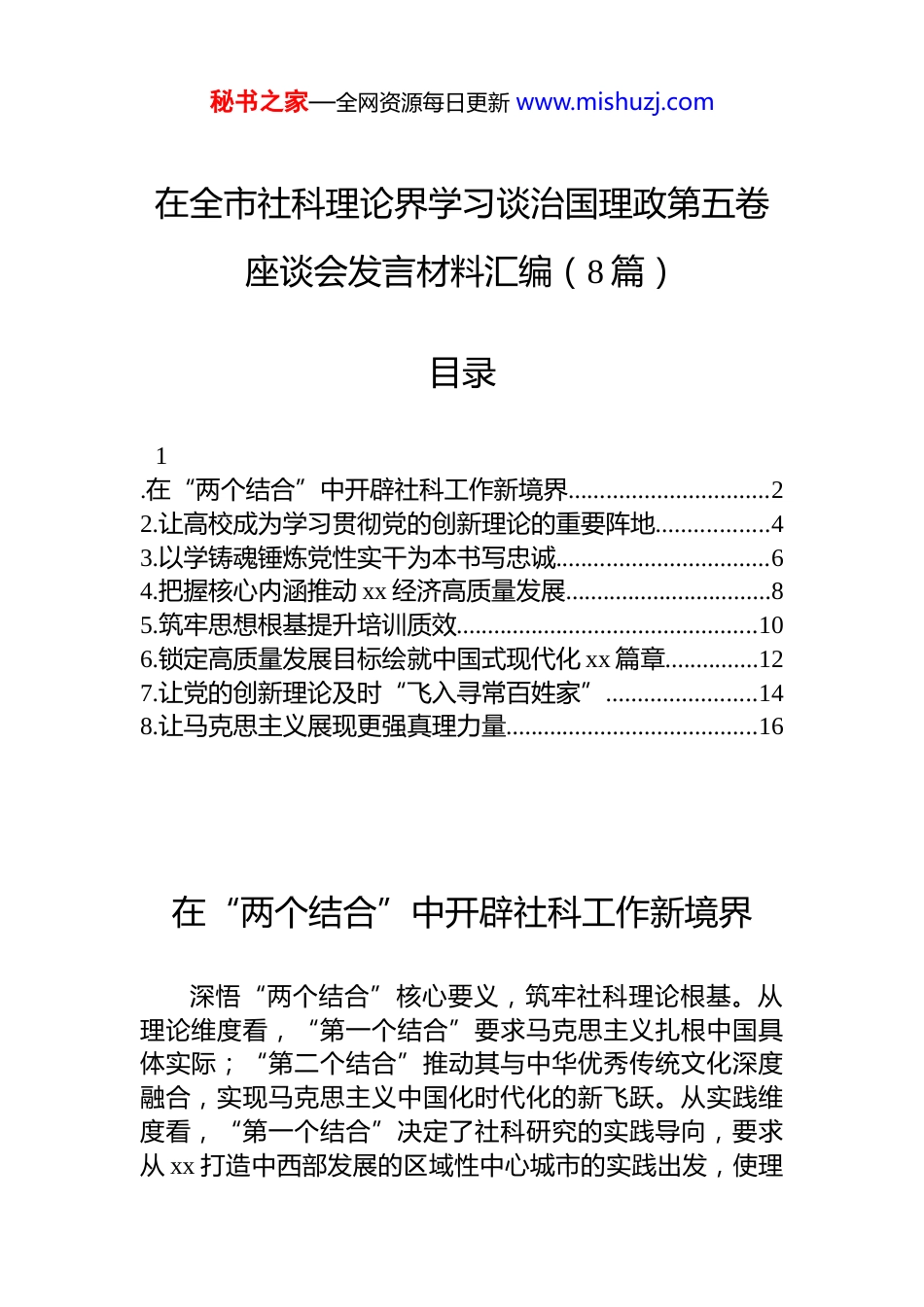 秘书之家—全网资源每日更新 www.mishuzj.com在全市社科理论界学习谈治国理政第五卷座谈会发言材料汇编(8 篇)目录1.在“两个结合”中开辟社科工作新境界................................22.让高校成为学习贯彻党的创新理论的重要阵地..................43.以学铸魂锤炼党性实干为本书写忠诚..................................64.把握核心内涵推动 xx 经济高质量发展.................................85.筑牢思想根基提升培训质效................................................106.锁定高质量发展目标绘就中国式现代化 xx 篇章...............127.让党的创新理论及时“飞入寻常百姓家”........................148.让马克思主义展现更强真理力量........................................16在“两个结合”中开辟社科工作新境界深悟“两个结合”核心要义,筑牢社科理论根基。从理论维度看,“第一个结合”要求马克思主义扎根中国具体实际;“第二个结合”推动其与中华优秀传统文化深度融合,实现马克思主义中国化时代化的新飞跃。从实践维度看,“第一个结合”决定了社科研究的实践导向,要求从 xx 打造中西部发展的区域性中心城市的实践出发,使理秘书之家—全网资源每日更新 www.mishuzj.com论研究与具体实际同频共振;“第二个结合”开辟创新空间,要运用马克思主义立场观点方法,推动 xx 本土文化创造性转化。从价值维度看,“两个结合”彰显了新时代社科工作者的理论自觉与学术自信,要从 xx 文化中提炼区域发展的智慧与规律,构建具有 xx 特色的哲学社会科学。践行“两个结合”根本要求,展现社科担当作为。一是在“存史”研究中深化“两个结合”,推进《xx 通史》编纂,挖掘三国文化、汉水文化等特色文化中的治理智慧和人文精神,为“第二个结合”提供实践支撑。二是在“传承”创新中落实“两个结合”,推动中华优秀传统文化创造性转化、创新性发展,让文物、遗产、古籍真正“活起来”。三是在“传播”交流中彰显“两个结合”,深入挖掘 xx 故事的时代价值,生动展示“两个结合”在 xx的实践成果,提升 xx 城市形象和文化影响力。立足“两个结合”实践要求,提升社科履职效能。一是以“两个结合”深化资政服务,围绕市委市政府中心工作,聚焦现代化产业体系建设等重点领域开展学术研究,通过《xx 智库观察》等平台转化成果,为 xx 高质量发展提供智力支持。二是以“两个结合”创新社科普及,做优“社科专家走基层”品牌,发挥社科普及基地作用,把*的创新理论阐释好、传播好,不断提升市民素养和城市凝聚力。三是以“两个结合”夯实人才根基,营造良好学术环境,将“两个结合”纳入社科人才培养体系,深化社科界协同合作,培育立足 xx、服务大局的研究力量,为打造中西部发展的区域性中心城市提供人才支撑。让高校成为学习贯彻*的创新理论的重要阵地秘书之家—全网资源每日更新 www.mishuzj.com《***谈治国理政》第五卷系统阐述了中国式现代化、新质生产力、教育科技人才事业等一系列重大主题。作为高校教育工作者,我们要深刻领悟这部著作的核心要义与实践要求,将其贯彻落实到办学治校全过程各方面提高政治站位,深刻领悟《***谈治国理政》第五卷的核心要义与实践要求。第五卷展现了马克思主义中国化时代化的最新成果,阐述了中国式现代化等重大主题。高校肩负着培养人才、提供科技支撑等重要使命,应把学习宣传贯彻第五卷作为重大政治任务,与学习贯彻******关于教育的重要论述相结合,落实立德树人根本任务,扎实推进高水平应用型综合性大学建设,为 xx 打造中西部发展的区域性中心城市、xx 建成中部地区崛起的重要战略支点作出积极贡献。坚守育人初心,把立德树人根本任务落到实处。要强化思想引领,筑牢信仰根基。要用**************思想铸魂育人,落实“思想引领、学习在先”机制,推进第五卷“三进”工作,将社会主义核心价值观贯穿教育教学全过程,引导学生成长为时代新人。要推进思政创新,提升育人质效。深入实施新时代立德树人工程,健全“大思政”工作格局,促进思政课改革创新,打造具有 xx 特色的思政品牌。要扎根区...
