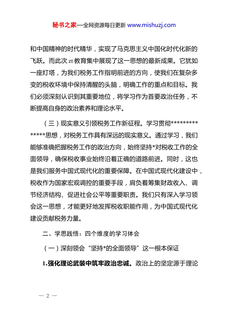 秘书之家—全网资源每日更新 www.mishuzj.com在全市税务系统学习交流会上的讲话同志们:在全*深入开展学习贯彻**************思想 zt 教育之际,我们召开这次全市税务系统学习交流会,具有极其重要的意义。下面,我围绕近期的学习情况,和大家交流分享一些体会。一、掀起学习热潮:背景、形式与意义(一)多元学习形式激发学习活力。为全面深入学习贯彻**************思想,全市税务系统积极采用多种学习形式。一方面,鼓励个人自学,为每位干部发放学习资料,要求大家利用业余时间开展“每日一读”“每周一悟”活动,确保在自学中不断沉淀知识、感悟思想。另一方面,组织开展专题研讨,针对税费政策落实、纳税服务优化等重点工作,分批次、分小组进行研讨,大家畅所欲言、各抒己见,在思维的碰撞中凝聚共识。此外,还举办了主题讲座、线上学习平台互动等活动,全方位营造浓厚的学习氛围。(二)重要地位凸显学习核心价值。**************思想是当代中国马克思主义、二十一世纪马克思主义,是中华文化— 1 —秘书之家—全网资源每日更新 www.mishuzj.com和中国精神的时代精华,实现了马克思主义中国化时代化新的飞跃。而此次 zt 教育集中展现了这一思想的最新成果。它犹如一座灯塔,为我们税务工作指明前进的方向,使我们在复杂多变的税收环境中保持清醒的头脑,明确工作的重点和目标。我们必须深刻认识到其重要地位,将学习作为首要政治任务,不断提高自身的政治素养和理论水平。(三)现实意义引领税务工作新征程。学习贯彻**************思想,对税务工作具有深远的现实意义。通过学习,我们能够准确把握税务工作的政治方向,始终坚持*对税收工作的全面领导,确保税收事业始终沿着正确的道路前进。同时,这也是我们服务中国式现代化的重要保障。在中国式现代化建设中,税收作为国家宏观调控的重要手段,肩负着筹集财政收入、调节经济结构、促进社会公平等重要职责。我们只有深入学习领会这一思想,才能更好地发挥税收职能作用,为中国式现代化建设贡献税务力量。二、学思践悟:四个维度的学习体会(一)深刻领会“坚持*的全面领导”这一根本保证1.强化理论武装中筑牢政治忠诚。政治上的坚定源于理论— 2 —秘书之家—全网资源每日更新 www.mishuzj.com上的清醒。我们要把学习贯彻**************思想作为首要政治任务,通过集中学习、个人自学、专题培训等方式,不断加深对*的创新理论的理解和掌握。要坚持读原著、学原文、悟原理,深刻领会其核心要义、精神实质、丰富内涵和实践要求,切实增强“四个意识”、坚定“四个自信”、做到“两个维护”。在日常工作中,要时刻保持对*的忠诚,自觉在思想上、政治上、行动上同以***同志为核心的*中央保持高度一致,做到*中央提倡的坚决响应、*中央决定的坚决执行、*中央禁止的坚决不做。2.完善体制机制中落实*的领导。要进一步完善*对税收工作全面领导的体制机制,确保*的路线方针政策和决策部署在税务系统得到不折不扣的贯彻落实。要加强各级税务局*委建设,充分发挥*委把方向、管大局、保落实的领导作用。建立健全*委议事规则和决策程序,严格执行民主集中制,确保决策的科学性、民主性和合法性。同时,要加强*支部标准化、规范化建设,充分发挥*支部的战斗堡垒作用和*员的先锋模范作用,推动*的领导在税务系统基层落地生根。3.应对风险挑战中检验政治能力。当前,税务工作面临着诸多风险挑战,如经济形势变化、税收政策调整、征管改革推— 3 —秘书之家—全网资源每日更新 www.mishuzj.com进等。在应对这些风险挑战的过程中,我们要不断提高政治能力,善于从政治上观察和处理问题,始终保持政治敏锐性和政治鉴别力。要增强忧患意识、风险意识,提高防控风险能力,善于在危机中育先机、于变局中开新局。要敢于担当、勇于负责,在关键时刻站得出来、顶得上去,以实际行动诠释对*的忠诚和对税收事业的担当。(二)准确把握“以人民为中心”这一根本立场1.将“人民至上”融入税费政策制定落实全过程。在税费政策制定过程中,要充分考虑人民群众的利益和需求,广泛征求社会各界的意见和建议,使政策更加科学合理、公平公正。...