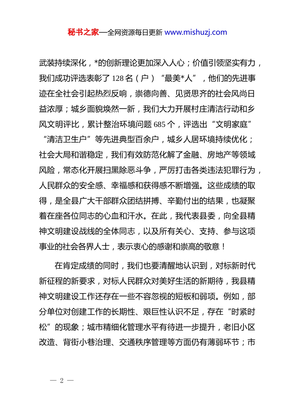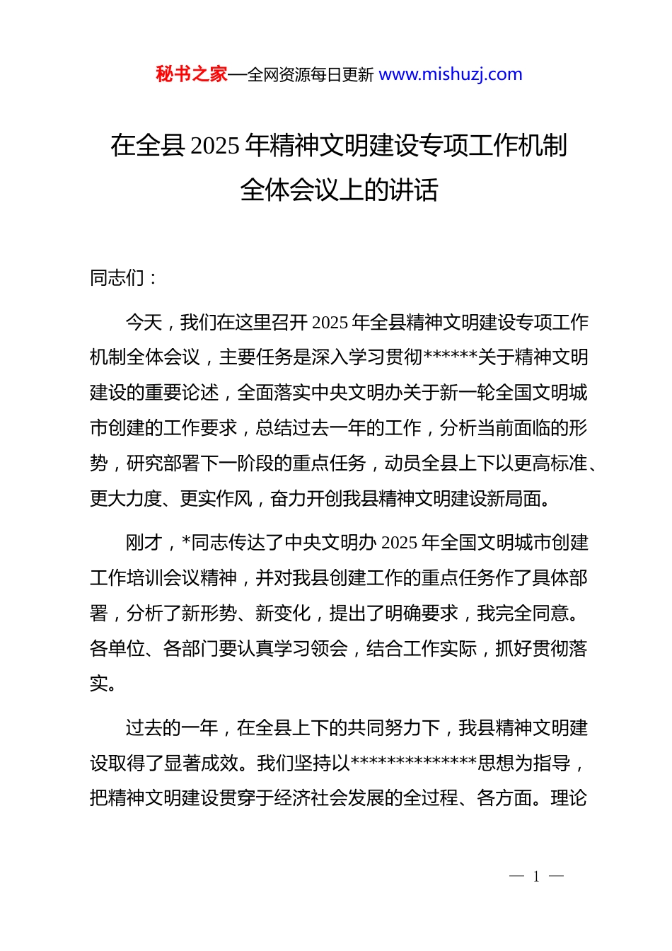 秘书之家—全网资源每日更新 www.mishuzj.com在全县 2025 年精神文明建设专项工作机制全体会议上的讲话同志们:今天,我们在这里召开 2025 年全县精神文明建设专项工作机制全体会议,主要任务是深入学习贯彻******关于精神文明建设的重要论述,全面落实中央文明办关于新一轮全国文明城市创建的工作要求,总结过去一年的工作,分析当前面临的形势,研究部署下一阶段的重点任务,动员全县上下以更高标准、更大力度、更实作风,奋力开创我县精神文明建设新局面。刚才,*同志传达了中央文明办 2025 年全国文明城市创建工作培训会议精神,并对我县创建工作的重点任务作了具体部署,分析了新形势、新变化,提出了明确要求,我完全同意。各单位、各部门要认真学习领会,结合工作实际,抓好贯彻落实。过去的一年,在全县上下的共同努力下,我县精神文明建设取得了显著成效。我们坚持以**************思想为指导,把精神文明建设贯穿于经济社会发展的全过程、各方面。理论— 1 —秘书之家—全网资源每日更新 www.mishuzj.com武装持续深化,*的创新理论更加深入人心;价值引领坚实有力,我们成功评选表彰了 128 名(户)“最美*人”,他们的先进事迹在全社会引起热烈反响,崇德向善、见贤思齐的社会风尚日益浓厚;城乡面貌焕然一新,我们大力开展村庄清洁行动和乡风文明评比,累计整治环境问题 685 个,评选出“文明家庭”“清洁卫生户”等先进典型百余户,城乡人居环境持续优化;社会大局和谐稳定,我们有效防范化解了金融、房地产等领域风险,常态化开展扫黑除恶斗争,严厉打击各类违法犯罪行为,人民群众的安全感、幸福感和获得感不断增强。这些成绩的取得,是全县广大干部群众团结拼搏、辛勤付出的结果,也凝聚着在座各位同志的心血和汗水。在此,我代表县委,向全县精神文明建设战线的全体同志,以及所有关心、支持、参与这项事业的社会各界人士,表示衷心的感谢和崇高的敬意!在肯定成绩的同时,我们也要清醒地认识到,对标新时代新征程的新要求,对标人民群众对美好生活的新期待,我县精神文明建设工作还存在一些不容忽视的短板和弱项。例如,部分单位对创建工作的长期性、艰巨性认识不足,存在“时紧时松”的现象;城市精细化管理水平有待进一步提升,老旧小区改造、背街小巷治理、交通秩序管理等方面仍有薄弱环节;市— 2 —秘书之家—全网资源每日更新 www.mishuzj.com民文明素养和城乡文明程度仍有较大提升空间,一些不文明行为还时有发生;工作机制的协同性、联动性还不够强,部门之间“各自为战”的问题依然存在。这些问题,是我们下一步工作中必须下大力气解决的。同志们,精神文明是现代化建设的重要内容和显著标志。*的二十大擘画了以中国式现代化全面推进中华民族伟大复兴的宏伟蓝图,强调物质文明和精神文明相协调。文明城市创建,不仅仅是为了一块牌子,更是提升县域治理水平、增进人民福祉、优化发展环境、塑造城市品牌的重要抓手。全县上下必须从战略和全局的高度,深刻认识新形势下加强精神文明建设的极端重要性,以志在必得的决心和久久为功的韧劲,全力推动我县精神文明建设再上新台阶。下面,我讲三点意见。一、提高政治站位,深化思想认识,以高度的责任感和使命感投身精神文明建设伟大实践思想是行动的先导。做好新时代精神文明建设工作,首要的是解决好“为什么抓”和“为谁抓”的问题,不断增强抓好这项工作的思想自觉、政治自觉和行动自觉。(一)深刻认识精神文明建设是贯彻落实******重要论述— 3 —秘书之家—全网资源每日更新 www.mishuzj.com的必然要求。******指出,“当高楼大厦在我国大地上遍地林立时,中华民族精神的大厦也应该巍然耸立”。这一重要论述深刻揭示了物质文明与精神文明协调发展的辩证关系。加强精神文明建设,是我们坚定拥护“两个确立”、坚决做到“两个维护”的具体体现。全县各级*组织和广大*员干部必须把思想和行动统一到***的重要论述上来,把精神文明建设摆在全局工作的重要位置,与经济社会发展同谋划、同部署、同推进,确保中央和省委、市委的决策部署在*落地生根、开花结果。(二)深刻认识到精神文明建...