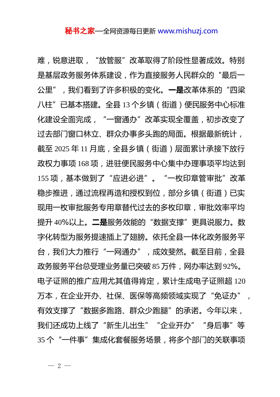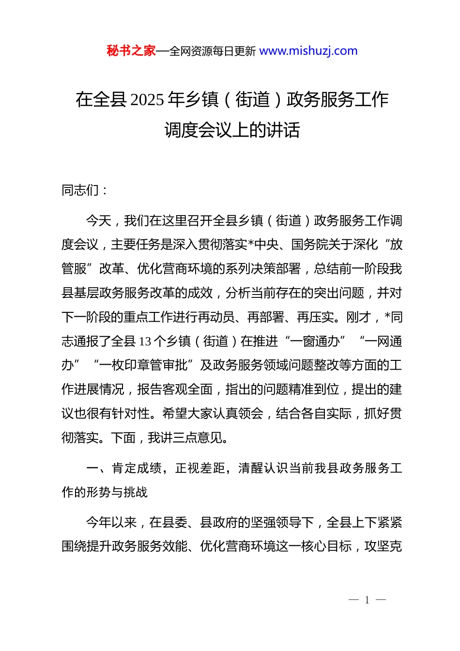 秘书之家—全网资源每日更新 www.mishuzj.com在全县 2025 年乡镇(街道)政务服务工作调度会议上的讲话同志们:今天,我们在这里召开全县乡镇(街道)政务服务工作调度会议,主要任务是深入贯彻落实*中央、国务院关于深化“放管服”改革、优化营商环境的系列决策部署,总结前一阶段我县基层政务服务改革的成效,分析当前存在的突出问题,并对下一阶段的重点工作进行再动员、再部署、再压实。刚才,*同志通报了全县 13 个乡镇(街道)在推进“一窗通办”“一网通办”“一枚印章管审批”及政务服务领域问题整改等方面的工作进展情况,报告客观全面,指出的问题精准到位,提出的建议也很有针对性。希望大家认真领会,结合各自实际,抓好贯彻落实。下面,我讲三点意见。一、肯定成绩,正视差距,清醒认识当前我县政务服务工作的形势与挑战今年以来,在县委、县政府的坚强领导下,全县上下紧紧围绕提升政务服务效能、优化营商环境这一核心目标,攻坚克— 1 —秘书之家—全网资源每日更新 www.mishuzj.com难,锐意进取,“放管服”改革取得了阶段性显著成效。特别是基层政务服务体系建设,作为直接服务人民群众的“最后一公里”,我们看到了许多积极的变化。一是改革体系的“四梁八柱”已基本搭建。全县 13 个乡镇(街道)便民服务中心标准化建设全面完成,“一窗通办”改革实现全覆盖,初步改变了过去部门窗口林立、群众办事多头跑的局面。根据最新统计,截至 2025 年 11 月底,全县乡镇(街道)层面累计承接下放行政权力事项 168 项,进驻便民服务中心集中办理事项平均达到155 项,基本做到了“应进必进”。“一枚印章管审批”改革稳步推进,通过流程再造和授权到位,部分乡镇(街道)已实现用一枚审批服务专用章替代过去的多枚印章,审批效率平均提升 40%以上。二是服务效能的“数据支撑”更具说服力。数字化转型为服务提速插上了翅膀。依托全县一体化政务服务平台,我们大力推行“一网通办”,成效斐然。截至目前,全县政务服务平台总受理业务量已突破 85 万件,网办率达到 92%。电子证照的推广应用尤其值得肯定,累计生成电子证照超 120万本,在企业开办、社保、医保等高频领域实现了“免证办”,有效支撑了“数据多跑路、群众少跑腿”的承诺。今年以来,我们还成功上线了“新生儿出生”“企业开办”“身后事”等35 个“一件事”集成化套餐服务场景,将多个部门的关联事项— 2 —秘书之家—全网资源每日更新 www.mishuzj.com整合为“一件事一次办”,平均减少申请材料 60%,压缩办理时限 75%以上,群众满意度持续攀升至 98%。同时,我们主动融入全国政务服务“一张网”,积极开展“跨省通办”业务,今年已为在外务工、经商的群众办理相关业务超过 5000 件,让群众身在异乡也能享受到家乡的便捷服务。三是群众体验的“获得感”显著增强。通过持续优化服务流程、拓展服务渠道,政务服务从“能办”向“好办”“易办”转变。各乡镇(街道)便民服务中心均设立了帮办代办窗口,为老年人、残疾人等特殊群体提供全程陪同服务,今年累计提供帮办代办服务超2 万次。同时,我们创新推出“政务服务直通车”模式,将流动服务窗口延伸至村(社区)、企业园区,现场受理业务、解答咨询,今年已开展直通车服务 150 余场次,服务群众超 3 万人次。此外,我们还建立了政务服务“好差评”制度,将群众评价结果与绩效考核挂钩,倒逼服务质量提升,群众主动评价率达到 95%以上,差评整改率达到 100%。这些成绩的取得,离不开在座各位的辛勤付出,也离不开一线窗口人员的默默奉献。在此,我代表县人民政府,向全县政务服务战线的同志们表示衷心的感谢和诚挚的慰问!在肯定成绩的同时,我们更要清醒地看到,与新时代发展— 3 —秘书之家—全网资源每日更新 www.mishuzj.com的要求相比,与人民日益增长的美好生活需要相比,与先进地区相比,我们的工作还存在不少短板和弱项。刚才通报中提到的问题,以及我们在日常督查和调研中发现的情况,都说明我们的改革正进入深水区,面临着诸多亟待破解的难题。一是改革进展“热冷不均”,协同性有待加强。有的乡镇(街道)...