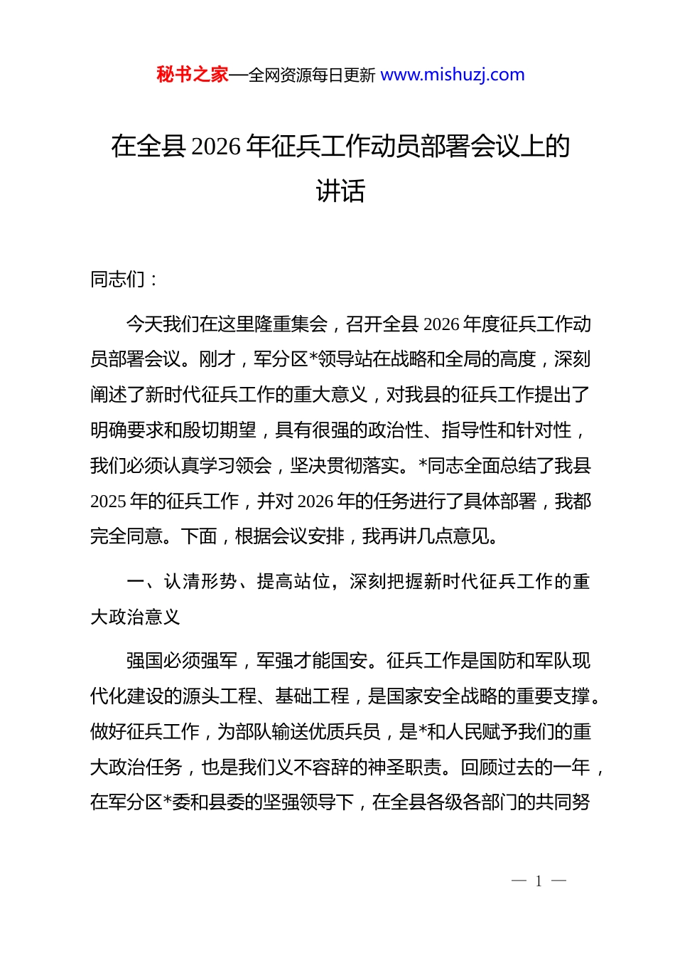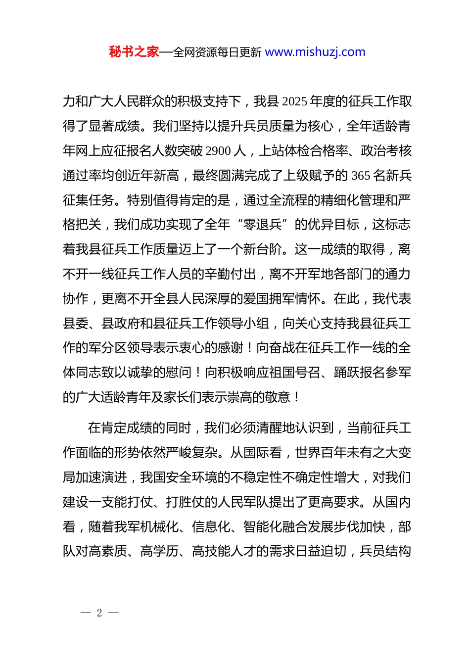 秘书之家—全网资源每日更新 www.mishuzj.com在全县 2026 年征兵工作动员部署会议上的讲话同志们:今天我们在这里隆重集会,召开全县 2026 年度征兵工作动员部署会议。刚才,军分区*领导站在战略和全局的高度,深刻阐述了新时代征兵工作的重大意义,对我县的征兵工作提出了明确要求和殷切期望,具有很强的政治性、指导性和针对性,我们必须认真学习领会,坚决贯彻落实。*同志全面总结了我县2025 年的征兵工作,并对 2026 年的任务进行了具体部署,我都完全同意。下面,根据会议安排,我再讲几点意见。一、认清形势、提高站位,深刻把握新时代征兵工作的重大政治意义强国必须强军,军强才能国安。征兵工作是国防和军队现代化建设的源头工程、基础工程,是国家安全战略的重要支撑。做好征兵工作,为部队输送优质兵员,是*和人民赋予我们的重大政治任务,也是我们义不容辞的神圣职责。回顾过去的一年,在军分区*委和县委的坚强领导下,在全县各级各部门的共同努— 1 —秘书之家—全网资源每日更新 www.mishuzj.com力和广大人民群众的积极支持下,我县 2025 年度的征兵工作取得了显著成绩。我们坚持以提升兵员质量为核心,全年适龄青年网上应征报名人数突破 2900 人,上站体检合格率、政治考核通过率均创近年新高,最终圆满完成了上级赋予的 365 名新兵征集任务。特别值得肯定的是,通过全流程的精细化管理和严格把关,我们成功实现了全年“零退兵”的优异目标,这标志着我县征兵工作质量迈上了一个新台阶。这一成绩的取得,离不开一线征兵工作人员的辛勤付出,离不开军地各部门的通力协作,更离不开全县人民深厚的爱国拥军情怀。在此,我代表县委、县政府和县征兵工作领导小组,向关心支持我县征兵工作的军分区领导表示衷心的感谢!向奋战在征兵工作一线的全体同志致以诚挚的慰问!向积极响应祖国号召、踊跃报名参军的广大适龄青年及家长们表示崇高的敬意!在肯定成绩的同时,我们必须清醒地认识到,当前征兵工作面临的形势依然严峻复杂。从国际看,世界百年未有之大变局加速演进,我国安全环境的不稳定性不确定性增大,对我们建设一支能打仗、打胜仗的人民军队提出了更高要求。从国内看,随着我军机械化、信息化、智能化融合发展步伐加快,部队对高素质、高学历、高技能人才的需求日益迫切,兵员结构— 2 —秘书之家—全网资源每日更新 www.mishuzj.com的优化升级成为当务之急。从我县实际情况看,适龄青年基数、学历结构、价值取向等都在发生深刻变化,征兵工作的难度在逐年加大。我们必须从讲政治、顾大局、保稳定的高度,深刻认识到做好新时代征兵工作的极端重要性和紧迫性,切实增强责任感、使命感和荣誉感,坚决把思想和行动统一到*中央、国务院、中央军委的决策部署上来,以最高的标准、最严的要求、最实的作风,全力以赴完成好 2026 年的征兵任务,为实现建军一百年奋斗目标贡献*力量。二、聚焦关键、精准发力,全面提升新年度征兵工作的质量效益兵员质量是军队战斗力的生成起点,是衡量征兵工作成效的根本标准。2026 年,我们要牢固树立“质量第一”的鲜明导向,坚决贯彻上级提出的“进入第一方阵、实现零退兵、守牢廉洁底线”的目标要求,推动征兵工作由“量”的满足向“质”的跃升转变。各镇、各部门要紧紧围绕这一核心,聚焦关键环节,实施精准动员,狠抓工作落实。(一)要聚焦“精准宣传”,让征兵氛围“热起来”。宣传发动是征兵工作的“第一道工序”,直接关系到征兵工作的广度和深度。我们要改变过去“大水漫灌”式的传统宣传模式,— 3 —秘书之家—全网资源每日更新 www.mishuzj.com转向“精准滴灌”的靶向动员。一是要让宣传内容“活起来”。要充分利用县电视台、广播电台、乡村大喇叭等传统媒体,也要善于运用县政府官网、微信公众号、短视频平台等新媒体矩阵,用青年人喜闻乐见的方式,广泛宣传新修订的《中华人民共和国兵役法》和《征兵工作条例》,深入解读二次入伍可直接招为军士、优秀义务兵提前选拔军士等最新政策。要大力宣传我县优秀退役军人在各行各业建功立业的先进事迹,讲述“一人参军,全家光荣”的生动故事,让参军报国...