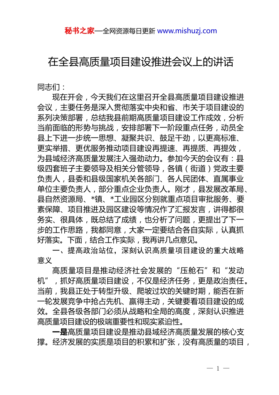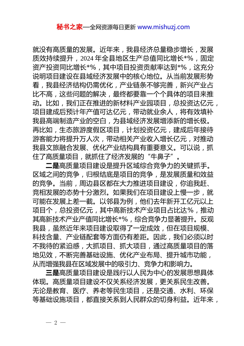 秘书之家—全网资源每日更新 www.mishuzj.com在全县高质量项目建设推进会议上的讲话同志们:现在开会,今天我们在这里召开全县高质量项目建设推进会议,主要任务是深入贯彻落实中央和省、市关于项目建设的系列决策部署,总结我县前期高质量项目建设工作成效,分析当前面临的形势与挑战,安排部署下一阶段重点任务,动员全县上下进一步统一思想、凝聚共识、鼓足干劲,以更高标准、更实举措、更优服务推动项目建设再提速、再提质、再提效,为县域经济高质量发展注入强劲动力。参加今天的会议有:县级四套班子主要领导及相关分管领导,各镇(街道)党政主要负责人,县委和县级国家机关各部门、各人民团体、直属事业单位主要负责人,部分重点企业负责人。刚才,县发展改革局、县自然资源局、*镇、*工业园区分别就重点项目审批服务、要素保障、项目推进及园区建设等情况作了汇报发言,讲得都很务实、很具体,既总结了成绩,也分析了问题,更提出了下一步的工作思路,我都同意,大家一定要结合各自实际,认真抓好落实。下面,结合工作实际,我再讲几点意见。一、提高政治站位,深刻认识高质量项目建设的重大战略意义高质量项目是推动经济社会发展的“压舱石”和“发动机”,抓好高质量项目建设,不仅是经济任务,更是政治责任。当前,我县正处于转型升级、爬坡过坎的关键时期,能否在新一轮发展竞争中抢占先机、赢得主动,关键要看项目建设的成效。全县各级各部门必须从战略和全局的高度,深刻认识推进高质量项目建设的极端重要性和现实紧迫性。一是高质量项目建设是推动县域经济高质量发展的核心支撑。经济发展的实质是项目的积累和扩张,没有高质量的项目,— 1 —秘书之家—全网资源每日更新 www.mishuzj.com就没有高质量的发展。近年来,我县经济总量稳步增长,发展质效持续提升,2024 年全县地区生产总值同比增长*%,固定资产投资同比增长*%,其中项目投资贡献率达到*%,这充分说明项目建设在县域经济发展中的核心地位。从当前发展形势看,我县经济结构仍需优化,产业链条不够完善,新兴产业占比不高,这些问题的解决,最终都要靠一个个具体的项目来推动。比如,我们正在推进的新材料产业园项目,总投资达亿元,项目建成后预计年产值可达亿元,带动就业余人,将有效填补我县高端制造产业的空白,为县域经济发展增添新的增长极。再比如,生态旅游度假区项目,计划投资亿元,建成后年接待游客能力将提升万人次,带动相关产业收入增长亿元,对推动我县文旅融合发展、优化产业结构具有重要意义。可以说,抓住了高质量项目,就抓住了经济发展的“牛鼻子”。二是高质量项目建设是提升区域综合竞争力的关键抓手。区域之间的竞争,归根结底是项目的竞争,是发展质量和效益的竞争。当前,周边县区都在大力推进项目建设,你追我赶、竞相发展的态势十分激烈。如果我们在项目建设上慢一步,就可能在发展上差一截。以邻县为例,他们去年新开工亿元以上项目个,总投资亿元,其中高新技术产业项目占比达%,推动其高新技术产业产值同比增长*%,综合竞争力显著提升。反观我县,虽然近年来项目建设取得了一定成效,但在项目规模、科技含量、产业链配套等方面仍有差距。因此,我们必须以时不我待的紧迫感,大抓项目、抓大项目,通过高质量项目的落地见效,不断完善基础设施、优化产业布局、提升城市功能,从而增强我县在区域发展中的吸引力、竞争力和影响力。三是高质量项目建设是践行以人民为中心的发展思想具体体现。高质量项目建设不仅关系经济发展,更关系民生改善。无论是教育、医疗、养老等民生项目,还是交通、水利、环保等基础设施项目,都直接关系到人民群众的切身利益。近年来,— 2 —秘书之家—全网资源每日更新 www.mishuzj.com我县持续加大民生项目投入,2024 年实施民生类项目个,总投资亿元,新建和改扩建中小学所、医院所,新增养老床位张,改造农村危房户,解决了*个村的安全饮水问题,人民群众的获得感、幸福感、安全感不断增强。但我们也要看到,我县在民生领域仍有不少短板,比如城乡教育资源不均衡、医疗服务水平有待提升、农村基础设施还不够完善等。这些问题的解决,...