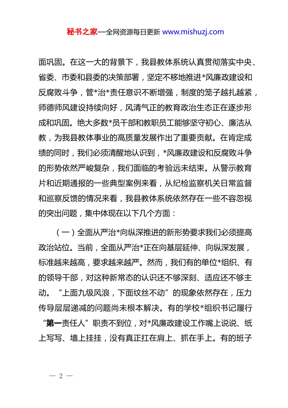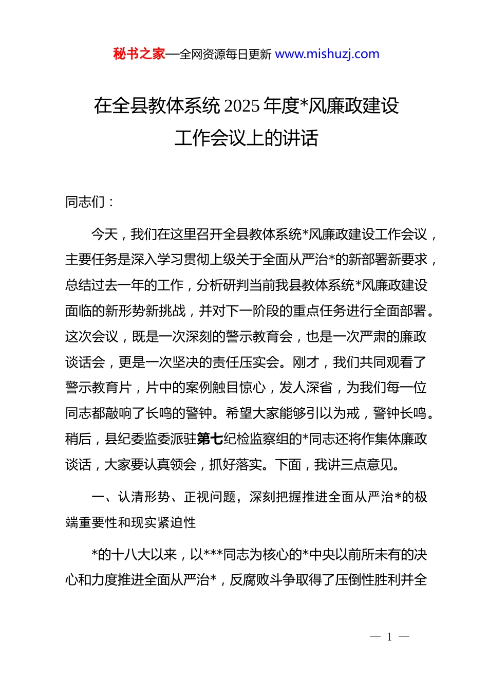 秘书之家—全网资源每日更新 www.mishuzj.com在全县教体系统 2025 年度*风廉政建设工作会议上的讲话同志们:今天,我们在这里召开全县教体系统*风廉政建设工作会议,主要任务是深入学习贯彻上级关于全面从严治*的新部署新要求,总结过去一年的工作,分析研判当前我县教体系统*风廉政建设面临的新形势新挑战,并对下一阶段的重点任务进行全面部署。这次会议,既是一次深刻的警示教育会,也是一次严肃的廉政谈话会,更是一次坚决的责任压实会。刚才,我们共同观看了警示教育片,片中的案例触目惊心,发人深省,为我们每一位同志都敲响了长鸣的警钟。希望大家能够引以为戒,警钟长鸣。稍后,县纪委监委派驻第七纪检监察组的*同志还将作集体廉政谈话,大家要认真领会,抓好落实。下面,我讲三点意见。一、认清形势、正视问题,深刻把握推进全面从严治*的极端重要性和现实紧迫性*的十八大以来,以***同志为核心的*中央以前所未有的决心和力度推进全面从严治*,反腐败斗争取得了压倒性胜利并全— 1 —秘书之家—全网资源每日更新 www.mishuzj.com面巩固。在这一大的背景下,我县教体系统认真贯彻落实中央、省委、市委和县委的决策部署,坚定不移地推进*风廉政建设和反腐败斗争,管*治*责任意识不断增强,制度的笼子越扎越紧,师德师风建设持续向好,风清气正的教育政治生态正在逐步形成和巩固。绝大多数*员干部和教职员工能够坚守初心、廉洁从教,为我县教体事业的高质量发展作出了重要贡献。在肯定成绩的同时,我们必须清醒地认识到,*风廉政建设和反腐败斗争的形势依然严峻复杂,我们面临的考验远未结束。从警示教育片和近期通报的一些典型案例来看,从纪检监察机关日常监督和巡察反馈的情况来看,我县教体系统依然存在一些不容忽视的突出问题,集中体现在以下几个方面:(一)全面从严治*向纵深推进的新形势要求我们必须提高政治站位。当前,全面从严治*正在向基层延伸、向纵深发展,标准越来越高,要求越来越严。然而,我们有的单位*组织、有的领导干部,对这种新常态的认识还不够深刻、适应还不够主动。“上面九级风浪,下面纹丝不动”的现象依然存在,压力传导层层递减的问题尚未根本解决。有的学校*组织书记履行“第一责任人”职责不到位,对*风廉政建设工作嘴上说说、纸上写写、墙上挂挂,没有真正扛在肩上、抓在手上。有的班子— 2 —秘书之家—全网资源每日更新 www.mishuzj.com成员“一岗双责”意识淡薄,认为业务是硬指标,dj 是软任务,抓*风廉政建设是纪委的事,与自己关系不大,导致分管领域内的苗头性、倾向性问题未能及时发现和纠正。(二)人民群众对公平优质教育的新期待要求我们必须转变工作作风。随着社会的发展进步,人民群众对教育的需求已经从“有学上”转变为“上好学”,对教育公平的期盼、对优质教育资源的渴望日益增强。这种期盼,不仅仅是对教学质量的期盼,更是对教育行风、师德师风的期盼。社会各界正用“放大镜”审视着我们的一言一行。然而,一些损害群众利益的不正之风和腐败问题仍时有发生,严重侵蚀了教育的公信力。比如,在招生入学、评优评先、职称评定等环节,是否做到了绝对的公平公正公开?在服务学生和家长的过程中,是否存在推诿扯皮、态度生硬、效率低下的问题?这些问题虽然发生在少数人身上,但破坏的是整个教育系统的形象,伤害的是人民群众对教育的美好期盼。(三)教育领域各类风险叠加的新挑战要求我们必须筑牢思想防线。教育系统体量大、人员多、资金项目密集,与社会联系紧密,是各种矛盾和风险的交汇点。我们必须精准识别和防范各类廉洁风险。从近几年查处的案件看,一些重点领域和— 3 —秘书之家—全网资源每日更新 www.mishuzj.com关键环节已成为腐败问题的高发区。比如,在校园餐管理上,是否存在通过虚高价格、违规外包、克扣伙食费等方式谋取私利?在校服定制上,是否存在暗箱操作、利益输送,强制学生购买质次价高的校服?在教辅资料征订上,是否存在违规推荐、强制购买,甚至与书商形成利益链条?此外,还包括工程项目建设、仪器设备采购、课后服务、研学旅行、招生考试、财务管理、后勤服务、食堂超市承包等...