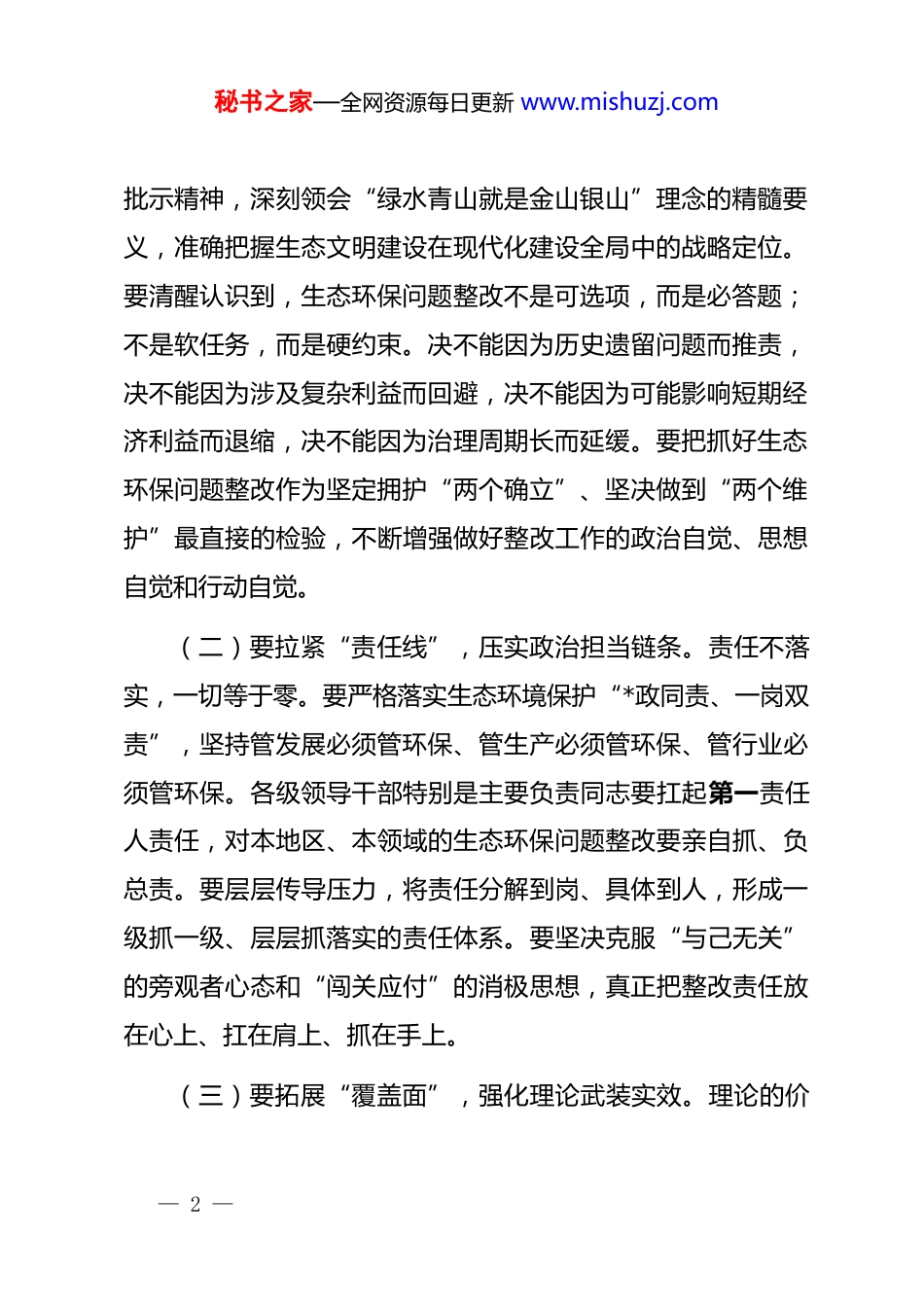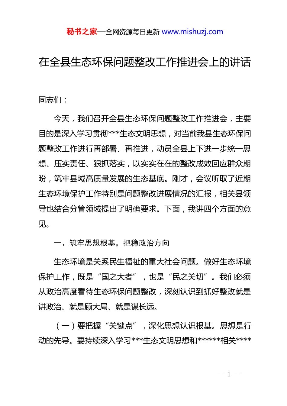 秘书之家—全网资源每日更新 www.mishuzj.com在全县生态环保问题整改工作推进会上的讲话同志们:今天,我们召开全县生态环保问题整改工作推进会,主要目的是深入学习贯彻***生态文明思想,对当前我县生态环保问题整改工作进行再部署、再推进,动员全县上下进一步统一思想、压实责任、狠抓落实,以实实在在的整改成效回应群众期盼,筑牢县域高质量发展的生态基底。刚才,会议听取了近期生态环境保护工作特别是问题整改进展情况的汇报,相关县领导也结合分管领域提出了明确要求。下面,我讲四个方面的意见。一、筑牢思想根基,把稳政治方向生态环境是关系民生福祉的重大社会问题。做好生态环境保护工作,既是“国之大者”,也是“民之关切”。我们必须从政治高度看待生态环保问题整改,深刻认识到抓好整改就是讲政治、就是顾大局、就是谋长远。(一)要把握“关键点”,深化思想认识根基。思想是行动的先导。要持续深入学习***生态文明思想和******相关****— 1 —秘书之家—全网资源每日更新 www.mishuzj.com批示精神,深刻领会“绿水青山就是金山银山”理念的精髓要义,准确把握生态文明建设在现代化建设全局中的战略定位。要清醒认识到,生态环保问题整改不是可选项,而是必答题;不是软任务,而是硬约束。决不能因为历史遗留问题而推责,决不能因为涉及复杂利益而回避,决不能因为可能影响短期经济利益而退缩,决不能因为治理周期长而延缓。要把抓好生态环保问题整改作为坚定拥护“两个确立”、坚决做到“两个维护”最直接的检验,不断增强做好整改工作的政治自觉、思想自觉和行动自觉。(二)要拉紧“责任线”,压实政治担当链条。责任不落实,一切等于零。要严格落实生态环境保护“*政同责、一岗双责”,坚持管发展必须管环保、管生产必须管环保、管行业必须管环保。各级领导干部特别是主要负责同志要扛起第一责任人责任,对本地区、本领域的生态环保问题整改要亲自抓、负总责。要层层传导压力,将责任分解到岗、具体到人,形成一级抓一级、层层抓落实的责任体系。要坚决克服“与己无关”的旁观者心态和“闯关应付”的消极思想,真正把整改责任放在心上、扛在肩上、抓在手上。(三)要拓展“覆盖面”,强化理论武装实效。理论的价— 2 —秘书之家—全网资源每日更新 www.mishuzj.com值在于指导实践。要坚持学思用贯通、知信行统一,把学习贯彻***生态文明思想的成果,转化为谋划整改工作的思路、推动整改落实的举措、检验整改成效的标准。要结合我县实际,深入开展生态环境保护大讨论、大反思,引导广大干部深刻理解“生态兴则文明兴”的历史规律,清醒认识我县生态环境面临的严峻形势和突出短板,增强忧患意识和责任担当。要将生态环保知识纳入干部教育培训体系,提升各级干部运用法治思维和法治方式解决环境问题的能力,做到真学真懂真信真用,避免“纸上谈兵”。二、聚焦问题攻坚,提升整改实效问题是时代的声音,整改是发展的动力。当前,我县生态环保问题整改已进入攻坚拔寨的关键时期。我们必须坚持问题导向,发扬斗争精神,以“钉钉子”精神狠抓整改落实,确保所有问题按期高质量见底清零。(一)要找准“病灶”,全面排查不留死角。发现问题是整改的前提。要聚焦中央和省级环保督察反馈问题、群众反复投诉举报问题、以及我们自己排查发现的突出问题,进行再梳理、再排查。要扩大排查视野,不仅关注点上的具体问题,更要举一反三,深入排查同类问题、衍生问题、关联问题,避免— 3 —秘书之家—全网资源每日更新 www.mishuzj.com“头痛医头、脚痛医脚”。排查工作要深入细致,敢于触及矛盾,绝不能搞选择性排查、敷衍性排查。要建立问题清单台账,实行动态更新管理,确保底数清、情况明。(二)要深挖“病根”,精准施策靶向治疗。找准病根才能开对药方。对排查发现的问题,不能停留在表面,要深入分析问题产生的根源,是思想认识不到位、是责任落实有悬空、是基础设施有短板、还是体制机制有缺陷?要透过现象看本质,抓住主要矛盾和矛盾的主要方面。要坚持具体问题具体分析,根据不同问题的性质、成因、影响,制定差异化、精准化的整改方案,明确整改目标、...