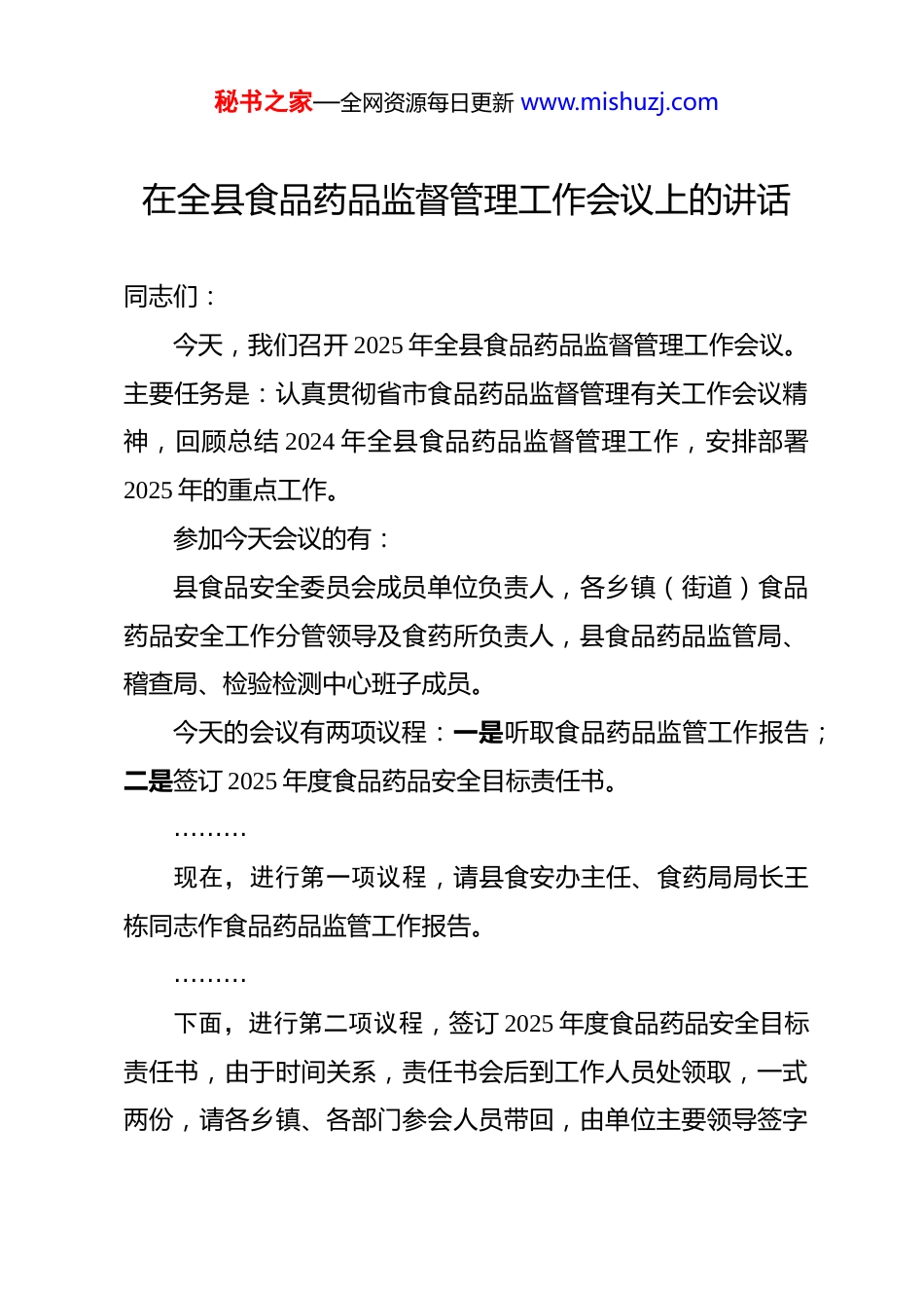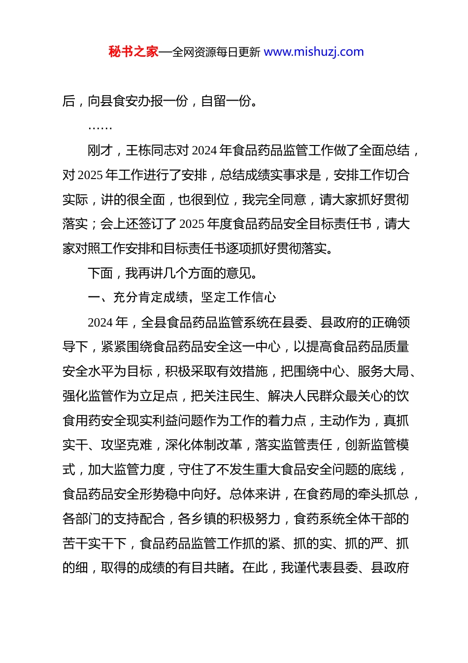 秘书之家—全网资源每日更新 www.mishuzj.com在全县食品药品监督管理工作会议上的讲话同志们:今天,我们召开 2025 年全县食品药品监督管理工作会议。主要任务是:认真贯彻省市食品药品监督管理有关工作会议精神,回顾总结 2024 年全县食品药品监督管理工作,安排部署2025 年的重点工作。参加今天会议的有:县食品安全委员会成员单位负责人,各乡镇(街道)食品药品安全工作分管领导及食药所负责人,县食品药品监管局、稽查局、检验检测中心班子成员。今天的会议有两项议程:一是听取食品药品监管工作报告;二是签订 2025 年度食品药品安全目标责任书。………现在,进行第一项议程,请县食安办主任、食药局局长王栋同志作食品药品监管工作报告。………下面,进行第二项议程,签订 2025 年度食品药品安全目标责任书,由于时间关系,责任书会后到工作人员处领取,一式两份,请各乡镇、各部门参会人员带回,由单位主要领导签字秘书之家—全网资源每日更新 www.mishuzj.com后,向县食安办报一份,自留一份。……刚才,王栋同志对 2024 年食品药品监管工作做了全面总结,对 2025 年工作进行了安排,总结成绩实事求是,安排工作切合实际,讲的很全面,也很到位,我完全同意,请大家抓好贯彻落实;会上还签订了 2025 年度食品药品安全目标责任书,请大家对照工作安排和目标责任书逐项抓好贯彻落实。下面,我再讲几个方面的意见。一、充分肯定成绩,坚定工作信心2024 年,全县食品药品监管系统在县委、县政府的正确领导下,紧紧围绕食品药品安全这一中心,以提高食品药品质量安全水平为目标,积极采取有效措施,把围绕中心、服务大局、强化监管作为立足点,把关注民生、解决人民群众最关心的饮食用药安全现实利益问题作为工作的着力点,主动作为,真抓实干、攻坚克难,深化体制改革,落实监管责任,创新监管模式,加大监管力度,守住了不发生重大食品安全问题的底线,食品药品安全形势稳中向好。总体来讲,在食药局的牵头抓总,各部门的支持配合,各乡镇的积极努力,食药系统全体干部的苦干实干下,食品药品监管工作抓的紧、抓的实、抓的严、抓的细,取得的成绩的有目共睹。在此,我谨代表县委、县政府秘书之家—全网资源每日更新 www.mishuzj.com向奋战在食品药品监管一线的广大干部职工表示亲切的问候!向为全县经济社会发展作出的巨大贡献食品药品监管部门表示衷心的感谢!2025 年,食品药品监管工作要坚持“严”字当头、“安”字兜底、“好”字见效,遵循“四个最严”的基本要求,源头严防、过程严管、风险严控,夯实各环节、各方面的责任,用最严格的监管守住不发生系统性区域性食品药品安全风险的底线,推动食品安全形势持续改善,为全民健康、全面小康奠定坚实基础。二、正确分析形势,认清差距和不足一要把握新要求。近年来,党中央、国务院高度重视食品药品安全工作,相继做出了一系列新的重要部署,省、市、县党委政府主要领导也多次就食品药品安全工作作出重要批示指示,县安委会更是逢会必讲食品药品安全工作。从上到下,层层传导压力,将饮食用药安全提到了一个前所未有的新高度,我们要切实把思想和行动统一到上级决策部署上来,正确认识当前食品药品工作面临的形势,牢固树立责任意识和担当意识,以对人民高度负责的态度,扎实抓好食品药品安全工作。二要把握新形势。随着人民群众生活质量的提高,饮食用药安全已成为全社会共同关注的热点和焦点,从过去的三鹿奶粉、瘦肉精、地沟油,涉及面之广,社会影响之大,危害程度秘书之家—全网资源每日更新 www.mishuzj.com之深让人为之震惊,食品药品安全已不是单一的民生问题,更是经济问题、社会问题和政治问题。今年,我们面临的形势更为复杂,需要承担的任务更加艰巨,这就需要我们不断提高监管能力和水平,不断加强安全监督检查,最大限度地将隐患消除在萌芽状态,才能保障我们的工作不出纰漏,才能真正让组织放心、让群众满意。三要把握新问题。近年来,全县食品药品监管系统认真贯彻落实县委、县政府的安排部署,守住了不发生重大食品药品安全事故的底线,有效保障了全县人民“舌尖上的安全”。但也存...