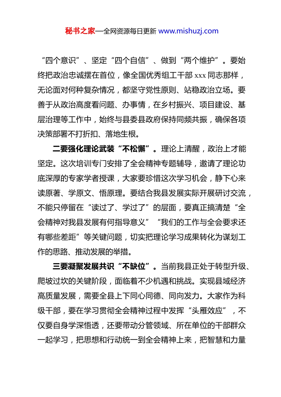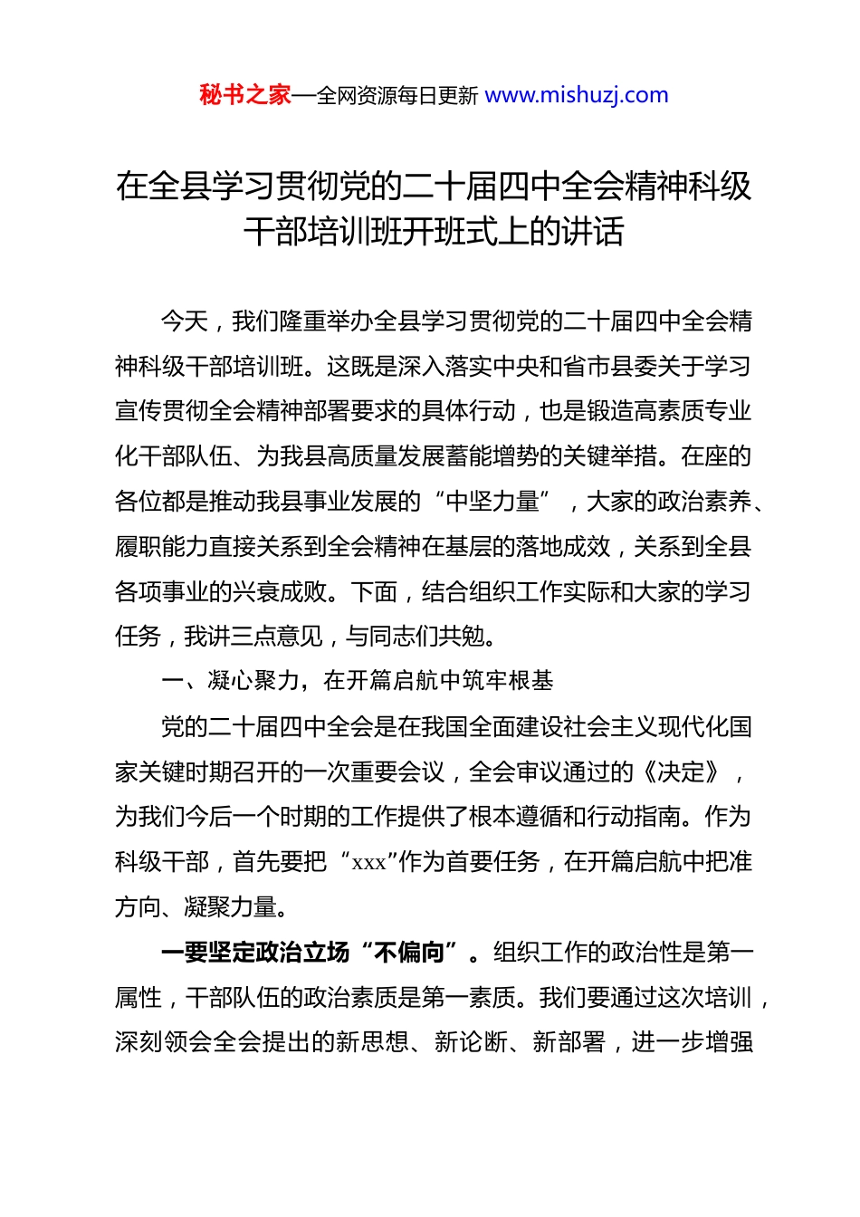 秘书之家—全网资源每日更新 www.mishuzj.com在全县学习贯彻党的二十届四中全会精神科级干部培训班开班式上的讲话今天,我们隆重举办全县学习贯彻党的二十届四中全会精神科级干部培训班。这既是深入落实中央和省市县委关于学习宣传贯彻全会精神部署要求的具体行动,也是锻造高素质专业化干部队伍、为我县高质量发展蓄能增势的关键举措。在座的各位都是推动我县事业发展的“中坚力量”,大家的政治素养、履职能力直接关系到全会精神在基层的落地成效,关系到全县各项事业的兴衰成败。下面,结合组织工作实际和大家的学习任务,我讲三点意见,与同志们共勉。一、凝心聚力,在开篇启航中筑牢根基党的二十届四中全会是在我国全面建设社会主义现代化国家关键时期召开的一次重要会议,全会审议通过的《决定》,为我们今后一个时期的工作提供了根本遵循和行动指南。作为科级干部,首先要把“xxx”作为首要任务,在开篇启航中把准方向、凝聚力量。一要坚定政治立场“不偏向”。组织工作的政治性是第一属性,干部队伍的政治素质是第一素质。我们要通过这次培训,深刻领会全会提出的新思想、新论断、新部署,进一步增强秘书之家—全网资源每日更新 www.mishuzj.com“四个意识”、坚定“四个自信”、做到“两个维护”。要始终把政治忠诚摆在首位,像全国优秀组工干部 xxx 同志那样,无论面对何种复杂情况,都坚守党性原则、站稳政治立场。要善于从政治高度看问题、办事情,在乡村振兴、项目建设、基层治理等工作中,始终与县委县政府保持同频共振,确保各项决策部署不打折扣、落地生根。二要强化理论武装“不松懈”。理论上清醒,政治上才能坚定。这次培训专门安排了全会精神专题辅导,邀请了理论功底深厚的专家学者授课,大家要珍惜这次学习机会,静下心来读原著、学原文、悟原理。要结合我县发展实际开展研讨交流,不能只停留在“读过了、学过了”的层面,要真正搞清楚“全会精神对我县发展有何指导意义”“我们的工作与全会要求还有哪些差距”等关键问题,切实把理论学习成果转化为谋划工作的思路、推动发展的举措。三要凝聚发展共识“不缺位”。当前我县正处于转型升级、爬坡过坎的关键阶段,面临着不少机遇和挑战。实现县域经济高质量发展,需要全县上下同心同德、同向发力。大家作为科级干部,要在学习贯彻全会精神过程中发挥“头雁效应”,不仅要自身学深悟透,还要带动分管领域、所在单位的干部群众一起学习,把思想和行动统一到全会精神上来,把智慧和力量秘书之家—全网资源每日更新 www.mishuzj.com凝聚到县委县政府的中心工作上来,形成“心往一处想、劲往一处使”的强大合力。二、学思践悟,在专业赋能中增强本领全会明确提出要“建设高素质专业化干部队伍”,这既是对干部队伍建设的要求,也是对我们每一位干部的鞭策。当前我县部分干部存在“本领恐慌”,面对新形势新任务,老办法不管用、新办法不会用的问题依然存在。这次培训就是要针对性地补短板、强弱项,帮助大家在专业赋能中提升履职能力。一要聚焦重点领域“补短板”。结合我县发展实际,这次培训专门设置了乡村振兴、基层治理、项目服务等特色课程,还邀请了农业专家、企业高管等兼职导师授课。大家要结合自身岗位需求,精准“选课”“充电”,比如乡镇干部要重点学习乡村产业发展、人居环境整治等知识,县直部门干部要重点提升政策解读、服务企业等能力。要通过案例分析、现场教学等方式,把专业知识学深学透,切实解决“知识空白”“能力弱项”等问题。二要创新学习方法“提效能”。干部教育培训既要“苦学”也要“巧学”。我们这次培训采取“线上+线下”“专题辅导+实务教学”的模式,就是为了提升学习实效。大家要充分利用线上平台开展自主学习,利用线下研讨交流碰撞思想火秘书之家—全网资源每日更新 www.mishuzj.com花。要带着问题学、联系实际学,把学习过程变成思考问题、解决问题的过程。比如在学习基层治理知识时,要结合自己工作中遇到的矛盾纠纷化解难题,主动向授课老师请教,与其他学员交流经验,在互动学习中提升解决实际问题的能力。三要坚持学用结合“强本领”。“纸上得来终觉浅,绝知此事要...