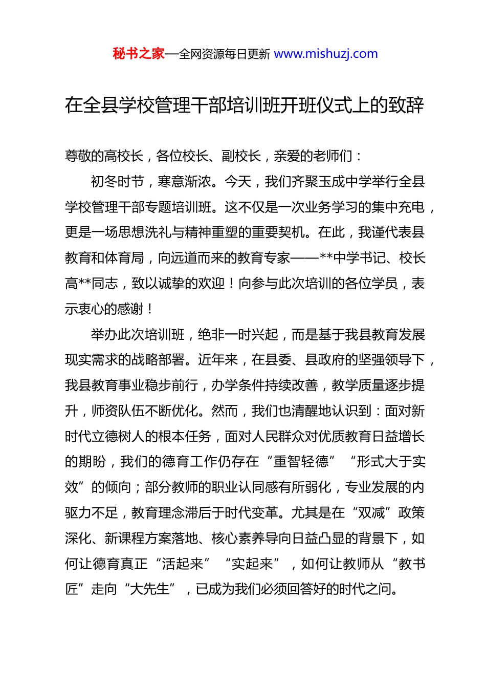 秘书之家—全网资源每日更新 www.mishuzj.com在全县学校管理干部培训班开班仪式上的致辞尊敬的高校长,各位校长、副校长,亲爱的老师们:初冬时节,寒意渐浓。今天,我们齐聚玉成中学举行全县学校管理干部专题培训班。这不仅是一次业务学习的集中充电,更是一场思想洗礼与精神重塑的重要契机。在此,我谨代表县教育和体育局,向远道而来的教育专家——**中学书记、校长高**同志,致以诚挚的欢迎!向参与此次培训的各位学员,表示衷心的感谢!举办此次培训班,绝非一时兴起,而是基于我县教育发展现实需求的战略部署。近年来,在县委、县政府的坚强领导下,我县教育事业稳步前行,办学条件持续改善,教学质量逐步提升,师资队伍不断优化。然而,我们也清醒地认识到:面对新时代立德树人的根本任务,面对人民群众对优质教育日益增长的期盼,我们的德育工作仍存在“重智轻德”“形式大于实效”的倾向;部分教师的职业认同感有所弱化,专业发展的内驱力不足,教育理念滞后于时代变革。尤其是在“双减”政策深化、新课程方案落地、核心素养导向日益凸显的背景下,如何让德育真正“活起来”“实起来”,如何让教师从“教书匠”走向“大先生”,已成为我们必须回答好的时代之问。秘书之家—全网资源每日更新 www.mishuzj.com正是在这样的背景下,我们精心策划并组织了本次培训。上午的主题《德育赋能学生成长》,旨在引导我们重新审视德育的价值定位——它不是附加的任务,而是教育的灵魂;不是空洞的说教,而是滋养生命的土壤。我们要通过系统化、生活化、情境化的德育实践,帮助学生树立正确的世界观、人生观、价值观,培养他们健全的人格、高尚的情操和强烈的社会责任感。各学校校长、分管德育工作的副校长以及“三名”工程人选,作为德育工作的组织者、推动者和示范者,必须率先转变观念,把德育融入教育教学全过程,构建全员、全程、全方位育人的新格局,为孩子们成长成才奠定坚实根基。下午的主题《认知破壁——重塑教师职业精神与生命格局》,更具哲学高度与人文关怀。它提醒我们:教育的本质是心灵的唤醒,教师的成长首先是精神的成长。当下的教师,不应只是知识的传递者,更应是生命的影响者、价值的引路人。唯有打破固有的认知边界,才能重建对教育的敬畏之心、对学生的仁爱之情、对专业的执着之志。各校分管业务的副校长和初中学科骨干教师,是我县教育教学的中坚力量,你们的专业水平直接决定着课堂的质量、学生的未来。希望大家借助此次培训,实现一次深度的自我对话,唤醒内在的成长动力,涵养“躬耕教坛、强国有我”的使命担当。秘书之家—全网资源每日更新 www.mishuzj.com同志们,培训的意义不在于听一听、记一记,而在于思一思、悟一悟,最终落脚于行一行、改一改。借此机会,我对全体参训人员提出三点明确要求:第一,端正态度,全心投入。 本次培训时间紧凑、内容丰富,请大家务必珍惜难得的学习机会,严格遵守会场纪律,按座次就座,手机调至静音或飞行模式,杜绝交头接耳、随意走动。希望大家以一名学习者的谦卑姿态,静心聆听、深入思考、积极互动,确保学有所得、学有所获。第二,联系实际,深度反思。学习的目的在于运用。希望大家在听讲过程中,主动将专家的理念与本校的管理实践、自身的教学经验相对照,多问几个“为什么”“怎么做”。比如:我校的德育活动是否真正触动了学生心灵?我的课堂教学是否体现了对学生思维的尊重与激发?我在职业发展中是否陷入了倦怠与惯性?唯有带着问题学,才能实现认知的突破与行为的转变。第三,知行合一,推动转化。培训结束后,各学校要迅速组织二次学习与研讨,将高校长的思想精髓转化为具体的行动方案。校长要带头撰写心得体会,谋划学校德育创新路径;分管领导要结合职责,制定切实可行的改进措施;骨干教师要在教研组内分享收获,带动团队共同成长。秘书之家—全网资源每日更新 www.mishuzj.com老师们,教育是一项需要情怀的事业,也是一场没有终点的修行。今天,我们所探讨的“德育赋能”与“认知破壁”,本质上都是在追问:我们究竟要培养什么样的人?我们又该成为什么样的教师?答案或许就在高校长的智慧分享中...