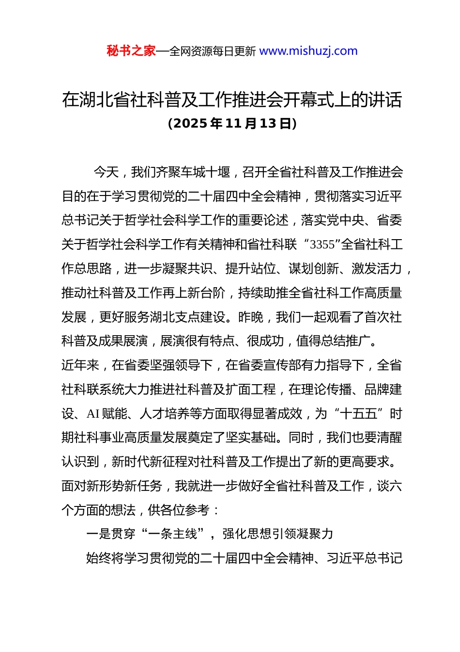 秘书之家—全网资源每日更新 www.mishuzj.com在湖北省社科普及工作推进会开幕式上的讲话(2025 年 11 月 13 日) 今天,我们齐聚车城十堰,召开全省社科普及工作推进会目的在于学习贯彻党的二十届四中全会精神,贯彻落实习近平总书记关于哲学社会科学工作的重要论述,落实党中央、省委关于哲学社会科学工作有关精神和省社科联“3355”全省社科工作总思路,进一步凝聚共识、提升站位、谋划创新、激发活力,推动社科普及工作再上新台阶,持续助推全省社科工作高质量发展,更好服务湖北支点建设。昨晚,我们一起观看了首次社科普及成果展演,展演很有特点、很成功,值得总结推广。近年来,在省委坚强领导下,在省委宣传部有力指导下,全省社科联系统大力推进社科普及扩面工程,在理论传播、品牌建设、AI 赋能、人才培养等方面取得显著成效,为“十五五”时期社科事业高质量发展奠定了坚实基础。同时,我们也要清醒认识到,新时代新征程对社科普及工作提出了新的更高要求。面对新形势新任务,我就进一步做好全省社科普及工作,谈六个方面的想法,供各位参考:一是贯穿“一条主线”,强化思想引领凝聚力始终将学习贯彻党的二十届四中全会精神、习近平总书记秘书之家—全网资源每日更新 www.mishuzj.com考察湖北重要讲话精神作为主线,贯穿社科普及全过程各环节。持续深化对习近平新时代中国特色社会主义思想的宣传宣讲,坚决筑牢意识形态领域安全防线,依托各类平台载体开展对象化、分众化、互动化传播,精准对接不同群体需求,丰富基层宣讲形式,把“十五五”规划宏伟蓝图讲透彻,把中国式现代化湖北实践的战略举措讲明白。着力推动“三大文化”的创造性转化和创新性发展,大力弘扬“三大精神”,广泛践行社会主义核心价值观,讲好湖北故事、传播湖北声音,持续提升人民群众的文化自信,厚植全民共建的文化认同,夯实团结奋斗的思想根基。二是打造“一批标杆”,提升品牌项目影响力持续做大做强做优“荆楚社科讲坛”“社科普及周”等传统品牌;不断提档升级“社科集市”“社科普及成果展演”等特色活动;积极探索创新“长江文化知识大赛”“基地活动项目化”等全新举措,着力培育一批具有示范引领作用的标杆。大力推进“文安荆楚”平台建设,深化内容、形式、技术创新,打造具有全国影响力的湖北社科传播品牌。深入实施“基地提质三年行动”,按照“六好”标准在全省范围内选树一批示范社科普及基地,构建以点带面、全域联动的工作新格局,持续提升我省社科普及活动的知名度、感召力和影响力。秘书之家—全网资源每日更新 www.mishuzj.com三是建强“一流队伍”,激发人才队伍创造力充分发挥社科联的桥梁纽带作用,广泛凝聚社科“五路大军”,加快构建“专家领衔、骨干支撑、社会协同、全民参与”的社科普及人才体系。进一步扩大省级社科专家宣讲团规模,培育青年学者宣讲生力军、壮大基层宣讲骨干队伍,形成层级合理、结构优化、辐射有力、覆盖全域的人才矩阵。以理论培训为根基、课题项目为牵引、社会调研为支撑,全方位提升社科普及队伍的政治素养、理论水平、业务能力与实践本领。进一步健全人才培养、激励机制,鼓励支持各类社科人才积极投身社科普及事业,着力建设一支政治坚定、业务精湛、作风优良、群众认可的一流社科普及队伍。四是构建“一域融合”,增强数智赋能传播力顺应全媒体时代传播趋势,积极探索“社科+AI”发展新模式。叫响“湖北数智社科专家”“理响+”品牌,以现代信息技术手段为支撑,构建投放精准、形象生动、动态优化的社科普及传播体系。推动社科普及与文旅产业、文明实践等领域的融合共进,完善“1+N+N”联动机制,打通线上线下、贯通传统与现代传播渠道,持续拓展社科普及广度与深度,提升渗透力、实效性和覆盖面。深化与各级媒体的合作,续推出精细化、接地气的数智社科普及产品。秘书之家—全网资源每日更新 www.mishuzj.com五是做实“一线服务”,拓展基层工作覆盖力牢固树立以人民为中心的工作导向,推动社科普及资源向基层倾斜、服务向一线延伸。深入开展党的创新理论进基层,以群众喜闻乐见的形式推动社科理论“飞入寻常百姓家”。聚焦人...