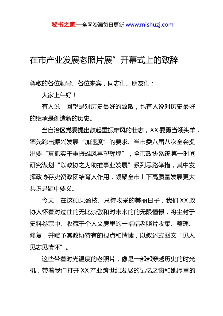 秘书之家—全网资源每日更新 www.mishuzj.com在市产业发展老照片展”开幕式上的致辞尊敬的各位领导、各位来宾,同志们、朋友们:大家上午好!有人说,回望是对历史最好的致敬,也有人说对历史最好的继承是创造新的历史。当自治区党委提出鼓起重振雄风的壮志,XX 要勇当领头羊,率先跑出振兴发展“加速度”的要求、当市委八届八次全会提出要“真抓实干重振雄风再塑辉煌”,全市政协系统第一时间研究谋划“以政协之为助推事业发展”系列思路举措,其中发挥政协存史资政团结育人作用,凝聚全市上下高质量发展更大共识是题中要义。今天,在这硕果盈枝、只待收采的美丽日子,我们 XX 政协人怀着对过往的无比崇敬和对未来的的无限憧憬,将尘封于史料卷宗中、收藏于个人文房里的一幅幅老照片收集、整理、修复,并赋予其政协特有的视点和情愫,以叙述式图文“见人见志见情怀”。这些带着时光温度的老照片,像是一部部穿越历史的时光机,带着我们打开 XX 产业跨世纪发展的记忆之窗和她厚重的秘书之家—全网资源每日更新 www.mishuzj.com篇章,感知这座城市曾经的沧桑与豪情满怀,也让我们得以在回望中收获与前人的情感共鸣,汲取接续前行的磅礴力量。我们回望,XX 农牧业根基夯实的峥嵘岁月。广袤田野上不辍耕耘的身姿,敖汉小米培育成功的喜悦,“三北”防护林建设的壮阔,水利工程与小流域治理的技艺,草原红牛、敖汉细毛羊的茁壮成长——那是一段段 XX 人民用汗水与智慧绘就“五谷丰登、六畜兴旺”的历史,铸就了自力更生、艰苦奋斗的精神。我们回望,XX 工业脊梁挺立的激情年代。“红马牌”麻黄素享誉市场的骄傲,有色金属开采冶炼的火热,元宝山电厂发电项目的恢宏,纺织、建材、食品工业的繁忙——那是无数产业工人以工匠精神和集体力量,撑起了 XX 工业的支柱,展现了锐意改革、开拓创新的风采。我们回望,XX 市场经济初起的欣欣向荣。商厦、百货大楼摩肩接踵的热闹,头道街街区的繁华,农贸市场人声鼎沸的交易,火车站、汽车站南来北往的人流,红山、达里湖四方游客的穿梭——那是曾经的熟悉且亲切的美好瞬间彰显出的 XX 开放包容、勇立潮头的精神风貌。曾经的“芳华”,是 XX 发展史上浓墨重彩的华章,是老一辈留下的沉甸甸的“家底儿”。我们深知,产业发展的每一秘书之家—全网资源每日更新 www.mishuzj.com次跨越、每一次突破,都离不开全市干部群众的同心协力,离不开每一位劳动者建设者的智慧担当。今天,让我们一起向他们致敬,致敬他们“不干不行”的坚守、致敬他们“干就干好”的进取、致敬他们“一干到底”的卓绝!举办这次展览,不仅仅是为了重温辉煌,更是为了感悟创业之艰辛、奉献之荣光、时代之豪迈,以“走过芳华”的自豪与底气,扛起“迈向未来”的责任与使命。我们展望,未来的 XX 产业将在“绿色转型”中焕发新活力。持续聚焦生态产业化、产业生态化,深耕现代新能源产业,全力打造清洁能源基地;文旅体农商深度融合,推动资源优势转化为发展胜势,让 XX 的天更蓝、草更绿、水更清......我们展望,未来的 XX 产业将在“创新驱动”中实现新突破。传统产业数字化、智能化改造加快推进,生物医药、新材料新兴产业发展壮大;服务中小企业更加用心用情,企业发展环境更加优渥,创新成为产业发展核心动力,让 XX 的产业既有“老根基”,更有“新活力”......我们展望,未来的 XX 产业将在“开放协同”中拓展新空间。深度融入京津冀协同发展、东北全面振兴国家战略,承接产业转移,加快区域合作,在优势互补中实现共赢;对外交流持续扩大,产业优势持续释放,更多外地企业、客商来赤投资秘书之家—全网资源每日更新 www.mishuzj.com兴业,让 XX 产业发展“朋友圈”越来越大,产业发展之路越走越宽......老照片,记录的是滚烫岁月,承载的是不竭动力和面向未来的奋斗意志。真心希望此次展览,能成为我们每个人心间的那一缕清香,历久弥新,更能成为我们今后每一段跋涉的活水源泉,喷涌不息。我们相信,在每一次回望中汲取的力量、在每一次展望中坚定的信心,定能让我们在 XX 大地上共同书写出新时代加速发展的新答卷。