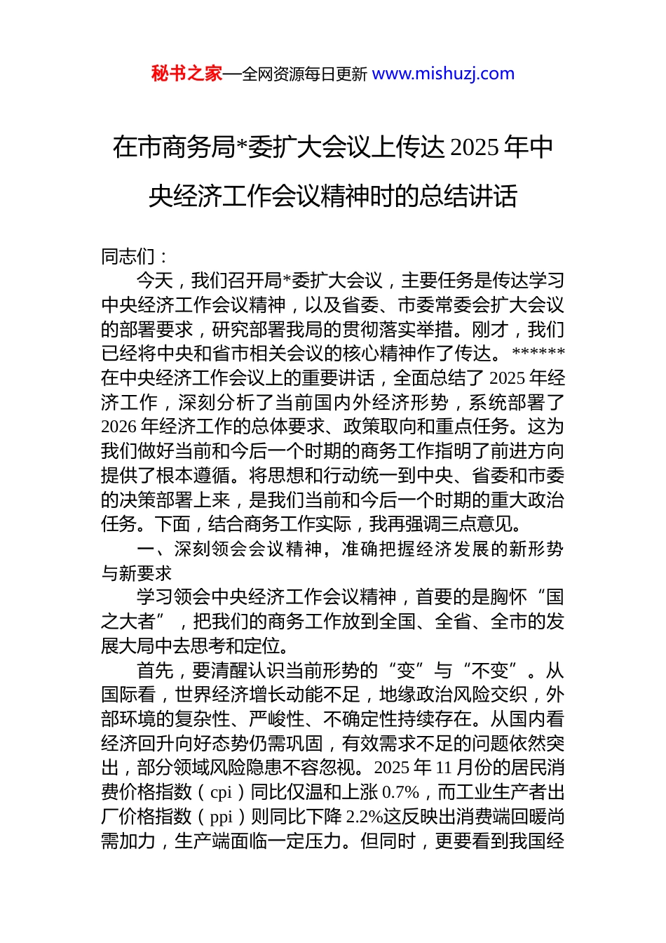 秘书之家—全网资源每日更新 www.mishuzj.com在市商务局*委扩大会议上传达 2025 年中央经济工作会议精神时的总结讲话同志们:今天,我们召开局*委扩大会议,主要任务是传达学习中央经济工作会议精神,以及省委、市委常委会扩大会议的部署要求,研究部署我局的贯彻落实举措。刚才,我们已经将中央和省市相关会议的核心精神作了传达。******在中央经济工作会议上的重要讲话,全面总结了 2025 年经济工作,深刻分析了当前国内外经济形势,系统部署了2026 年经济工作的总体要求、政策取向和重点任务。这为我们做好当前和今后一个时期的商务工作指明了前进方向提供了根本遵循。将思想和行动统一到中央、省委和市委的决策部署上来,是我们当前和今后一个时期的重大政治任务。下面,结合商务工作实际,我再强调三点意见。一、深刻领会会议精神,准确把握经济发展的新形势与新要求学习领会中央经济工作会议精神,首要的是胸怀“国之大者”,把我们的商务工作放到全国、全省、全市的发展大局中去思考和定位。首先,要清醒认识当前形势的“变”与“不变”。从国际看,世界经济增长动能不足,地缘政治风险交织,外部环境的复杂性、严峻性、不确定性持续存在。从国内看经济回升向好态势仍需巩固,有效需求不足的问题依然突出,部分领域风险隐患不容忽视。2025 年 11 月份的居民消费价格指数(cpi)同比仅温和上涨 0.7%,而工业生产者出厂价格指数(ppi)则同比下降 2.2%这反映出消费端回暖尚需加力,生产端面临一定压力。但同时,更要看到我国经秘书之家—全网资源每日更新 www.mishuzj.com济长期向好的基本面没有改变。我国拥有超大规模市场优势、完整的产业体系和丰富的人力资源,经济发展的韧性强、潜力大、活力足。权威机构预测,2025 年我国全年 gdp增速有望保持在 5%左右的合理区间这在全球主要经济体中仍是领先的,是我们做好明年工作的信心和底气所在。其次,要牢牢把握“稳中求进、提质增效”的总基调。“稳”是主基调、是大局。要着力稳定社会预期、稳定经济增长、稳定就业民生。对于商务领域而言,“稳”就是要稳住外贸外资基本盘,稳住消费市场的增长势头。“进”是方向、是目标。要在“稳”的基础上,积极推动质的有效提升和量的合理增长。具体到商务工作,就是要推动消费结构升级、贸易结构优化、引资结构向高精尖领域迈进。会议提出的“提质增效”,是对高质量发展要求的进一步深化,强调要更加注重发展的内涵和效益,加快发展新质生产力这为我们招商引资和产业培育工作划定了重点。再者,要精准理解宏观政策的协同性与导向性。会议明确,2026 年将继续实施积极的财政政策和适度宽松的货币政策并强调要加强政策工具的创新和协调配合,提升宏观经济治理效能。这意味着未来的政策支持将更加精准有力,更加注重系统集成效应。我们商务部门必须主动加强对国家政策动向和省级工作导向的跟踪研判,不仅要知晓政策内容,更要洞察政策背后的逻辑,积极向上对接,为我市争取更多的试点示范、项目布局和资源要素支持,将宏观政策的“含金量”切实转化为*市高质量发展的“增长量”。二、聚焦主责主业,以商务工作新成效服务全市发展大局中央经济工作会议为 2026 年经济工作部署了八个方面的重点任务。全局上下必须紧密结合*市的实际情况,将这些宏观部署转化为商务领域的具体行动方案,确保每一项秘书之家—全网资源每日更新 www.mishuzj.com工作都能精准发力、落地见效。第一,围绕“坚持内需主导”,在激活消费潜能上展现新作为。扩大内需是构建新发展格局的战略基点。会议将“坚持内需主导”作为八大任务之首凸显了其极端重要性。当前我市消费市场虽在稳步恢复,但潜力远未完全释放。必须将恢复和扩大消费摆在优先位置。一是要持续优化消费供给。要顺应消费升级趋势,大力发展数字消费、绿色消费、健康消费,积极培育文娱旅游、体育赛事、国货“潮品”等新的消费增长点。要支持老字号创新发展,鼓励传统商圈进行智慧化、场景化改造,打造一批具有影响力的消费新地标。二是要创新拓展消费场景。要高水平策划举办各类消费促进活动,特别是要用好节假日消费旺季,做大汽...
