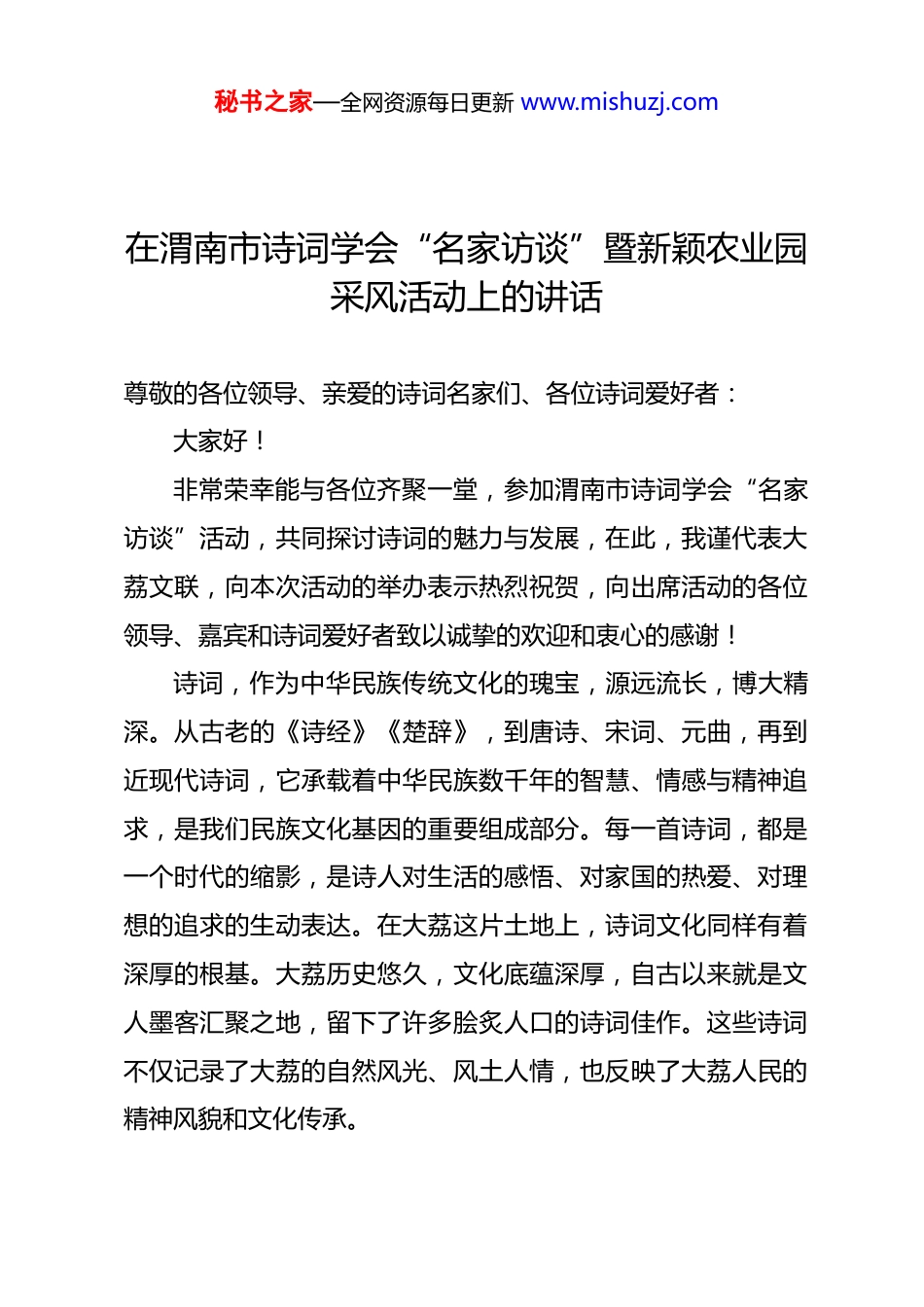 秘书之家—全网资源每日更新 www.mishuzj.com在渭南市诗词学会“名家访谈”暨新颖农业园采风活动上的讲话尊敬的各位领导、亲爱的诗词名家们、各位诗词爱好者:大家好!非常荣幸能与各位齐聚一堂,参加渭南市诗词学会“名家访谈”活动,共同探讨诗词的魅力与发展,在此,我谨代表大荔文联,向本次活动的举办表示热烈祝贺,向出席活动的各位领导、嘉宾和诗词爱好者致以诚挚的欢迎和衷心的感谢!诗词,作为中华民族传统文化的瑰宝,源远流长,博大精深。从古老的《诗经》《楚辞》,到唐诗、宋词、元曲,再到近现代诗词,它承载着中华民族数千年的智慧、情感与精神追求,是我们民族文化基因的重要组成部分。每一首诗词,都是一个时代的缩影,是诗人对生活的感悟、对家国的热爱、对理想的追求的生动表达。在大荔这片土地上,诗词文化同样有着深厚的根基。大荔历史悠久,文化底蕴深厚,自古以来就是文人墨客汇聚之地,留下了许多脍炙人口的诗词佳作。这些诗词不仅记录了大荔的自然风光、风土人情,也反映了大荔人民的精神风貌和文化传承。秘书之家—全网资源每日更新 www.mishuzj.com近年来,大荔文联高度重视诗词文化的传承与发展,积极组织开展各类诗词活动,致力于为诗词爱好者搭建交流平台,推动诗词创作的繁荣。举办了多届诗词大赛,吸引了众多县内外诗词爱好者踊跃参与,涌现出了一大批优秀的诗词作品和诗词人才;开展诗词讲座、培训,邀请省内外知名诗词专家前来授课,提高诗词爱好者的创作水平;组织诗词采风活动,让诗词创作者深入基层、走进生活,汲取创作灵感,创作出了许多贴近群众、反映时代的优秀作品。同时,我们还积极推动诗词文化“六进”活动,通过举办诗词朗诵会、诗词展览等形式,让更多的人了解诗词、喜爱诗词,营造了浓厚的诗词文化氛围。在推动诗词文化发展的过程中,我们也深刻认识到,诗词文化的传承与发展离不开各方的共同努力。此次渭南市诗词学会举办的“名家访谈”活动,为我县诗词的发展提供了一个难得的展示交流机会。在座的各位诗词名家都是诗词领域的佼佼者,有着深厚的诗词造诣和丰富的创作经验。希望通过今天的活动,为大荔诗词文化的发展注入新的活力。同时,也希望各位名家能够对大荔的诗词工作多提宝贵意见和建议,帮助我们更好地推动我县诗词文化的传承与发展。 最后,预祝本次“名家访谈”活动取得圆满成功!祝愿各秘书之家—全网资源每日更新 www.mishuzj.com位诗词爱好者创作丰收,佳作频出!谢谢大家!