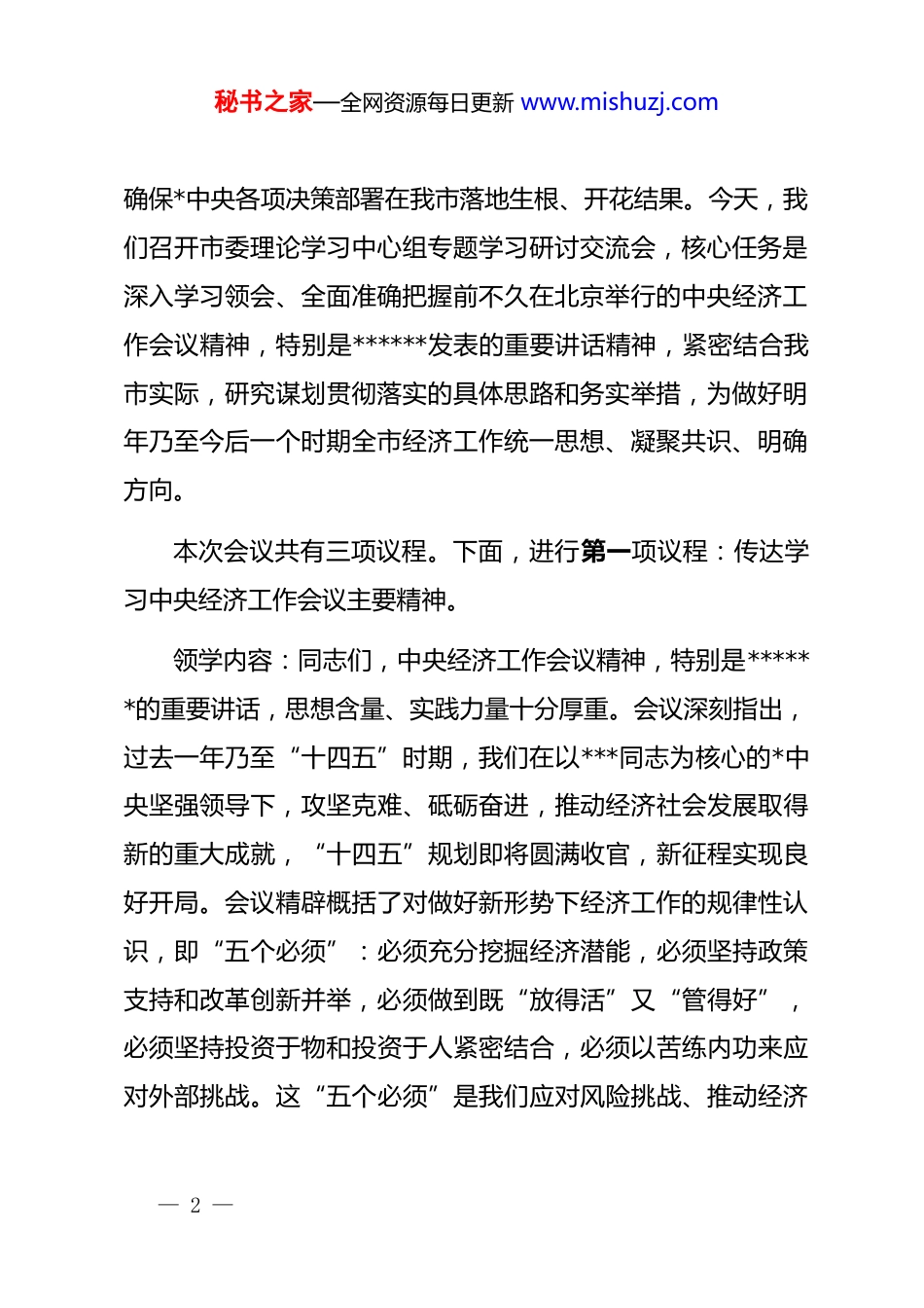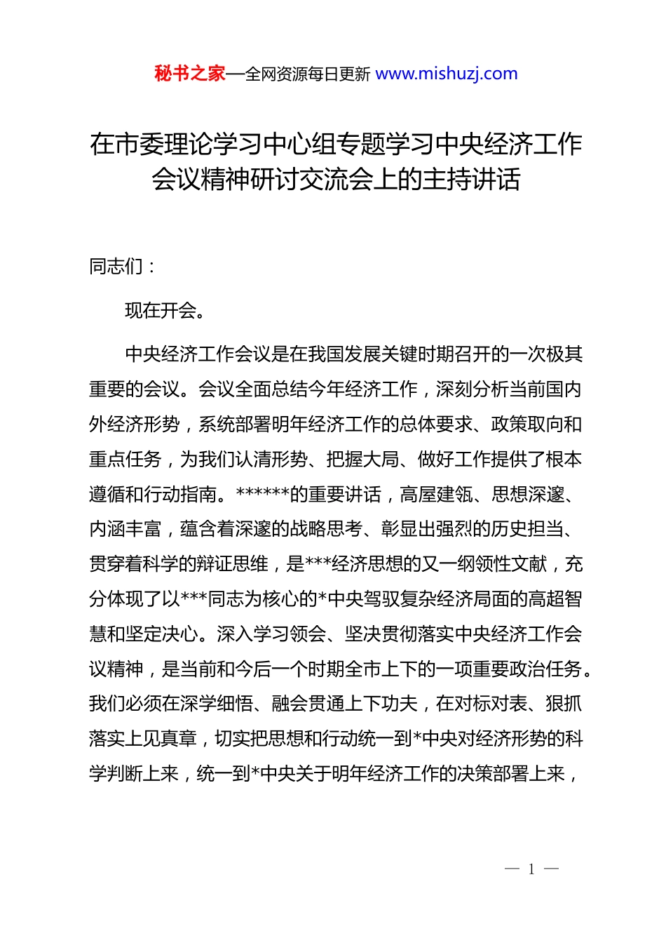 秘书之家—全网资源每日更新 www.mishuzj.com在市委理论学习中心组专题学习中央经济工作会议精神研讨交流会上的主持讲话同志们:现在开会。中央经济工作会议是在我国发展关键时期召开的一次极其重要的会议。会议全面总结今年经济工作,深刻分析当前国内外经济形势,系统部署明年经济工作的总体要求、政策取向和重点任务,为我们认清形势、把握大局、做好工作提供了根本遵循和行动指南。******的重要讲话,高屋建瓴、思想深邃、内涵丰富,蕴含着深邃的战略思考、彰显出强烈的历史担当、贯穿着科学的辩证思维,是***经济思想的又一纲领性文献,充分体现了以***同志为核心的*中央驾驭复杂经济局面的高超智慧和坚定决心。深入学习领会、坚决贯彻落实中央经济工作会议精神,是当前和今后一个时期全市上下的一项重要政治任务。我们必须在深学细悟、融会贯通上下功夫,在对标对表、狠抓落实上见真章,切实把思想和行动统一到*中央对经济形势的科学判断上来,统一到*中央关于明年经济工作的决策部署上来,— 1 —秘书之家—全网资源每日更新 www.mishuzj.com确保*中央各项决策部署在我市落地生根、开花结果。今天,我们召开市委理论学习中心组专题学习研讨交流会,核心任务是深入学习领会、全面准确把握前不久在北京举行的中央经济工作会议精神,特别是******发表的重要讲话精神,紧密结合我市实际,研究谋划贯彻落实的具体思路和务实举措,为做好明年乃至今后一个时期全市经济工作统一思想、凝聚共识、明确方向。本次会议共有三项议程。下面,进行第一项议程:传达学习中央经济工作会议主要精神。领学内容:同志们,中央经济工作会议精神,特别是******的重要讲话,思想含量、实践力量十分厚重。会议深刻指出,过去一年乃至“十四五”时期,我们在以***同志为核心的*中央坚强领导下,攻坚克难、砥砺奋进,推动经济社会发展取得新的重大成就,“十四五”规划即将圆满收官,新征程实现良好开局。会议精辟概括了对做好新形势下经济工作的规律性认识,即“五个必须”:必须充分挖掘经济潜能,必须坚持政策支持和改革创新并举,必须做到既“放得活”又“管得好”,必须坚持投资于物和投资于人紧密结合,必须以苦练内功来应对外部挑战。这“五个必须”是我们应对风险挑战、推动经济— 2 —秘书之家—全网资源每日更新 www.mishuzj.com持续回升向好的宝贵经验,必须长期坚持并不断丰富发展。会议科学研判了我国经济发展面临的形势,既正视“老问题、新挑战仍然不少”的现实,更坚定指出“我国经济长期向好的支撑条件和基本趋势没有改变”,要求我们坚定信心、用好优势、应对挑战。会议明确了做好明年经济工作的总体要求、政策取向和主要预期目标,强调要坚持稳中求进、以进促稳、先立后破,完整、准确、全面贯彻新发展理念,加快构建新发展格局,着力推动高质量发展,全面深化改革开放,推动高水平科技自立自强,统筹扩大内需和深化供给侧结构性改革,统筹新型城镇化和乡村全面振兴,统筹高质量发展和高水平安全,切实增强经济活力、防范化解风险、改善社会预期,巩固和增强经济回升向好态势,持续推动经济实现质的有效提升和量的合理增长,增进民生福祉,保持社会稳定,为“十五五”发展奠定坚实基础。会议对明年经济工作作出了系统部署,提出了涉及扩大内需、科技创新、改革开放、城乡区域、绿色转型、民生保障、风险化解等领域的重点任务。会议强调,必须坚持和加强*的全面领导,不折不扣抓落实、雷厉风行抓落实、求真务实抓落实、敢作善为抓落实,确保最终效果符合*中央决策意图。— 3 —秘书之家—全网资源每日更新 www.mishuzj.com全市各级*组织和广大*员干部,特别是各级领导干部,要深刻认识到,贯彻落实好中央经济工作会议精神,关系到我市能否在服务和融入新发展格局中展现新作为,关系到现代化建设的全局和长远。我们必须提高政治站位,强化责任担当,以高度的思想自觉、政治自觉、行动自觉抓好学习贯彻。………………下面,进行第二项议程:请部分市委常委同志作交流发言。………………刚才,几位常委同志结合各自分管领域,交流了学习体会和贯彻落实的初步思考,讲得都很...