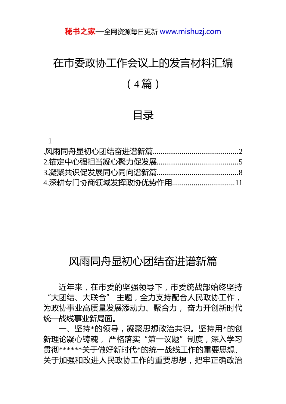 秘书之家—全网资源每日更新 www.mishuzj.com在市委政协工作会议上的发言材料汇编(4 篇)目录1.风雨同舟显初心团结奋进谱新篇............................................22.锚定中心强担当凝心聚力促发展..........................................53.凝聚共识促发展同心同向谱新篇..........................................84.深耕专门协商领域发挥政协优势作用................................11风雨同舟显初心团结奋进谱新篇近年来,在市委的坚强领导下,市委统战部始终坚持“大团结、大联合” 主题,全力支持配合人民政协工作,为政协事业高质量发展添动力、聚合力, 奋力开创新时代统一战线事业新局面。一、坚持*的领导,凝聚思想政治共识。坚持用*的创新理论凝心铸魂, 严格落实“第一议题”制度,深入学习贯彻******关于做好新时代*的统一战线工作的重要思想、关于加强和改进人民政协工作的重要思想,把牢正确政治秘书之家—全网资源每日更新 www.mishuzj.com方向。通过开展“xx”“xx”“xx”等 zt 教育活动,组织*外委员深入学习*的创新理论及路线方针政策,增进政治认同、思想认同、理论认同、情感认同。开展*外人士暑期恳谈会,市委统战部主要领导与*外人士集体谈心, 做好政策宣讲、解疑释惑等工作,引导*外委员深刻领悟“两个确立”的决定性意义,不断增强“四个意识”、坚定“四个自信”、做到“两个维护”。二、健全工作机制,强化工作协同配合。构建大统战工作格局,各级*委统战工作领导小组将同级政协办公室纳入成员单位,*委统战部部长兼任同级政协*组副书记。强化工作信息沟通机制,及时向政协通报全市统一战线重要情况和重要政策信息,主动邀请政协领导和有关委员参加统战领域重要会议和活动。深化意见沟通交流机制,在制定统战工作条例实施方案、落实统战工作责任制工作方案等重要政策文件时,主动征求政协意见建议,集思广益,共商良策。完善协商成果转化机制,建立政*协商跟踪问效反馈制度,对*外委员提出的协商意见,协调推动相关职能部门认真研究办理,及时反馈情况。加强工作配合保障,统筹做好省政协和民主*派省委会负责同志来铜调研安排,协同做好 6 名住铜*外省政协委员履职保障工作。三、着力培养推荐,加强委员队伍建设。在市委领导下,会同组织部门制定*外干部培养选拔工作规划,着力培养一支数量充足、结构合理、素质优良的*外干部队伍,为选用政协委员蓄足“源头活水”。严格工作标准程序,严把委员政治关、素质关和结构关,协商提名 xx 届市政协委员 xxx 名,其中*外委员 xxx 名、占比 xx%,配合安排 xx 届省政协*外委员 x 名,协助实现区县*外政协副主席在换届时应配尽配。加强培训提升能力素质,坚持每年举办*外人士能力提升培训班,20xx 年以来累计培训*外代表人士 xx 余人次,全市*外委员能力水平不断提升。四、围绕中心大局,同频共振同向发力。统筹安排政*秘书之家—全网资源每日更新 www.mishuzj.com协商和政协协商, 会同市政协机关制定年度政治协商计划,将全市重点工作和群众关心关切问题列为协商议题,开展协商活动。搭建知情明政平台,积极推动有关部门加强同*外委员的联系,牵头组织开展政*协商专题调研活动,让他们及时掌握全市重点工作动态,确保议政议在关键处、建言建在点子上。多渠道支持参政议政, 通过开展“xx”活动、年度重点课题调研、意见建议“直通车”等方式,支持*外委员深入调查研究,踊跃建言献策。20xx 年以来,年均开展政*协商活动 x 次,形成高质量政*协商意见 xxx 余篇,关于“我市现代化产业体系建设工作”政*协商报告获市委主要领导批示肯定。五、密切联谊交友,用心用情解疑释惑。制定*员领导干部与*外代表人士联谊交友意见,把*外委员纳入联谊交友对象,每名市级*员领导干部分别与 x 名*外代表人士结对子、交朋友。市级*员领导干部通过谈心谈话、走访慰问等方式,与*外代表人士联谊交友,掌握思想动态,帮助解决问题。市委统战部领导班子成员常态化联系*外代表人士并在每年市两会期间广泛与各界委员交流谈心,增强互信、凝聚共识。我们将认真学习贯彻******...