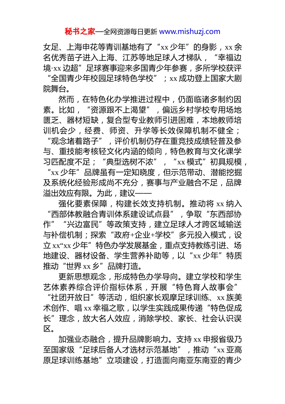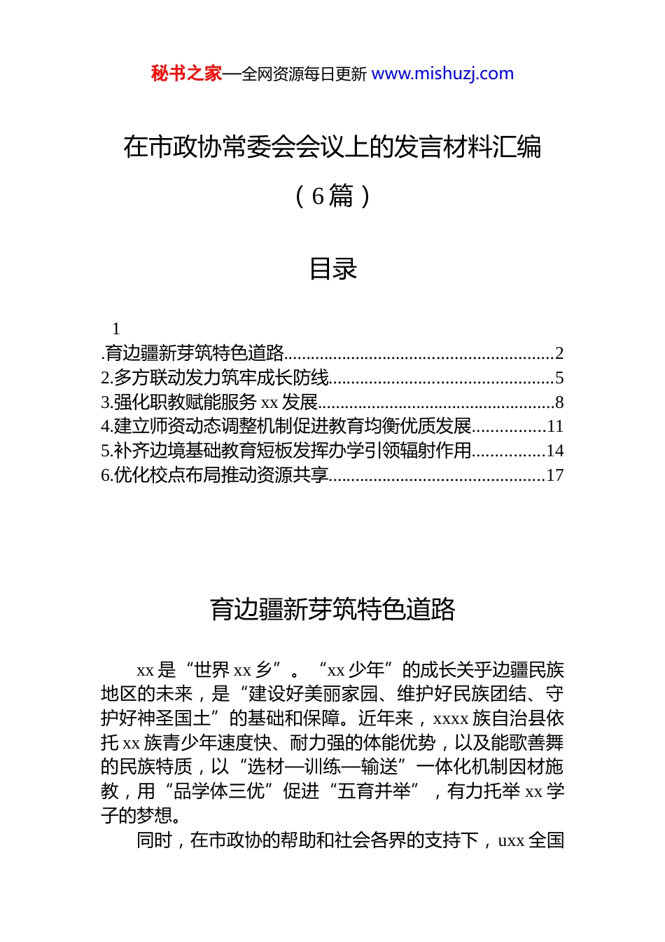 秘书之家—全网资源每日更新 www.mishuzj.com在市政协常委会会议上的发言材料汇编(6 篇)目录1.育边疆新芽筑特色道路............................................................22.多方联动发力筑牢成长防线..................................................53.强化职教赋能服务 xx 发展.....................................................84.建立师资动态调整机制促进教育均衡优质发展................115.补齐边境基础教育短板发挥办学引领辐射作用................146.优化校点布局推动资源共享................................................17育边疆新芽筑特色道路xx 是“世界 xx 乡”。“xx 少年”的成长关乎边疆民族地区的未来,是“建设好美丽家园、维护好民族团结、守护好神圣国土”的基础和保障。近年来,xxxx 族自治县依托 xx 族青少年速度快、耐力强的体能优势,以及能歌善舞的民族特质,以“选材—训练—输送”一体化机制因材施教,用“品学体三优”促进“五育并举”,有力托举 xx 学子的梦想。同时,在市政协的帮助和社会各界的支持下,uxx 全国秘书之家—全网资源每日更新 www.mishuzj.com女足、上海申花等青训基地有了“xx 少年”的身影,xx 余名优秀苗子进入上海、江苏等地足球人才梯队,“幸福边境·xx 边超”足球赛事迎来多国青少年参赛,多所学校获评“全国青少年校园足球特色学校”;xx 成功登上国家大剧院舞台。然而,在特色化办学推进过程中,仍面临诸多制约因素。比如,“资源跟不上渴望”,偏远乡村学校专用场地匮乏、器材短缺,复合型专业教师引进困难,本地教师培训机会少,经费、师资、升学等长效保障机制不健全;“观念堵着路子”,评价机制仍存在重竞技成绩轻普及参与、重技能考核轻文化内涵的倾向,特色教育与文化课学习匹配度不足;“典型选树不浓”,“xx 模式”初具规模,“xx 少年”品牌虽有一定知晓度,但示范带动、潜能挖掘及系统化经验形成尚不充分,赛事与产业融合不足,品牌溢出效应有限。为此,建议——强化要素保障,构建长效支持机制。推动将 xx 纳入“西部体教融合青训体系建设试点县”,争取“东西部协作”“兴边富民”等政策支持,建立足球人才跨区域输送与补偿机制;探索“政府+企业+学校”多元投入模式,设立 xx“xx 少年”特色办学发展基金,重点支持教练引进、场地建设、器材设备、学生营养补助等,以“xx 少年”特质推动“世界 xx 乡”品牌打造。更新思想观念,形成特色办学导向。建立学校和学生艺体素养综合评价指标体系,开展“特色育人故事会”“社团开放日”等活动,组织家长观摩足球训练、xx 族美术创作、唱 xx 幸福之歌,以学生实践成果传递“特色促成长”理念,放大名人效应,消除学校、家长、社会认识误区。加强业态融合,提升品牌影响力。支持 xx 申报省级乃至国家级“足球后备人才选材示范基地”,推动“xx 亚高原足球训练基地”立项建设,打造面向南亚东南亚的青少秘书之家—全网资源每日更新 www.mishuzj.com年足球交流中心;推动“幸福边境杯”提档升级,与旅游文化、商贸等产业深度融合,打造“足球+旅游”“足球+文化”等特色项目,扩大品牌辐射面,增强 xx 辨识度。不断总结推广经验,推动全市特色办学高质量发展。边疆民族地区教育发展没有“快车道”,每一个 xx 少年的梦想都值得我们全力以赴。“xx 少年”不仅是 xx 的品牌,还是 xx 边疆民族地区教育融合发展的重要载体。建议组织专家团队深入 xx 县调研,系统总结选材机制、训练体系、赛事运营等方面的成功经验,推动“一校一品”向“一域一特”升级,为边疆民族地区教育高质量发展提供“xx 样本”。多方联动发力筑牢成长防线近年来,xx 县因家庭经济困难导致孩子失学辍学问题已经得到解决,但是因孩子厌学造成就学不稳定现象日趋突出。孩子厌学并非单一因素导致,而是家庭、学校、社会三方协调配合不到位,多种因素叠加的结果。家庭环境是基础因素。在教育方式上,父母或过度施压导致孩子焦虑抵触,或过度溺爱使其学习动力弱。家庭结构失衡如关系紧张、留守等情况,使孩子缺乏安全感而...