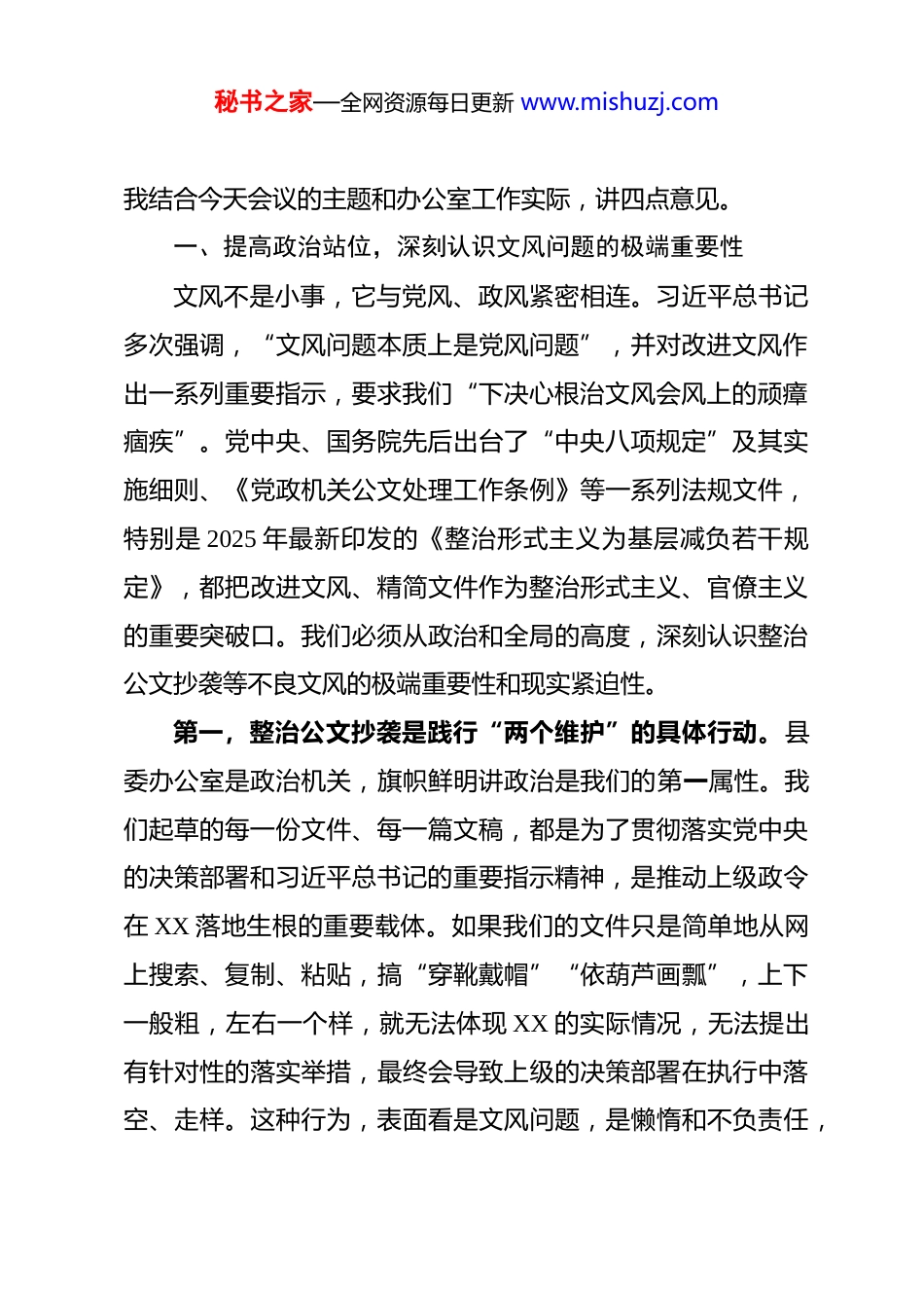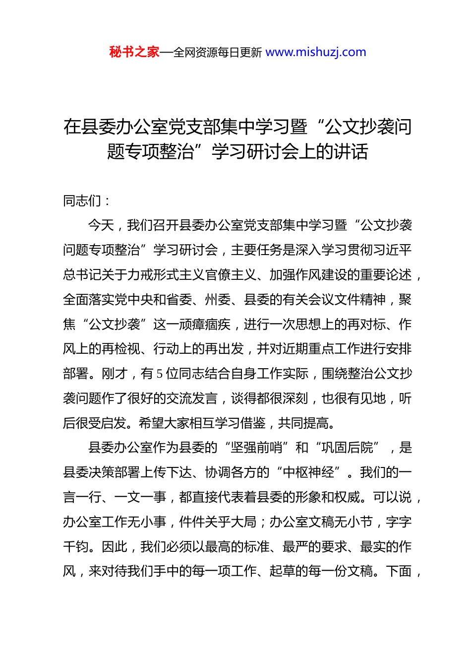 秘书之家—全网资源每日更新 www.mishuzj.com在县委办公室党支部集中学习暨“公文抄袭问题专项整治”学习研讨会上的讲话同志们:今天,我们召开县委办公室党支部集中学习暨“公文抄袭问题专项整治”学习研讨会,主要任务是深入学习贯彻习近平总书记关于力戒形式主义官僚主义、加强作风建设的重要论述,全面落实党中央和省委、州委、县委的有关会议文件精神,聚焦“公文抄袭”这一顽瘴痼疾,进行一次思想上的再对标、作风上的再检视、行动上的再出发,并对近期重点工作进行安排部署。刚才,有 5 位同志结合自身工作实际,围绕整治公文抄袭问题作了很好的交流发言,谈得都很深刻,也很有见地,听后很受启发。希望大家相互学习借鉴,共同提高。县委办公室作为县委的“坚强前哨”和“巩固后院”,是县委决策部署上传下达、协调各方的“中枢神经”。我们的一言一行、一文一事,都直接代表着县委的形象和权威。可以说,办公室工作无小事,件件关乎大局;办公室文稿无小节,字字千钧。因此,我们必须以最高的标准、最严的要求、最实的作风,来对待我们手中的每一项工作、起草的每一份文稿。下面,秘书之家—全网资源每日更新 www.mishuzj.com我结合今天会议的主题和办公室工作实际,讲四点意见。一、提高政治站位,深刻认识文风问题的极端重要性文风不是小事,它与党风、政风紧密相连。习近平总书记多次强调,“文风问题本质上是党风问题”,并对改进文风作出一系列重要指示,要求我们“下决心根治文风会风上的顽瘴痼疾”。党中央、国务院先后出台了“中央八项规定”及其实施细则、《党政机关公文处理工作条例》等一系列法规文件,特别是 2025 年最新印发的《整治形式主义为基层减负若干规定》,都把改进文风、精简文件作为整治形式主义、官僚主义的重要突破口。我们必须从政治和全局的高度,深刻认识整治公文抄袭等不良文风的极端重要性和现实紧迫性。第一,整治公文抄袭是践行“两个维护”的具体行动。县委办公室是政治机关,旗帜鲜明讲政治是我们的第一属性。我们起草的每一份文件、每一篇文稿,都是为了贯彻落实党中央的决策部署和习近平总书记的重要指示精神,是推动上级政令在 XX 落地生根的重要载体。如果我们的文件只是简单地从网上搜索、复制、粘贴,搞“穿靴戴帽”“依葫芦画瓢”,上下一般粗,左右一个样,就无法体现 XX 的实际情况,无法提出有针对性的落实举措,最终会导致上级的决策部署在执行中落空、走样。这种行为,表面看是文风问题,是懒惰和不负责任,秘书之家—全网资源每日更新 www.mishuzj.com但实质上是政治站位不高、大局意识不强、看齐意识不够的表现,是对“两个维护”的虚化和弱化。我们必须清醒地认识到,坚决杜绝公文抄袭,就是以实际行动确保党中央政令畅通,确保县委决策部署不折不扣得到执行。第二,整治公文抄袭是力戒形式主义的必然要求。形式主义是党和人民事业的大敌。公文抄袭,正是形式主义在文稿工作中的典型表现。有的同志为了图省事、走捷径,不去深入基层调研,不去认真思考研究,而是习惯于当“搬运工”和“拼接师”,把别人的东西改个标题、换个地名就当成自己的成果。近期,媒体就曝光了邻近 XX 地区出现的“张冠李戴”式公文抄袭事件,一份事关地方长远发展的《森林防火规划》,其核心内容竟然与数百公里外的另一个县的文本高度雷同,甚至连乡镇名称都未作修改,造成了极为恶劣的社会影响,严重损害了党委政府的公信力。这给我们敲响了警钟。这种“以文件落实文件”的虚浮作风,不仅不能解决任何实际问题,反而会助长“文山会海”,加重基层负担,败坏党风政风。我们必须下大力气整治这种顽疾,大力弘扬求真务实、真抓实干的优良作风。第三,整治公文抄袭是提升辅政水平的内在需要。以文辅政是党委办公室的核心职能。我们服务的质量和水平,直接关秘书之家—全网资源每日更新 www.mishuzj.com系到县委决策的科学性和精准性。高质量的文稿,来源于对县情的深入把握、对政策的深刻理解、对问题的深入研究。抄袭出来的文稿,必然是言之无物、空洞乏味,缺乏思想性、针对性和指导性,不可能为领导决策提供有价值的参考。根据初...