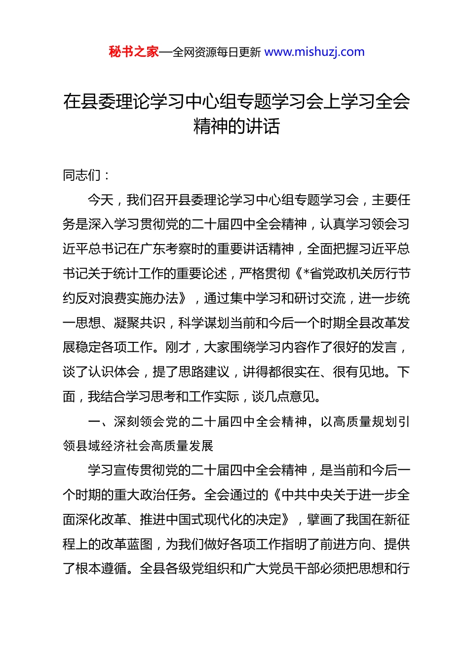 秘书之家—全网资源每日更新 www.mishuzj.com在县委理论学习中心组专题学习会上学习全会精神的讲话 同志们:今天,我们召开县委理论学习中心组专题学习会,主要任务是深入学习贯彻党的二十届四中全会精神,认真学习领会习近平总书记在广东考察时的重要讲话精神,全面把握习近平总书记关于统计工作的重要论述,严格贯彻《*省党政机关厉行节约反对浪费实施办法》,通过集中学习和研讨交流,进一步统一思想、凝聚共识,科学谋划当前和今后一个时期全县改革发展稳定各项工作。刚才,大家围绕学习内容作了很好的发言,谈了认识体会,提了思路建议,讲得都很实在、很有见地。下面,我结合学习思考和工作实际,谈几点意见。一、深刻领会党的二十届四中全会精神,以高质量规划引领县域经济社会高质量发展学习宣传贯彻党的二十届四中全会精神,是当前和今后一个时期的重大政治任务。全会通过的《中共中央关于进一步全面深化改革、推进中国式现代化的决定》,擘画了我国在新征程上的改革蓝图,为我们做好各项工作指明了前进方向、提供了根本遵循。全县各级党组织和广大党员干部必须把思想和行秘书之家—全网资源每日更新 www.mishuzj.com动统一到党中央决策部署上来,以高度的政治自觉、思想自觉和行动自觉,推动全会精神在*县落地生根、开花结果。(一)要深刻把握全会的核心要义和实践要求。党的二十届三中全会精神的核心要义在于进一步全面深化改革、推进中国式现代化。这不是简单的政策延续,而是基于新发展阶段、新发展理念、新发展格局作出的重大战略部署。我们要准确把握改革的阶段性特征,认识到当前改革进入了深水区、攻坚期,面临的矛盾更加复杂,任务更加艰巨。必须以更大的政治勇气和智慧,冲破思想观念束缚,突破利益固化藩篱,敢于啃硬骨头,敢于涉险滩。要把学习贯彻全会精神与习近平新时代中国特色社会主义思想结合起来,与习近平总书记历次来陕考察重要讲话重要指示结合起来,做到学思用贯通、知信行统一。(二)要高标准编制“十五五”规划,科学谋划未来发展路径。“十五五”时期是我国基本实现社会主义现代化承前启后的关键阶段,也是*县追赶超越、高质量发展的重要窗口期。规划编制工作必须立足当前、着眼长远,坚持高点站位、系统思维。要深入研究国家重大战略,主动对接*城市群、*经济区等区域发展规划,找准*县在国家和省级战略中的定位。要准确把握县域经济发展的阶段性特征,立足资源禀赋、产业基础和区位条件,科学确定发展目标、重点任务和实施路径。规划既秘书之家—全网资源每日更新 www.mishuzj.com要有战略性和前瞻性,又要有针对性和可操作性,确保规划能够真正引领未来五年改革发展。在规划编制过程中,要重点把握好几个关系:一是速度与质量的关系。必须坚持高质量发展这个首要任务,不简单以GDP 论英雄,但也不能忽视必要的增长速度。要设定合理的经济增长预期,力争地区生产总值年均增长保持在合理区间,确保到 2025 年经济总量突破*亿元,人均 GDP 达到*万元。二是总量与结构的关系。当前我县三次产业结构为*:*:*,二产占比偏低、三产质量不高的问题依然突出。必须把产业结构调整作为主攻方向,推动制造业高端化、智能化、绿色化发展,提升现代服务业发展水平,构建现代化产业体系。三是发展与民生的关系。规划编制要坚持以人民为中心,把增进民生福祉作为出发点和落脚点,在教育、医疗、养老、就业等领域谋划一批重大项目,让发展成果更多更公平惠及全县人民。(三)要凝聚发展合力,营造浓厚改革氛围。全面深化改革是一项系统工程,需要全县上下共同参与、协同推进。领导干部要发挥“关键少数”作用,带头学习、带头调研、带头谋划,形成一级抓一级、层层抓落实的工作格局。要广泛征求社会各界意见,把规划编制过程变成统一思想、凝聚共识、汇聚力量的过程。要加大宣传引导力度,深入解读全会精神和规划秘书之家—全网资源每日更新 www.mishuzj.com思路,引导广大干部群众理解改革、支持改革、参与改革,形成推动高质量发展的强大合力。二、深入学习贯彻习近平总书记广东考察重要讲话精神,推动高水平改革开放习近平总书记在广东考察时...