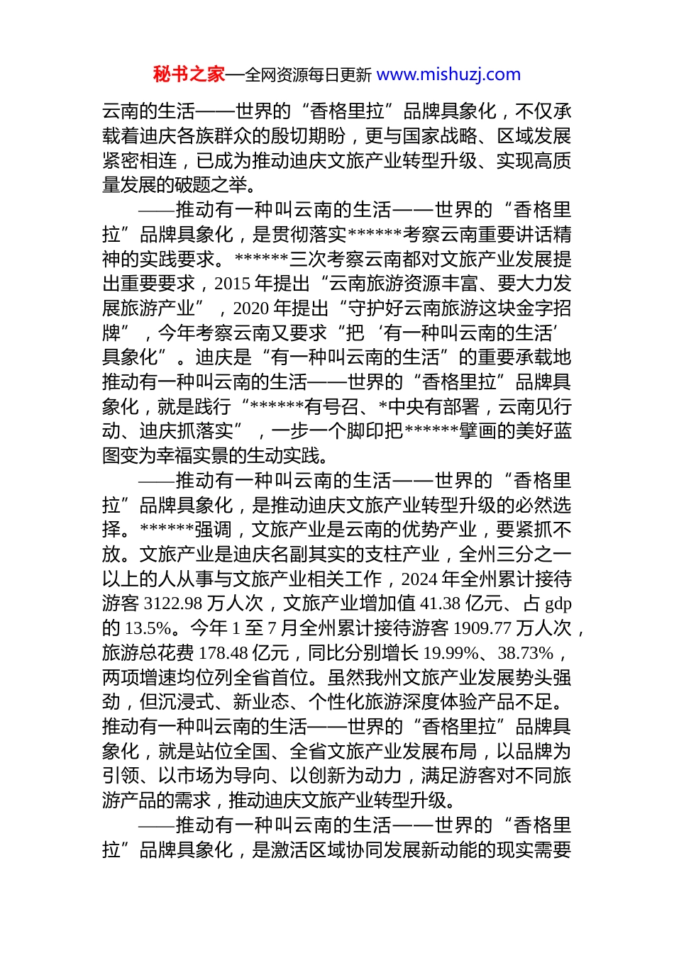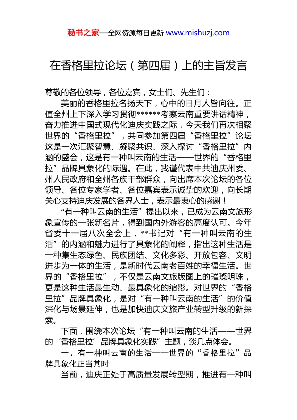 秘书之家—全网资源每日更新 www.mishuzj.com在香格里拉论坛(第四届)上的主旨发言尊敬的各位领导,各位嘉宾,女士们、先生们:美丽的香格里拉名扬天下,心中的日月人皆向往。正值全州上下深入学习贯彻******考察云南重要讲话精神,奋力推进中国式现代化迪庆实践之际,今天我们再次相聚世界的“香格里拉”,共同参加第四届“香格里拉”论坛这是一次汇聚智慧、凝聚共识、深入探讨“香格里拉”内涵的盛会,这是有一种叫云南的生活——世界的“香格里拉”品牌具象化的际遇。在此,我谨代表中共迪庆州委、州人民政府和全州各族干部群众,向出席本次论坛的各位领导、各位专家学者、各位嘉宾表示诚挚的欢迎,向长期关心支持迪庆发展的各界人士,表示最衷心的感谢!“有一种叫云南的生活”提出以来,已成为云南文旅形象宣传的一张新名片,得到国内外游客的高度认可。今年省委十一届八次全会上,**书记对“有一种叫云南的生活”的内涵和魅力进行了具象化的阐释,指出这种生活是一种集生态绿色、民族团结、文化多彩、开放包容、文明进步为一体的生活,是新时代云南老百姓的幸福生活。世界的“香格里拉”,不仅是云南文旅版图上的璀璨明珠,更是这种生活最生动、最具象化的缩影。对世界的“香格里拉”品牌具象化,是对“有一种叫云南的生活”的价值深化与场景延伸,也是加快迪庆文旅产业转型升级的新探索。下面,围绕本次论坛“有一种叫云南的生活——世界的‘香格里拉’品牌具象化实践”主题,谈几点体会。一、有一种叫云南的生活——世界的“香格里拉”品牌具象化正当其时当前,迪庆正处于高质量发展转型期,推进有一种叫秘书之家—全网资源每日更新 www.mishuzj.com云南的生活——世界的“香格里拉”品牌具象化,不仅承载着迪庆各族群众的殷切期盼,更与国家战略、区域发展紧密相连,已成为推动迪庆文旅产业转型升级、实现高质量发展的破题之举。——推动有一种叫云南的生活——世界的“香格里拉”品牌具象化,是贯彻落实******考察云南重要讲话精神的实践要求。******三次考察云南都对文旅产业发展提出重要要求,2015 年提出“云南旅游资源丰富、要大力发展旅游产业”,2020 年提出“守护好云南旅游这块金字招牌”,今年考察云南又要求“把‘有一种叫云南的生活’具象化”。迪庆是“有一种叫云南的生活”的重要承载地推动有一种叫云南的生活——世界的“香格里拉”品牌具象化,就是践行“******有号召、*中央有部署,云南见行动、迪庆抓落实”,一步一个脚印把******擘画的美好蓝图变为幸福实景的生动实践。——推动有一种叫云南的生活——世界的“香格里拉”品牌具象化,是推动迪庆文旅产业转型升级的必然选择。******强调,文旅产业是云南的优势产业,要紧抓不放。文旅产业是迪庆名副其实的支柱产业,全州三分之一以上的人从事与文旅产业相关工作,2024 年全州累计接待游客 3122.98 万人次,文旅产业增加值 41.38 亿元、占 gdp的 13.5%。今年 1 至 7 月全州累计接待游客 1909.77 万人次,旅游总花费 178.48 亿元,同比分别增长 19.99%、38.73%,两项增速均位列全省首位。虽然我州文旅产业发展势头强劲,但沉浸式、新业态、个性化旅游深度体验产品不足。推动有一种叫云南的生活——世界的“香格里拉”品牌具象化,就是站位全国、全省文旅产业发展布局,以品牌为引领、以市场为导向、以创新为动力,满足游客对不同旅游产品的需求,推动迪庆文旅产业转型升级。——推动有一种叫云南的生活——世界的“香格里拉”品牌具象化,是激活区域协同发展新动能的现实需要秘书之家—全网资源每日更新 www.mishuzj.com******强调,旅游是传播文明、交流文化、增进友谊的桥梁。迪庆地处滇川藏三省(区)交界处,是“滇西北旅游环线”“金沙江旅游经济带”“香格里拉生态旅游区”三条旅游带的关键节点。“香格里拉”品牌影响力,不仅关乎自身发展,也对周边区域协同发展产生辐射带动作用。推动有一种叫云南的生活——世界的“香格里拉”品牌具象化,可以充分发挥迪庆区位优势,通过差异化定位,避免区域间同质化竞争,加强与周边区域交通互联、产业互补、客源互送等方面的深度合...