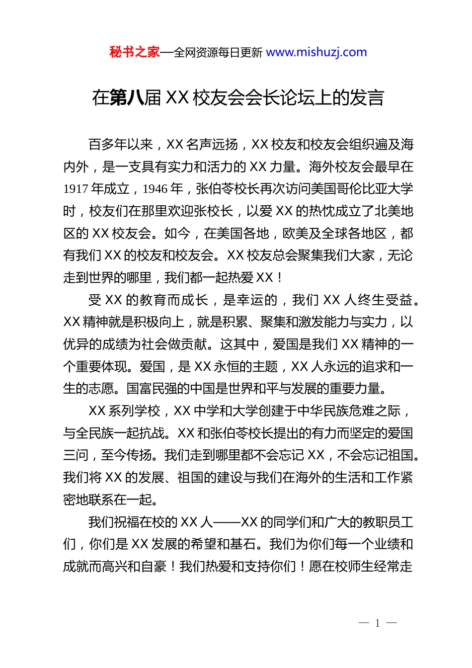 秘书之家—全网资源每日更新 www.mishuzj.com在第八届 XX 校友会会长论坛上的发言百多年以来,XX 名声远扬,XX 校友和校友会组织遍及海内外,是一支具有实力和活力的 XX 力量。海外校友会最早在1917 年成立,1946 年,张伯苓校长再次访问美国哥伦比亚大学时,校友们在那里欢迎张校长,以爱 XX 的热忱成立了北美地区的 XX 校友会。如今,在美国各地,欧美及全球各地区,都有我们 XX 的校友和校友会。XX 校友总会聚集我们大家,无论走到世界的哪里,我们都一起热爱 XX!受 XX 的教育而成长,是幸运的,我们 XX 人终生受益。XX 精神就是积极向上,就是积累、聚集和激发能力与实力,以优异的成绩为社会做贡献。这其中,爱国是我们 XX 精神的一个重要体现。爱国,是 XX 永恒的主题,XX 人永远的追求和一生的志愿。国富民强的中国是世界和平与发展的重要力量。XX 系列学校,XX 中学和大学创建于中华民族危难之际,与全民族一起抗战。XX 和张伯苓校长提出的有力而坚定的爱国三问,至今传扬。我们走到哪里都不会忘记 XX,不会忘记祖国。我们将 XX 的发展、祖国的建设与我们在海外的生活和工作紧密地联系在一起。我们祝福在校的 XX 人——XX 的同学们和广大的教职员工们,你们是 XX 发展的希望和基石。我们为你们每一个业绩和成就而高兴和自豪!我们热爱和支持你们!愿在校师生经常走— 1 —秘书之家—全网资源每日更新 www.mishuzj.com访世界各地,与我们海外校友联系,交流、合作。在碰撞中激发新思想和新思路,创意、创新,锐意进取。在新的时代中,追求进步,走向未来!在渤海之滨,白河之津,我们唱响 XX 的歌!发挥 XX 力量,弘扬 XX 精神!XX 赓续发展,永远向前!我们“允公允能,日新月异”!— 2 —