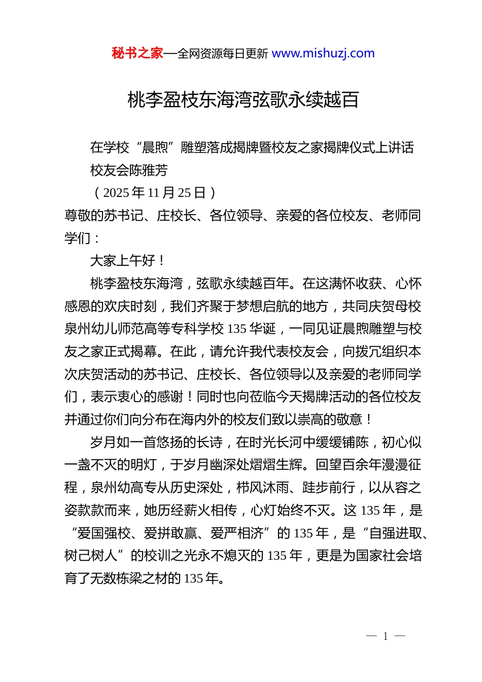 秘书之家—全网资源每日更新 www.mishuzj.com桃李盈枝东海湾弦歌永续越百在学校“晨煦”雕塑落成揭牌暨校友之家揭牌仪式上讲话校友会陈雅芳(2025 年 11 月 25 日)尊敬的苏书记、庄校长、各位领导、亲爱的各位校友、老师同学们:大家上午好!桃李盈枝东海湾,弦歌永续越百年。在这满怀收获、心怀感恩的欢庆时刻,我们齐聚于梦想启航的地方,共同庆贺母校泉州幼儿师范高等专科学校 135 华诞,一同见证晨煦雕塑与校友之家正式揭幕。在此,请允许我代表校友会,向拨冗组织本次庆贺活动的苏书记、庄校长、各位领导以及亲爱的老师同学们,表示衷心的感谢!同时也向莅临今天揭牌活动的各位校友并通过你们向分布在海内外的校友们致以崇高的敬意!岁月如一首悠扬的长诗,在时光长河中缓缓铺陈,初心似一盏不灭的明灯,于岁月幽深处熠熠生辉。回望百余年漫漫征程,泉州幼高专从历史深处,栉风沐雨、跬步前行,以从容之姿款款而来,她历经薪火相传,心灯始终不灭。这 135 年,是“爱国强校、爱拼敢赢、爱严相济”的 135 年,是“自强进取、树己树人”的校训之光永不熄灭的 135 年,更是为国家社会培育了无数栋梁之材的 135 年。— 1 —秘书之家—全网资源每日更新 www.mishuzj.com今日的泉州幼高专,宛如一颗在教育星空中熠熠生辉的明珠,已然成为一所特色鲜明、声誉远扬的学府。我们欣喜地看到,在苏书记、庄校长带领下,母校承前继后、继往开来,以百年深厚文化为根,以创新发展为翼,在党建工作、学校转型、专业优化、双师建构、教学改革、产教融合、人才培养、科研实力、培训服务、国际拓展等方面成果丰硕,为区域社会、经济发展作出突出贡献,其辉煌成就不仅是闽南基础教育的高光时刻,更是中国职业教育“小而精、特而强”的生动范本。让我们以热烈的掌声,向亲爱母校,以及所有为她的荣光而拼搏奋斗的领导、老师同学们致以最崇高的敬意!回眸百年芳华,母校的荣耀,是由每一位校友的人生篇章共同谱写而成的壮丽史诗。校友是母校办学成果的骄傲,是师母校精神天空中璀璨的星光。一代代学子在这里汲取智慧、涵养品格,而后怀揣梦想奔赴四方,在各行各业绽放光彩。我们见证了无数校友坚守教育阵地,不忘育人初心,他们凭借着高尚的师德和扎实的学识,成为教育部职业院校教育类教指委委员、福建省杰出人民教师、师德楷模、特级教师、优秀园长、基础教育骨干等,用爱与智慧点亮万千孩童的梦想;我们也看到了许多校友在学术、管理、文化、创业等广阔天地中大显身手,将母校赋予的品格与能力,转化为服务社会、贡献国家的坚实力量。尤为可贵的是,无论你们成就何等事业,身居何方,心中始终怀着对母校最深切的眷恋。你们或慷慨捐资助力母校— 2 —秘书之家—全网资源每日更新 www.mishuzj.com发展,或重返校园为莘莘学子传经送宝。滴水之恩当涌泉相报,这份深厚的反哺之情,是母校最珍贵的财富,是推动学校永续发展的强大动力引擎。为庆祝母校 135 岁生日,今年以来,母校的校领导、老师以及校友会的副会长们,积极联系 18 个联络处的校友,奔赴八闽大地召开座谈会、拍摄视频,共祝母校生日快乐!共叙母校培养之恩,发动校友为母校做贡献。正是你们的慷慨资助、无私奉献,才使得今日这两个的项目得以顺利推进、圆满落地,大家辛苦了!母校的春华秋实,如诗如画,我们深感自豪;校园的日新月异,蓬勃发展,我们满怀喜悦。今天,我们齐聚于此热烈祝贺校园文化新地标——“晨煦雕塑”庄严落成。作为校友专属的精神符号,她代表母校永远如旭日东升,蒸蒸日上,洋溢着无限的生机与活力;也诉说着母校与校友之间的情谊犹如晨曦般纯粹而明亮,温暖而持久。她不仅是一处优美的风景,如一幅美丽的画卷,让人赏心悦目;更是一座精神的灯塔,在茫茫大海中为师生们指引方向。象征了基础教育事业如晨曦般充满希望与活力,也寓意着母校的未来必将光明灿烂,前程似锦!同时,我们也由衷欢庆“校友之家”及“校友信息查询系统”正式启用。校友信息查询系统宛如一个巨大的“记忆数据库”,内置了学籍、芳名录、捐赠、毕业合影、新闻等五大查询展示功能,并配备了先进的壁挂触控一体...