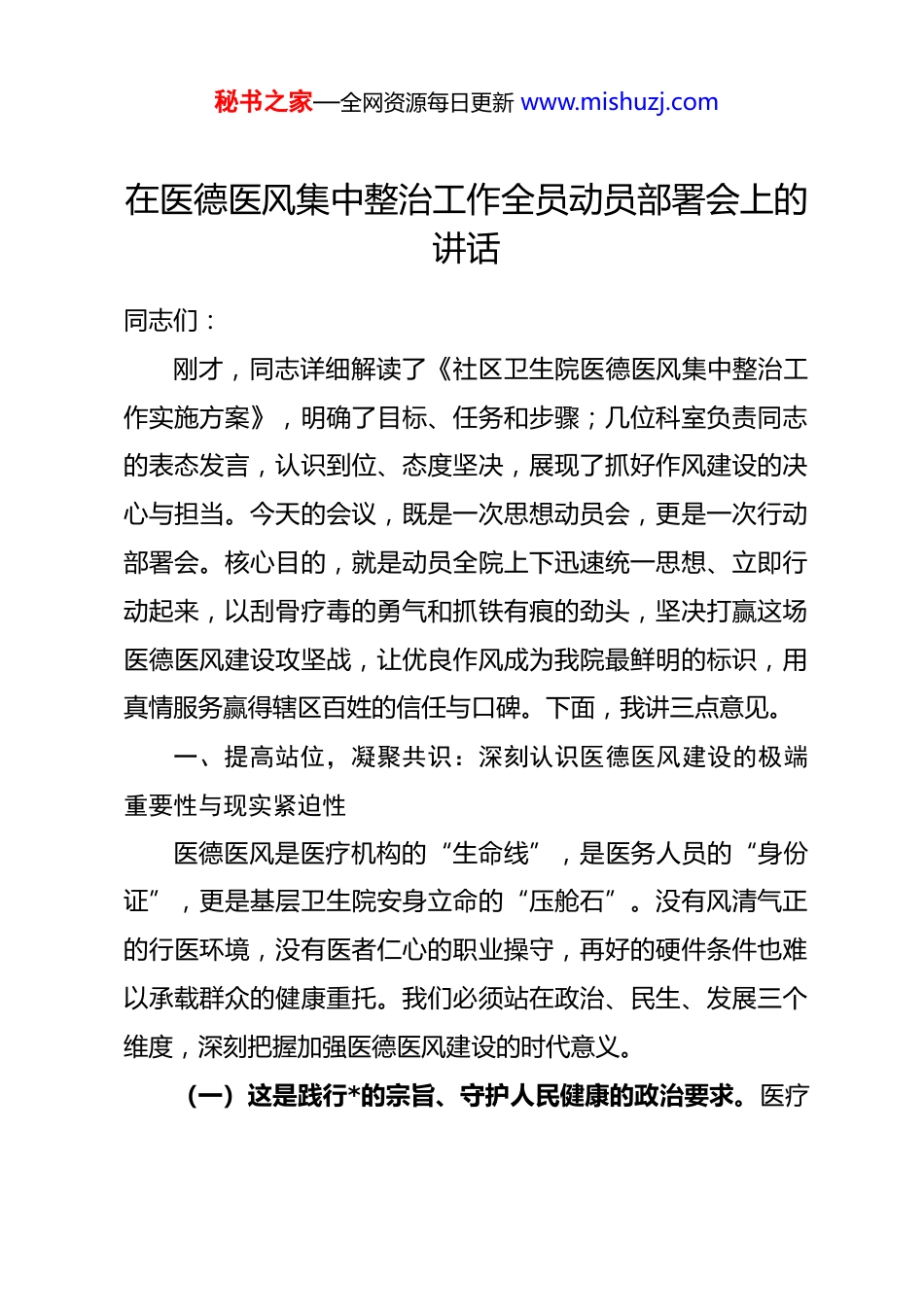 秘书之家—全网资源每日更新 www.mishuzj.com在医德医风集中整治工作全员动员部署会上的讲话同志们:刚才,同志详细解读了《社区卫生院医德医风集中整治工作实施方案》,明确了目标、任务和步骤;几位科室负责同志的表态发言,认识到位、态度坚决,展现了抓好作风建设的决心与担当。今天的会议,既是一次思想动员会,更是一次行动部署会。核心目的,就是动员全院上下迅速统一思想、立即行动起来,以刮骨疗毒的勇气和抓铁有痕的劲头,坚决打赢这场医德医风建设攻坚战,让优良作风成为我院最鲜明的标识,用真情服务赢得辖区百姓的信任与口碑。下面,我讲三点意见。一、提高站位,凝聚共识:深刻认识医德医风建设的极端重要性与现实紧迫性医德医风是医疗机构的“生命线”,是医务人员的“身份证”,更是基层卫生院安身立命的“压舱石”。没有风清气正的行医环境,没有医者仁心的职业操守,再好的硬件条件也难以承载群众的健康重托。我们必须站在政治、民生、发展三个维度,深刻把握加强医德医风建设的时代意义。(一)这是践行*的宗旨、守护人民健康的政治要求。医疗秘书之家—全网资源每日更新 www.mishuzj.com卫生事业是*联系服务群众的重要纽带。坚持“以人民为中心”的发展思想,具体到我们卫生院,就是要将患者的满意度作为最高标准,将群众的健康需求作为第一信号。当前,从国家到地方,对卫生健康领域作风建设的要求之严、标准之高前所未有。我们必须清醒认识到,抓好医德医风,不仅是业务工作,更是严肃的政治任务,是检验我们是否真正做到“两个维护”、是否站稳人民立场的试金石。全院上下必须将思想和行动统一到上级部署要求上来,以高度的政治自觉抓好整治工作。(二)这是回应群众关切、重塑行业形象的迫切需要。应当肯定,我院绝大多数医务人员恪尽职守、辛勤付出,为保障辖区居民健康作出了积极贡献。但我们必须坚持问题导向,敢于直面不足。结合日常接诊、投诉反馈和上级检查情况来看,一些问题依然存在:少数同志服务意识淡薄,对患者缺乏同理心,存在“生、冷、硬、顶、推”现象;部分诊疗环节流程不够优化,存在沟通解释不充分、告知不到位的情况;个别人员纪律观念松懈,对行业“九不准”等规定执行不够严格。这些现象虽然发生在个别人、个别环节,但伤害的是患者感情,损害的是医院声誉,动摇的是群众对我们的信任根基。对此,我们必须保持警醒,以坚决的态度予以纠治。秘书之家—全网资源每日更新 www.mishuzj.com(三)这是推动医院发展、提升核心竞争力的内在动力。在医疗卫生服务体系不断完善、群众就医选择日益多元的今天,基层卫生院的竞争,归根结底是服务与信誉的竞争。优良的医德医风,是最好的“金字招牌”,是最强的“核心竞争力”。它能凝聚人心、鼓舞士气,能吸引患者、留住人才,能为医院高质量发展注入源源不断的正能量。反之,如果医德医风出了问题,就会人心涣散、形象受损,最终制约医院的长远发展。我们必须将此次集中整治,作为一次深刻的自我革命和难得的发展机遇,通过祛除作风积弊,激发内生动力,为医院可持续发展夯实基础。二、聚焦问题,靶向施策:准确把握集中整治工作的关键环节与重点任务此次集中整治,不能搞“大水漫灌”,必须坚持问题导向,精准发力。要紧紧围绕《方案》部署,聚焦突出问题,紧盯关键环节,确保整治工作取得实实在在的成效。(一)聚焦“服务态度”抓整治,着力提升患者就医感受。要将改善服务态度作为突破口。坚决整治态度冷漠、言语生硬、缺乏耐心等问题。推行文明用语、微笑服务,落实首问负责、首诊负责制。优化服务流程,减少患者等候时间,改善就诊环境。要畅通患者投诉渠道,建立快速响应和反馈机制,秘书之家—全网资源每日更新 www.mishuzj.com让患者感受到尊重与温暖。(二)聚焦“诊疗行为”抓规范,着力保障医疗质量安全。要严格规范诊疗服务全过程。重点整治不合理检查、不合理用药、不合理治疗等行为。严格遵守临床诊疗指南和技术操作规范,坚持因病施治、合理医疗。加强处方点评和医疗质量监控,强化医疗核心制度落实。通过规范行为,提升医疗服务的同质化、标准化水平,守住医疗安全底线。...