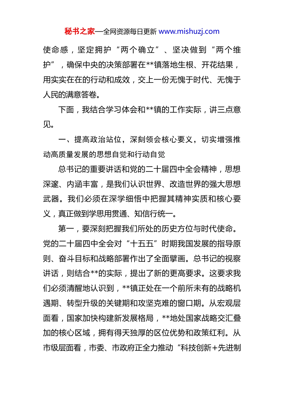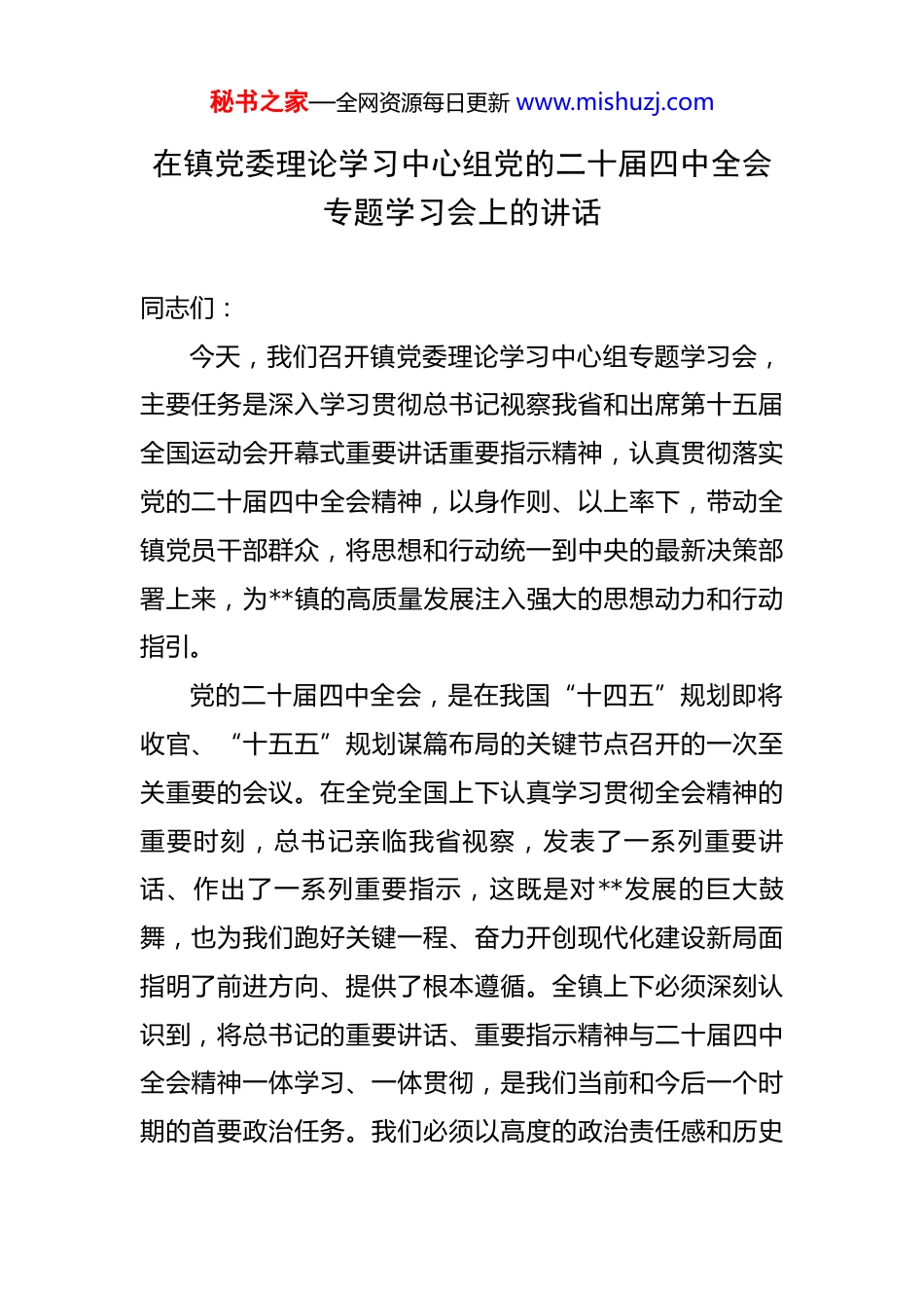 秘书之家—全网资源每日更新 www.mishuzj.com在镇党委理论学习中心组党的二十届四中全会专题学习会上的讲话 同志们:今天,我们召开镇党委理论学习中心组专题学习会,主要任务是深入学习贯彻总书记视察我省和出席第十五届全国运动会开幕式重要讲话重要指示精神,认真贯彻落实党的二十届四中全会精神,以身作则、以上率下,带动全镇党员干部群众,将思想和行动统一到中央的最新决策部署上来,为**镇的高质量发展注入强大的思想动力和行动指引。党的二十届四中全会,是在我国“十四五”规划即将收官、“十五五”规划谋篇布局的关键节点召开的一次至关重要的会议。在全党全国上下认真学习贯彻全会精神的重要时刻,总书记亲临我省视察,发表了一系列重要讲话、作出了一系列重要指示,这既是对**发展的巨大鼓舞,也为我们跑好关键一程、奋力开创现代化建设新局面指明了前进方向、提供了根本遵循。全镇上下必须深刻认识到,将总书记的重要讲话、重要指示精神与二十届四中全会精神一体学习、一体贯彻,是我们当前和今后一个时期的首要政治任务。我们必须以高度的政治责任感和历史秘书之家—全网资源每日更新 www.mishuzj.com使命感,坚定拥护“两个确立”、坚决做到“两个维护”,确保中央的决策部署在**镇落地生根、开花结果,用实实在在的行动和成效,交上一份无愧于时代、无愧于人民的满意答卷。下面,我结合学习体会和**镇的工作实际,讲三点意见。一、提高政治站位,深刻领会核心要义,切实增强推动高质量发展的思想自觉和行动自觉总书记的重要讲话和党的二十届四中全会精神,思想深邃、内涵丰富,是我们认识世界、改造世界的强大思想武器。我们必须在深学细悟中把握其精神实质和核心要义,真正做到学思用贯通、知信行统一。第一,要深刻把握我们所处的历史方位与时代使命。党的二十届四中全会对“十五五”时期我国发展的指导原则、奋斗目标和战略部署作出了全面擘画。总书记的视察讲话,则结合**的实际,提出了新的更高要求。这要求我们必须清醒地认识到,**镇正处在一个前所未有的战略机遇期、转型升级的关键期和攻坚克难的窗口期。从宏观层面看,国家加快构建新发展格局,**地处国家战略交汇叠加的核心区域,拥有得天独厚的区位优势和政策红利。从市级层面看,市委、市政府正全力推动“科技创新+先进制秘书之家—全网资源每日更新 www.mishuzj.com造”深度融合,**作为全市制造业重镇,理应在服务全市发展大局中展现更大作为。我们必须胸怀“国之大者”,跳出**看**,将自身发展置于全国、全省、全市的大棋局中去谋划和推进,切实增强服务大局的自觉性和主动性,努力为**市在全省经济大市中勇挑大梁作出我们应有的贡献。第二,要深刻把握高质量发展的内在要求与实践路径。高质量发展是新时代的硬道理。总书记强调,要坚持实体经济为本、制造业当家。对于**镇而言,我们的根基在制造业,优势在制造业,未来也在制造业。回顾“十四五”以来的发展历程,我们始终坚持制造业立镇不动摇。2024 年,我镇实现地区生产总值 192.75 亿元,增速位居全市前列;今年前三季度,经济继续保持良好增势,地区生产总值达到 150.59 亿元,同比增长 8.7%。这些成绩的取得,正是我们坚持制造业当家、狠抓实体经济的结果。面向未来,我们必须更加坚定地走高质量发展之路。要以科技创新引领产业创新,加快形成新质生产力。这不仅是遵循经济发展规律的必然选择,更是我们破解发展瓶颈、塑造竞争新优势的唯一出路。全镇各级领导干部要完整、准确、全面贯彻新发展理念,坚决摒弃粗放式增长的老路,把发展的着力点放在提升质量和效益上。秘书之家—全网资源每日更新 www.mishuzj.com第三,要深刻把握以人民为中心的发展思想与根本立场。总书记反复强调,“江山就是人民,人民就是江山”。我们一切工作的出发点和落脚点,都是为了让人民群众过上更美好的生活。学习贯彻总书记重要讲话精神,最终要体现在增进民生福祉的实际成效上。近年来,我们持续加大民生投入,在教育、医疗、环境、文化等方面办成了一批好事实事,“百千万工程”推动城乡面貌焕然一新,群众的获得感、幸福感、安全感不断增强。...