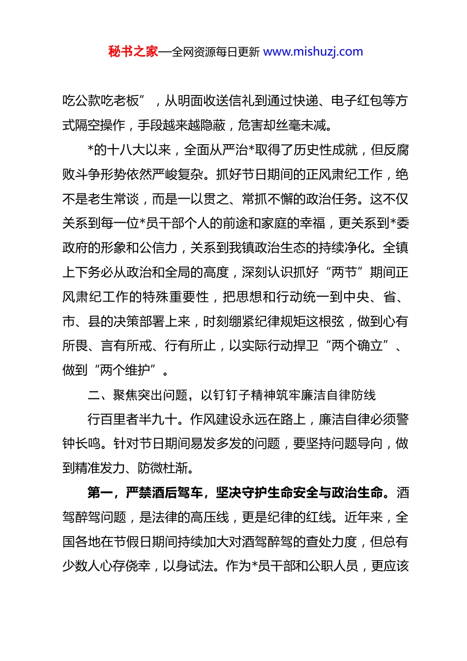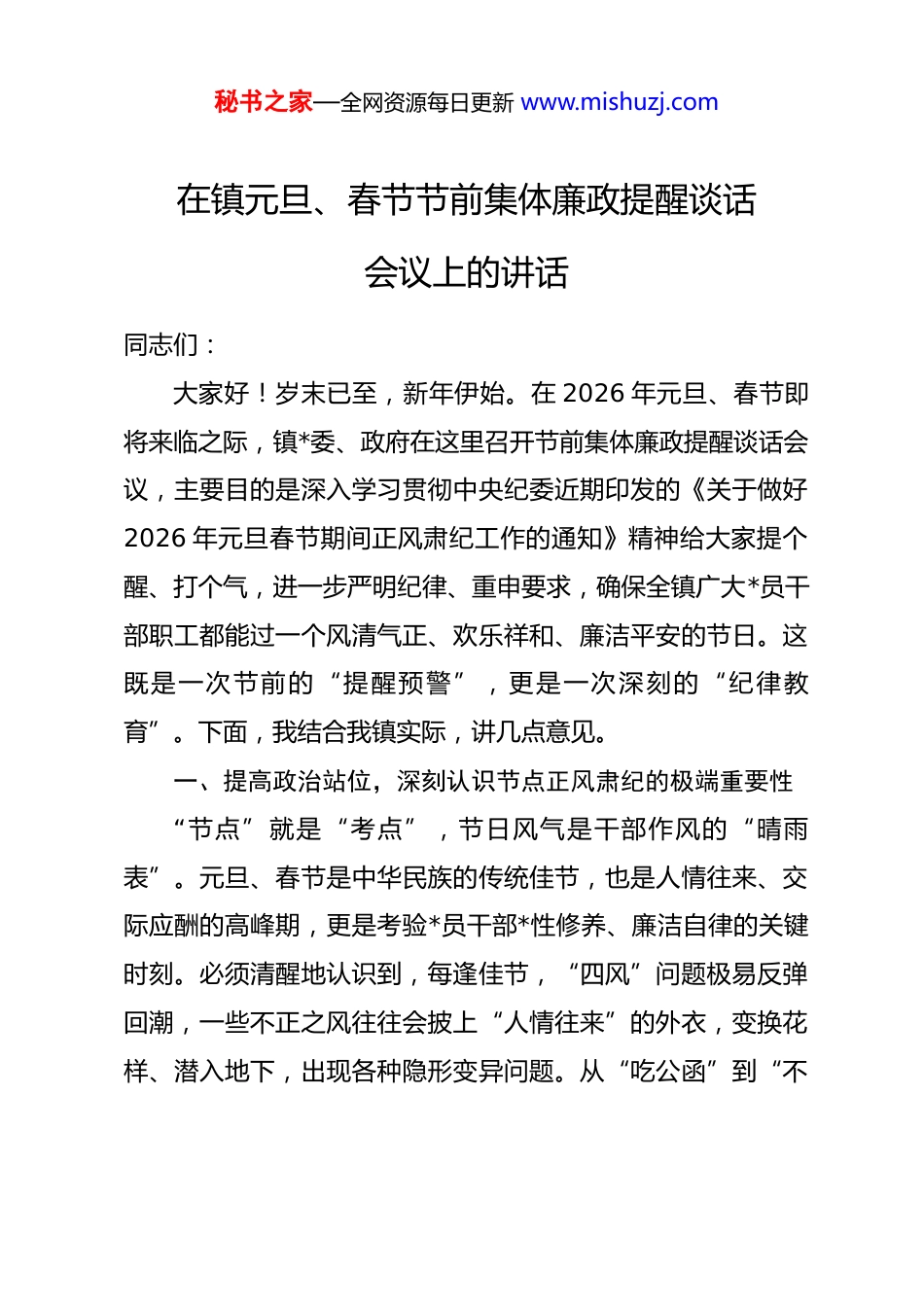 秘书之家—全网资源每日更新 www.mishuzj.com在镇元旦、春节节前集体廉政提醒谈话会议上的讲话同志们: 大家好!岁末已至,新年伊始。在 2026 年元旦、春节即将来临之际,镇*委、政府在这里召开节前集体廉政提醒谈话会议,主要目的是深入学习贯彻中央纪委近期印发的《关于做好2026 年元旦春节期间正风肃纪工作的通知》精神给大家提个醒、打个气,进一步严明纪律、重申要求,确保全镇广大*员干部职工都能过一个风清气正、欢乐祥和、廉洁平安的节日。这既是一次节前的“提醒预警”,更是一次深刻的“纪律教育”。下面,我结合我镇实际,讲几点意见。一、提高政治站位,深刻认识节点正风肃纪的极端重要性“节点”就是“考点”,节日风气是干部作风的“晴雨表”。元旦、春节是中华民族的传统佳节,也是人情往来、交际应酬的高峰期,更是考验*员干部*性修养、廉洁自律的关键时刻。必须清醒地认识到,每逢佳节,“四风”问题极易反弹回潮,一些不正之风往往会披上“人情往来”的外衣,变换花样、潜入地下,出现各种隐形变异问题。从“吃公函”到“不秘书之家—全网资源每日更新 www.mishuzj.com吃公款吃老板”,从明面收送信礼到通过快递、电子红包等方式隔空操作,手段越来越隐蔽,危害却丝毫未减。*的十八大以来,全面从严治*取得了历史性成就,但反腐败斗争形势依然严峻复杂。抓好节日期间的正风肃纪工作,绝不是老生常谈,而是一以贯之、常抓不懈的政治任务。这不仅关系到每一位*员干部个人的前途和家庭的幸福,更关系到*委政府的形象和公信力,关系到我镇政治生态的持续净化。全镇上下务必从政治和全局的高度,深刻认识抓好“两节”期间正风肃纪工作的特殊重要性,把思想和行动统一到中央、省、市、县的决策部署上来,时刻绷紧纪律规矩这根弦,做到心有所畏、言有所戒、行有所止,以实际行动捍卫“两个确立”、做到“两个维护”。二、聚焦突出问题,以钉钉子精神筑牢廉洁自律防线行百里者半九十。作风建设永远在路上,廉洁自律必须警钟长鸣。针对节日期间易发多发的问题,要坚持问题导向,做到精准发力、防微杜渐。第一,严禁酒后驾车,坚决守护生命安全与政治生命。酒驾醉驾问题,是法律的高压线,更是纪律的红线。近年来,全国各地在节假日期间持续加大对酒驾醉驾的查处力度,但总有少数人心存侥幸,以身试法。作为*员干部和公职人员,更应该秘书之家—全网资源每日更新 www.mishuzj.com成为遵纪守法的模范。酒杯一端,纪法皆忘,代价是惨痛的。“喝酒不开车,开车不喝酒”不仅是一句交通安全口号,更是一条必须恪守的政治纪律。一旦触碰,不仅要受到法律的严惩,更会受到 dj 政务的严肃处理,政治生涯将戛然而止。各部门、各村(社区)要加强对干部职工的教育管理,不仅要管好工作上的“八小时”,也要管住生活中的“八小时外”,确保我镇不发生一起*员干部酒驾醉驾问题。第二,严守纪律规矩,杜绝节日期间的“四风”问题。要严格执行中央八项规定及其实施细则精神,坚决杜绝“节日腐败”。要做到“十个严禁”:严禁违规收送名贵特产和礼品礼金,包括电子红包、购物卡、有价证券等;严禁违规接受管理和服务对象以及其他与行使职权有关系的单位或个人的宴请、旅游、娱乐等活动安排;严禁违规发放津贴、补贴、奖金和实物;严禁公车私用、私车公养或违规租借车辆;严禁公款旅游或变相公款旅游;严禁违规出入私人会所或带有私人会所性质的场所;严禁大操大办婚丧喜庆事宜或借机敛财;严禁组织或参与任何形式的赌博活动;严禁年底突击花钱,严防巧立名目滥发钱物;严禁在工作中搞形式主义、官僚主义,随意向基层派任务、要材料、滥用新媒体工作群组,切实为基层减轻负担。对顶风违纪行为,镇纪委将坚持“零容忍”态度,发现一秘书之家—全网资源每日更新 www.mishuzj.com起、查处一起、通报一起,绝不姑息。第三,严抓安全生产,确保社会大局和谐稳定。安全是发展的前提,稳定是和谐的基石。越是节假日,安全生产这根弦越要绷得紧而又紧。各分管领导、各部门和村(社区)要严格落实“*政同责、一岗双责、齐抓共管、失职追责”和“三管三必须”的要求,压紧压实安全生产责任...