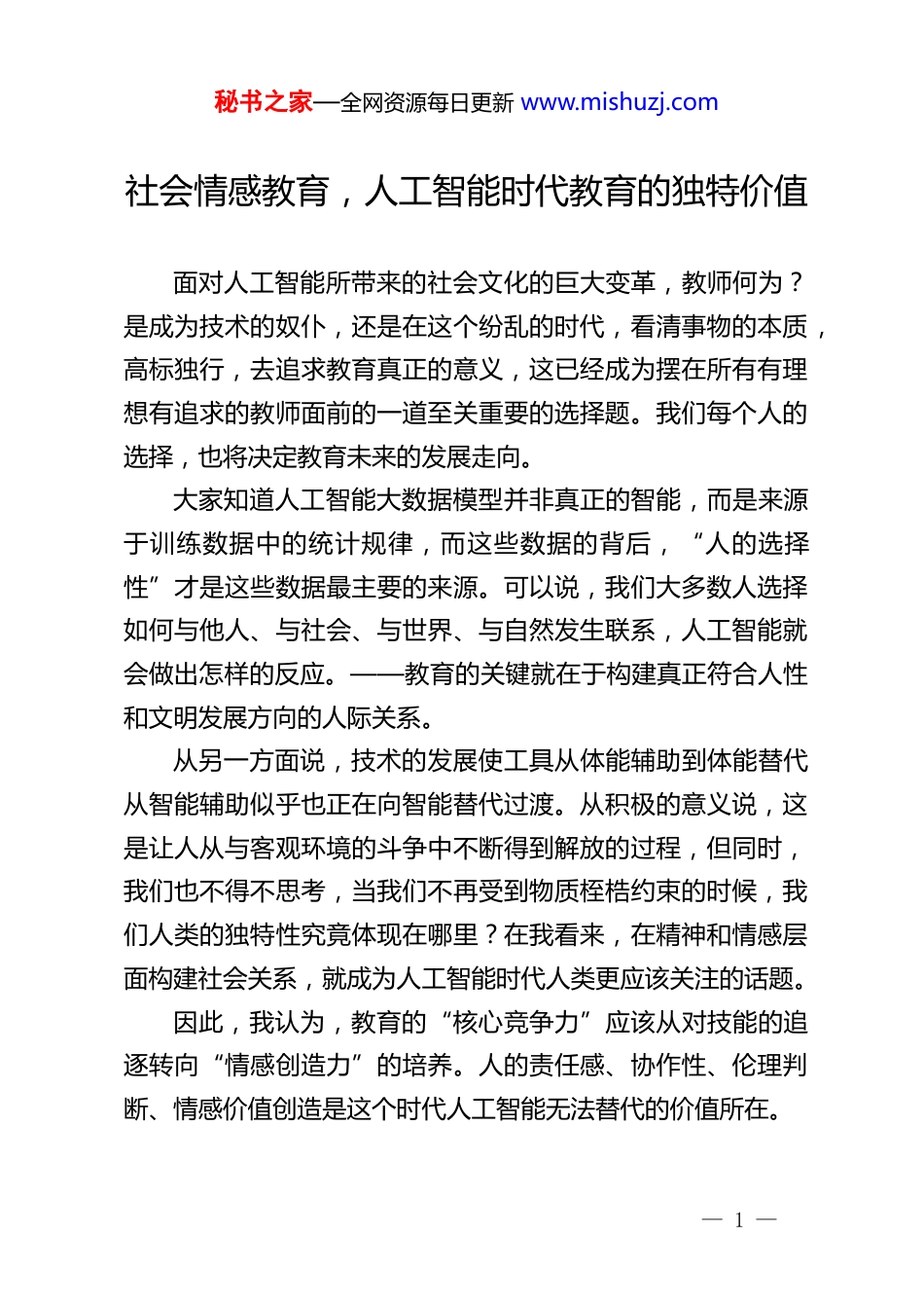 秘书之家—全网资源每日更新 www.mishuzj.com社会情感教育,人工智能时代教育的独特价值面对人工智能所带来的社会文化的巨大变革,教师何为?是成为技术的奴仆,还是在这个纷乱的时代,看清事物的本质,高标独行,去追求教育真正的意义,这已经成为摆在所有有理想有追求的教师面前的一道至关重要的选择题。我们每个人的选择,也将决定教育未来的发展走向。大家知道人工智能大数据模型并非真正的智能,而是来源于训练数据中的统计规律,而这些数据的背后,“人的选择性”才是这些数据最主要的来源。可以说,我们大多数人选择如何与他人、与社会、与世界、与自然发生联系,人工智能就会做出怎样的反应。——教育的关键就在于构建真正符合人性和文明发展方向的人际关系。从另一方面说,技术的发展使工具从体能辅助到体能替代从智能辅助似乎也正在向智能替代过渡。从积极的意义说,这是让人从与客观环境的斗争中不断得到解放的过程,但同时,我们也不得不思考,当我们不再受到物质桎梏约束的时候,我们人类的独特性究竟体现在哪里?在我看来,在精神和情感层面构建社会关系,就成为人工智能时代人类更应该关注的话题。因此,我认为,教育的“核心竞争力”应该从对技能的追逐转向“情感创造力”的培养。人的责任感、协作性、伦理判断、情感价值创造是这个时代人工智能无法替代的价值所在。— 1 —秘书之家—全网资源每日更新 www.mishuzj.com回到现实,我们可以发现,我们这个时代既是技术高度发展的时代,同时也是社会情感教育不断下行的时代。历史上,我们曾经建立了基于家庭伦理基础的同心圆式的社会情感关系,并通过宗法制度和科举考试让这种社会情感成为社会共识。但随着社会民主化进程的发展,主体意识代替了家族意识,传统的社会连接被打破了,日益原子化的存在,让现代人陷入置身现代技术构建的人际荒漠的危险。因此,教育在今天的作用已不仅仅是传承,更应该积极构建“以个体为中心,以联结为支撑”的新型情感生态。这种联结其实包含了两层联结,一层是技术性联结,一层是人文性联结。之所以要强调以个体为中心,就是希望能够彰显人的主体性,避免处于“节点化生存”的状态。在这样的背景下,我以为学校教师不能再随俗为变,而应该更具独立思考的责任意识和价值追求,以教育之力构建符合人工智能时代的社会情感关系。首先是在教育内容上,教师应该积极促进教育教学变革真正地发生。要避免人的“节点化生存”,就必须让学习的内容与每个人的生命体验建立真实的联系,触发最真实的感受。我们现在强调情境,强调像科学家一样思考,其目的就在于唤起学生真切的生命感受。将情感联结看作教学中最重要的内容。在教学方法上,要用体验活动来替代单向灌输,在与人交往中,在倾听与表达中,在分析研判中,不断激活人与人之间— 2 —秘书之家—全网资源每日更新 www.mishuzj.com的情感共鸣。积累社会连接的经验。我们的教师本身也应该在日常教学过程中,以充满情感的言行,春风化雨,成为学生社会化情感认知最好的现实榜样。从学生培养的角度看,会共情,就是学会设身处地去思考问题,体会情感;能沟通,就是在共情的基础上,善于选择合适的方式进行交流以达到共同的目标。善联结,就是能从人情人性的角度去构建人与人之间,人与社会,人与自然之间的人文联系。同时我们也要关注那些社会情感认知薄弱的学生,为他们提供安全的心理氛围与环境,帮助他们去对抗因为过于依赖技术连接而产生的原子化生存的危险。当然更重要的是,学校应该提供更丰富的人与人之间的交往场景,去培养社会交往的经验,形成在人工智能时代关于“集体”的认知与归属感。事实上社会情感认知的培养,一定是家庭、学校和社会三位一体的。对家庭,赋能家长“情感教育能力”,重建家庭情感支持。对学生,不仅要在学校创建丰富的社会交往场景,更应该引导学生走进社会,在积极参与社会实践中建立更丰富多元的社会情感联结。同时,我们还应该积极推动社区成为情感友好社区,用师生的积极行动,去重建良好的社会情感联结,不断扩大学校在— 3 —秘书之家—全网资源每日更新 www.mishuzj.com社会情感联结中的辐射...