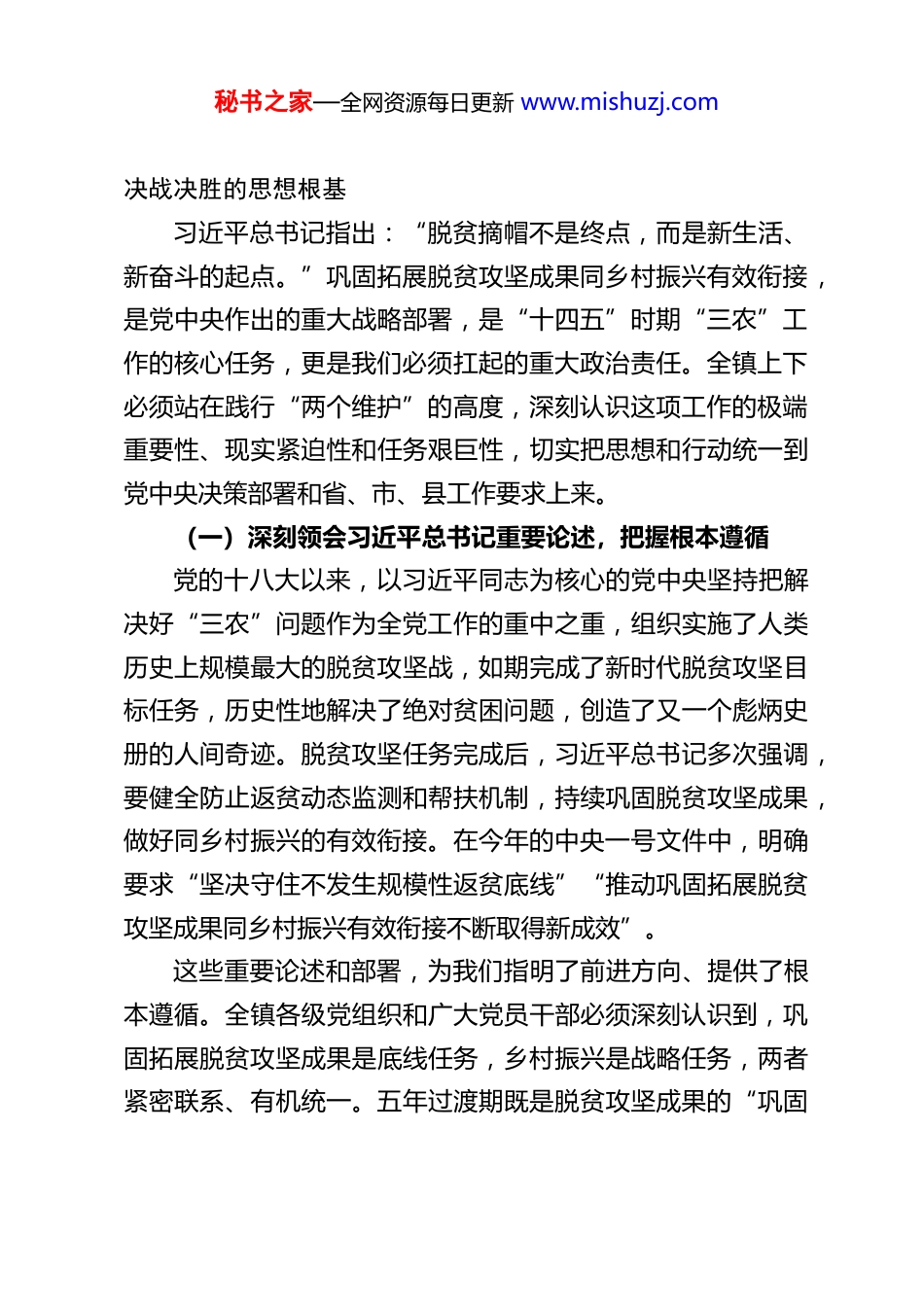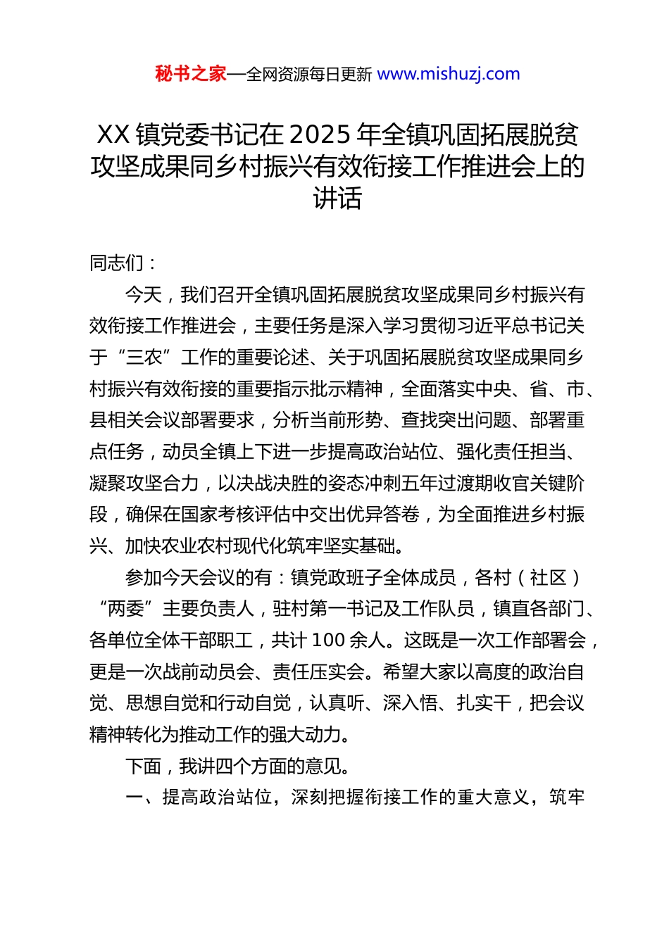 秘书之家—全网资源每日更新 www.mishuzj.comXX 镇党委书记在 2025 年全镇巩固拓展脱贫攻坚成果同乡村振兴有效衔接工作推进会上的讲话同志们:今天,我们召开全镇巩固拓展脱贫攻坚成果同乡村振兴有效衔接工作推进会,主要任务是深入学习贯彻习近平总书记关于“三农”工作的重要论述、关于巩固拓展脱贫攻坚成果同乡村振兴有效衔接的重要指示批示精神,全面落实中央、省、市、县相关会议部署要求,分析当前形势、查找突出问题、部署重点任务,动员全镇上下进一步提高政治站位、强化责任担当、凝聚攻坚合力,以决战决胜的姿态冲刺五年过渡期收官关键阶段,确保在国家考核评估中交出优异答卷,为全面推进乡村振兴、加快农业农村现代化筑牢坚实基础。参加今天会议的有:镇党政班子全体成员,各村(社区)“两委”主要负责人,驻村第一书记及工作队员,镇直各部门、各单位全体干部职工,共计 100 余人。这既是一次工作部署会,更是一次战前动员会、责任压实会。希望大家以高度的政治自觉、思想自觉和行动自觉,认真听、深入悟、扎实干,把会议精神转化为推动工作的强大动力。下面,我讲四个方面的意见。一、提高政治站位,深刻把握衔接工作的重大意义,筑牢秘书之家—全网资源每日更新 www.mishuzj.com决战决胜的思想根基习近平总书记指出:“脱贫摘帽不是终点,而是新生活、新奋斗的起点。”巩固拓展脱贫攻坚成果同乡村振兴有效衔接,是党中央作出的重大战略部署,是“十四五”时期“三农”工作的核心任务,更是我们必须扛起的重大政治责任。全镇上下必须站在践行“两个维护”的高度,深刻认识这项工作的极端重要性、现实紧迫性和任务艰巨性,切实把思想和行动统一到党中央决策部署和省、市、县工作要求上来。(一)深刻领会习近平总书记重要论述,把握根本遵循党的十八大以来,以习近平同志为核心的党中央坚持把解决好“三农”问题作为全党工作的重中之重,组织实施了人类历史上规模最大的脱贫攻坚战,如期完成了新时代脱贫攻坚目标任务,历史性地解决了绝对贫困问题,创造了又一个彪炳史册的人间奇迹。脱贫攻坚任务完成后,习近平总书记多次强调,要健全防止返贫动态监测和帮扶机制,持续巩固脱贫攻坚成果,做好同乡村振兴的有效衔接。在今年的中央一号文件中,明确要求“坚决守住不发生规模性返贫底线”“推动巩固拓展脱贫攻坚成果同乡村振兴有效衔接不断取得新成效”。这些重要论述和部署,为我们指明了前进方向、提供了根本遵循。全镇各级党组织和广大党员干部必须深刻认识到,巩固拓展脱贫攻坚成果是底线任务,乡村振兴是战略任务,两者紧密联系、有机统一。五年过渡期既是脱贫攻坚成果的“巩固秘书之家—全网资源每日更新 www.mishuzj.com期”,也是乡村振兴的“起步期”,现在我们正处在这个过渡期的收官决胜关键阶段,稍有松懈就可能出现返贫致贫风险,就可能影响乡村振兴的整体进程。我们必须始终把这项工作作为“国之大者”来抓,以“时时放心不下”的责任感和“事事落实到位”的执行力,坚决守住不发生规模性返贫的底线,推动乡村振兴各项工作再上新台阶。(二)清醒认识当前严峻形势,增强紧迫感责任感同志们,过去几年,在全镇上下的共同努力下,我们顺利完成了脱贫攻坚目标任务,全镇 XX 户 XX 名建档立卡贫困人口全部脱贫,XX 个贫困村全部出列,脱贫攻坚成果得到初步巩固,衔接工作取得了阶段性成效。在防止返贫动态监测方面,我们建立了“农户自主申报、村社排查预警、部门数据共享、镇级核实研判”的四级监测机制,累计识别监测对象 XX 户 XX 人,全 部 落 实 了 针 对 性 帮 扶 措 施 ; 在 产 业 发 展 方 面 , 培 育 了XX、XX 等特色产业,建成产业基地 XX 亩,带动脱贫户和监测户 XX 户增收;在就业帮扶方面,开展技能培训 XX 场次,帮助 XX 名脱贫劳动力实现稳定就业;在基础设施和公共服务方面,新建和改造农村道路 XX 公里,完成安全饮水工程 XX 处,改善了 XX 所学校和 XX 所卫生室的硬件条件,群众的获得感、幸福感、安全感持续提升。在肯定成绩的同时,我们更要清醒地看到,当前我们面临的形势...
