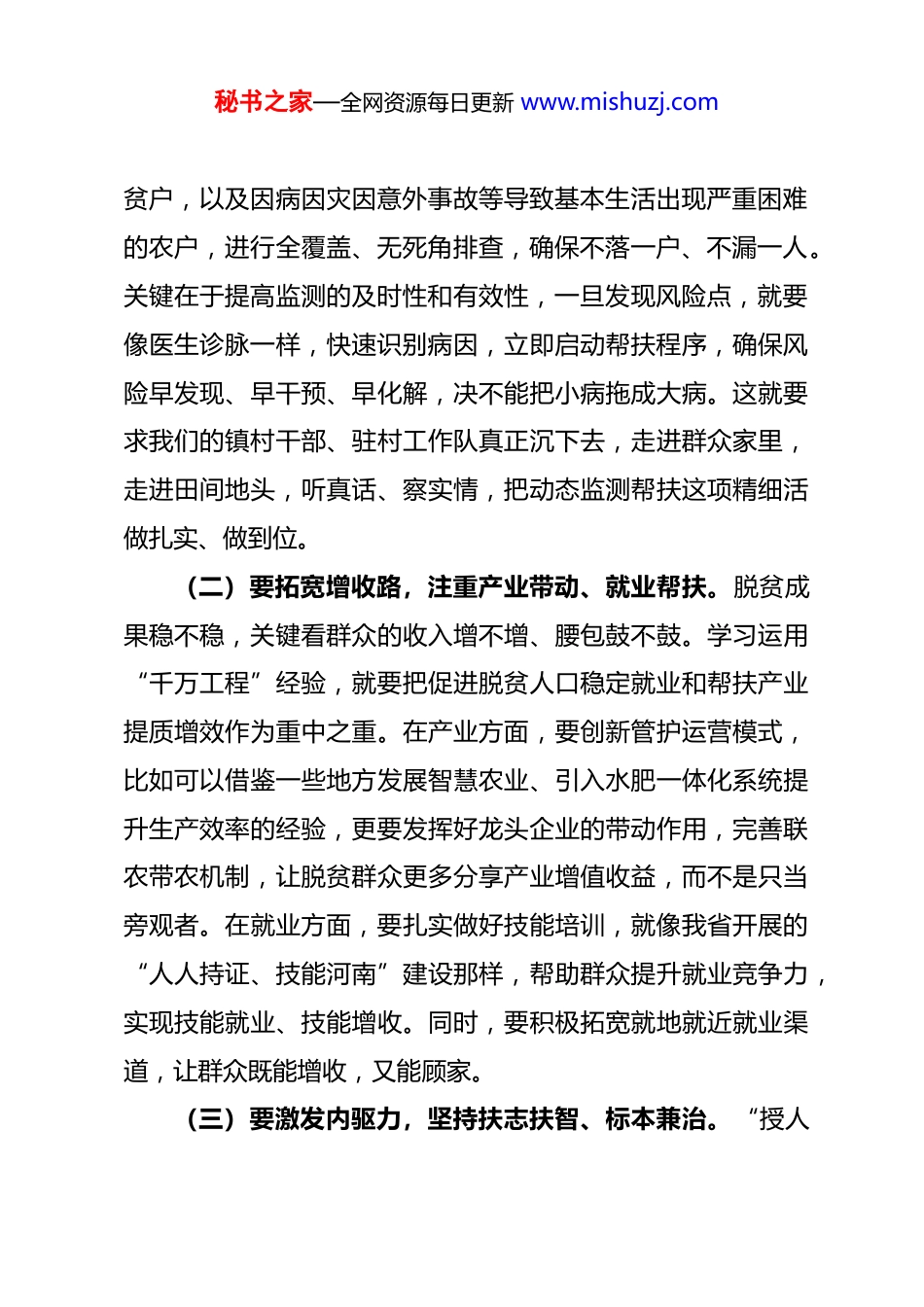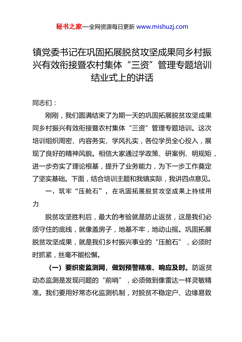 秘书之家—全网资源每日更新 www.mishuzj.com镇党委书记在巩固拓展脱贫攻坚成果同乡村振兴有效衔接暨农村集体“三资”管理专题培训结业式上的讲话同志们:刚刚,我们圆满结束了为期一天的巩固拓展脱贫攻坚成果同乡村振兴有效衔接暨农村集体“三资”管理专题培训。这次培训组织周密、内容务实、学风扎实,各位学员全心投入,展现了良好的精神风貌。相信大家通过学政策、研案例、明规矩,进一步夯实了理论根基,提升了业务能力,为下一步工作奠定了坚实基础。下面,结合培训主题和我镇实际,我讲四点意见。一、筑牢“压舱石”,在巩固拓展脱贫攻坚成果上持续用力脱贫攻坚胜利后,最大的考验就是防止返贫,这是我们必须守住的底线,就像盖房子,地基不牢,地动山摇。巩固拓展脱贫攻坚成果,就是我们乡村振兴事业的“压舱石”,必须时时抓紧,丝毫不能松懈。(一)要织密监测网,做到预警精准、响应及时。防返贫动态监测是发现问题的“前哨”,必须做到像雷达一样灵敏精准。我们要用好常态化监测机制,对脱贫不稳定户、边缘易致秘书之家—全网资源每日更新 www.mishuzj.com贫户,以及因病因灾因意外事故等导致基本生活出现严重困难的农户,进行全覆盖、无死角排查,确保不落一户、不漏一人。关键在于提高监测的及时性和有效性,一旦发现风险点,就要像医生诊脉一样,快速识别病因,立即启动帮扶程序,确保风险早发现、早干预、早化解,决不能把小病拖成大病。这就要求我们的镇村干部、驻村工作队真正沉下去,走进群众家里,走进田间地头,听真话、察实情,把动态监测帮扶这项精细活做扎实、做到位。(二)要拓宽增收路,注重产业带动、就业帮扶。脱贫成果稳不稳,关键看群众的收入增不增、腰包鼓不鼓。学习运用“千万工程”经验,就要把促进脱贫人口稳定就业和帮扶产业提质增效作为重中之重。在产业方面,要创新管护运营模式,比如可以借鉴一些地方发展智慧农业、引入水肥一体化系统提升生产效率的经验,更要发挥好龙头企业的带动作用,完善联农带农机制,让脱贫群众更多分享产业增值收益,而不是只当旁观者。在就业方面,要扎实做好技能培训,就像我省开展的“人人持证、技能河南”建设那样,帮助群众提升就业竞争力,实现技能就业、技能增收。同时,要积极拓宽就地就近就业渠道,让群众既能增收,又能顾家。(三)要激发内驱力,坚持扶志扶智、标本兼治。“授人秘书之家—全网资源每日更新 www.mishuzj.com以鱼不如授人以渔”。巩固脱贫成果,外部帮扶重要,但激发群众内生动力才是根本之策。我们要探索建立健全奖励激励机制,引导群众克服“等靠要”思想。比如,可以借鉴一些地方设立“积分银行”,对积极参与乡村治理、公益劳动的村民给予奖励的做法,让“多劳多得”的价值导向深入人心。同时,要加强教育引导和技能培训,提升群众自我发展能力,帮助他们从“要我致富”转变为“我要致富”,真正变“输血”为“造血”,让脱贫基础更加稳固、成效更可持续。二、盘活“家底子”,在规范农村集体“三资”管理上精准发力农村集体资金、资产、资源是乡亲们共同的“家底”,管得好不好,直接关系到集体经济的发展和群众的切身利益。这个“家底子”管不好,就会造成集体资产流失,侵蚀党的执政根基。我们必须像管家一样,精打细算,管好用好每一分钱、每一份资产。(一)要摸清底数,做到家底明晰、账实相符。规范管理的前提是心中有数、手中有账。如果家底不清,管理就是一笔糊涂账。我们要严格按照“四议两公开”程序,对村集体的资金、资产、资源进行一次彻底的“大盘点”,建立清晰透明的台账,做到账账相符、账实相符、账物相符。可以参考海南屯秘书之家—全网资源每日更新 www.mishuzj.com昌县通过“机器管‘三资’”平台快速完成土地清查的经验,或者像郾城区那样,通过线上线下的方式,扎实开展清产核资,并将结果及时公示,接受群众监督,确保“家底”晒在阳光下。这是第一步,也是至关重要的一步,决不能走过场。(二)要健全制度,确保运行规范、监督有力。没有规矩,不成方圆。管好“三资”,必须扎紧制度的笼子。要严格落实“村财镇管”甚至“组财镇管”的要求,统一管理...